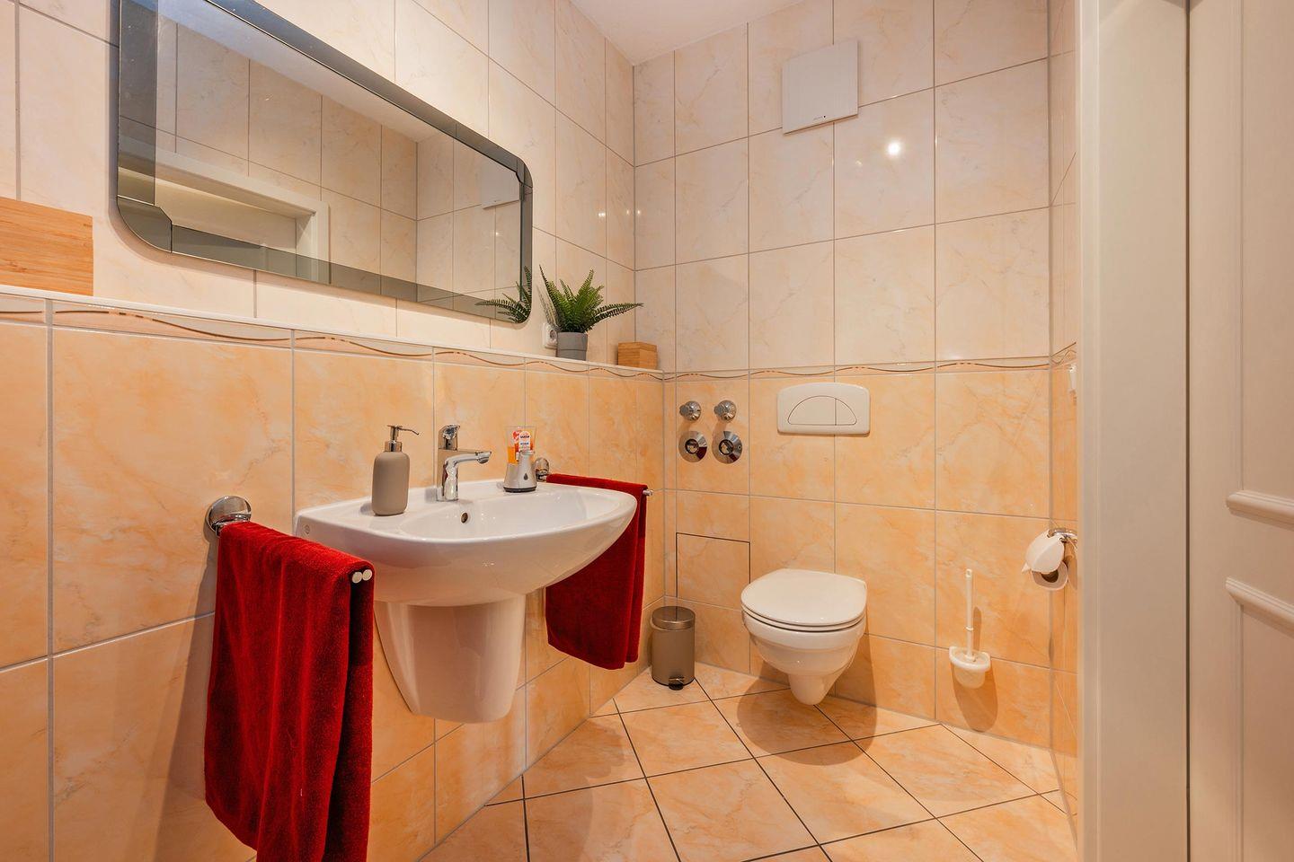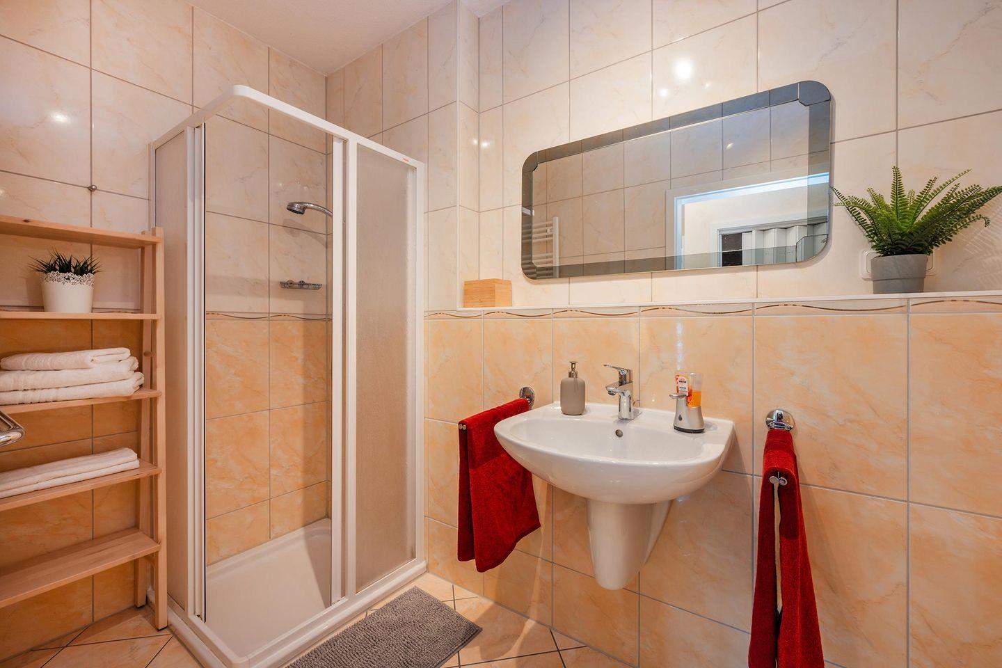 Das Badezimmer wurde in warmer Farbgebung hergerichtet und bietet Ihnen WC, Waschbecken, einen großen Badspiegel, eine Dusche und vielfältige Ablagemöglichkeiten. Eine Waschmaschine in der Wohnung bietet Ihnen höheren Komfort und ermöglicht auch längere Aufenthalte, ohne zu viele Kleidungsstücke mitbringen zu müssen.