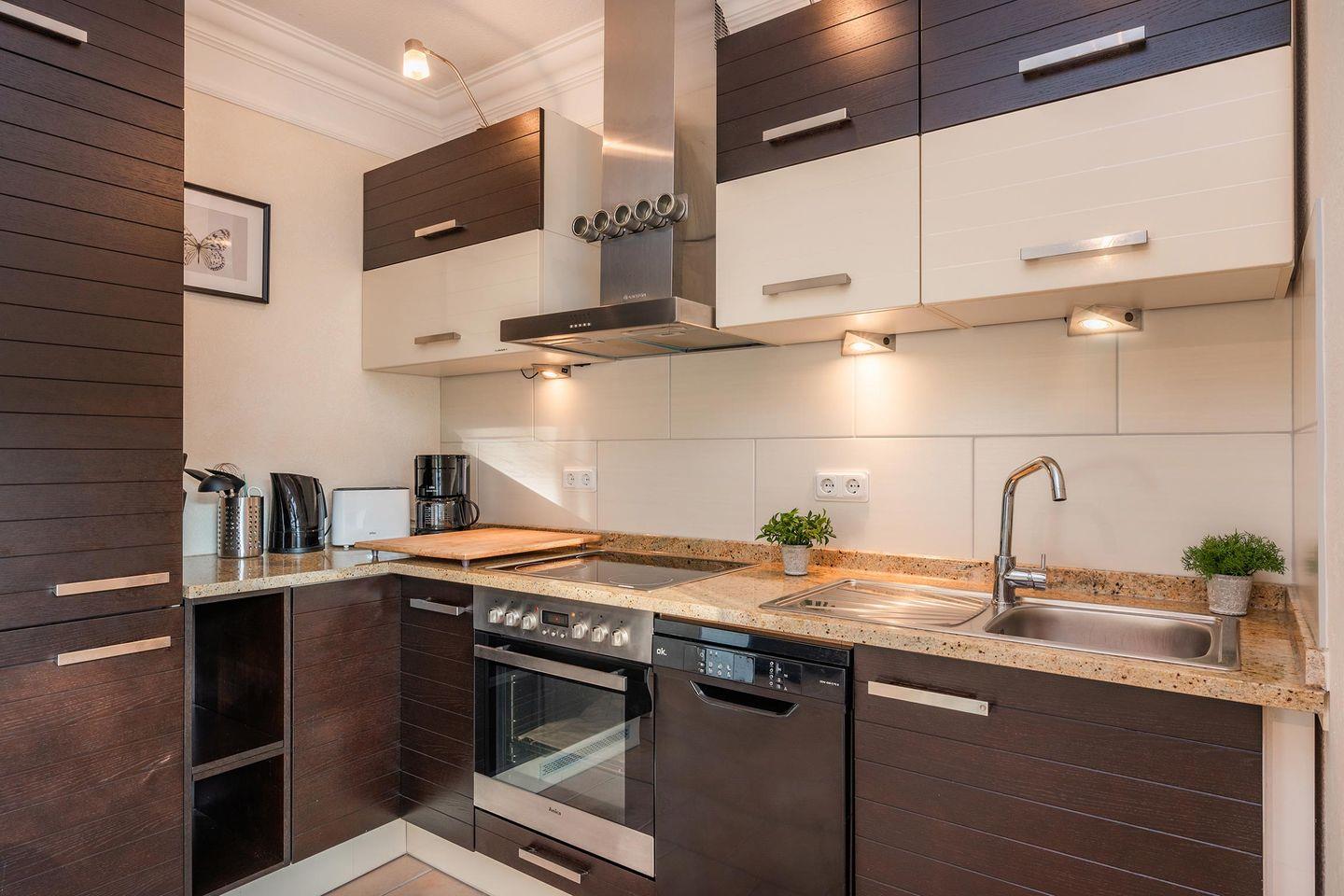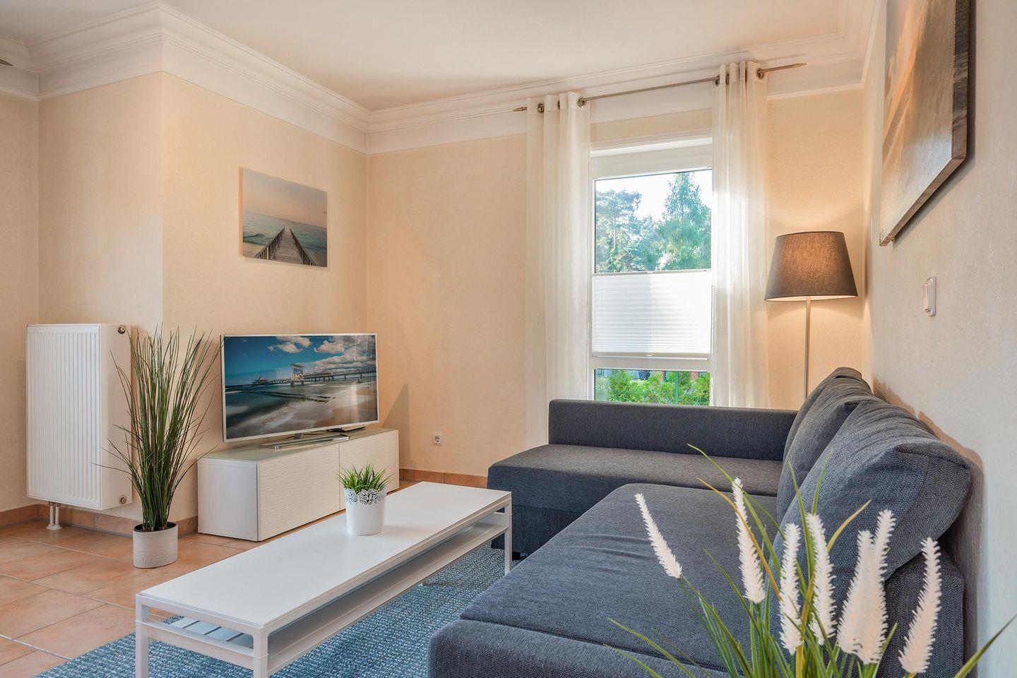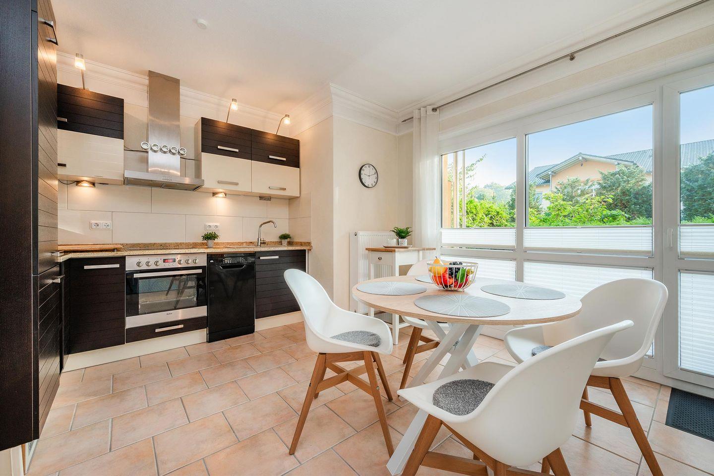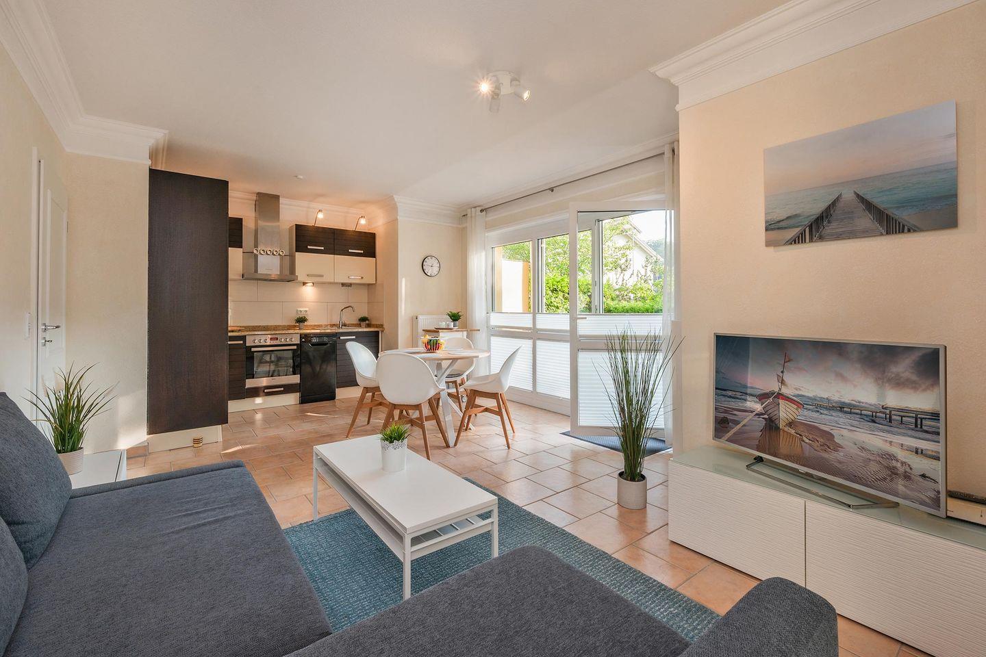 Der Wohnbereich teilt sich den Raum mit einer offenen Küche. Das bequeme Ecksofa mit Schlaffunktion und der große Flat-TV laden zu entspannten Filmeabenden ein. Ein runder Esstisch fügt sich galant in die Räumlichkeit ein. In der Küche ist es Ihnen, dank einer hochwertigen Grundausstattung, auch im Urlaub möglich gängige Gerichte problemlos zuzubereiten.