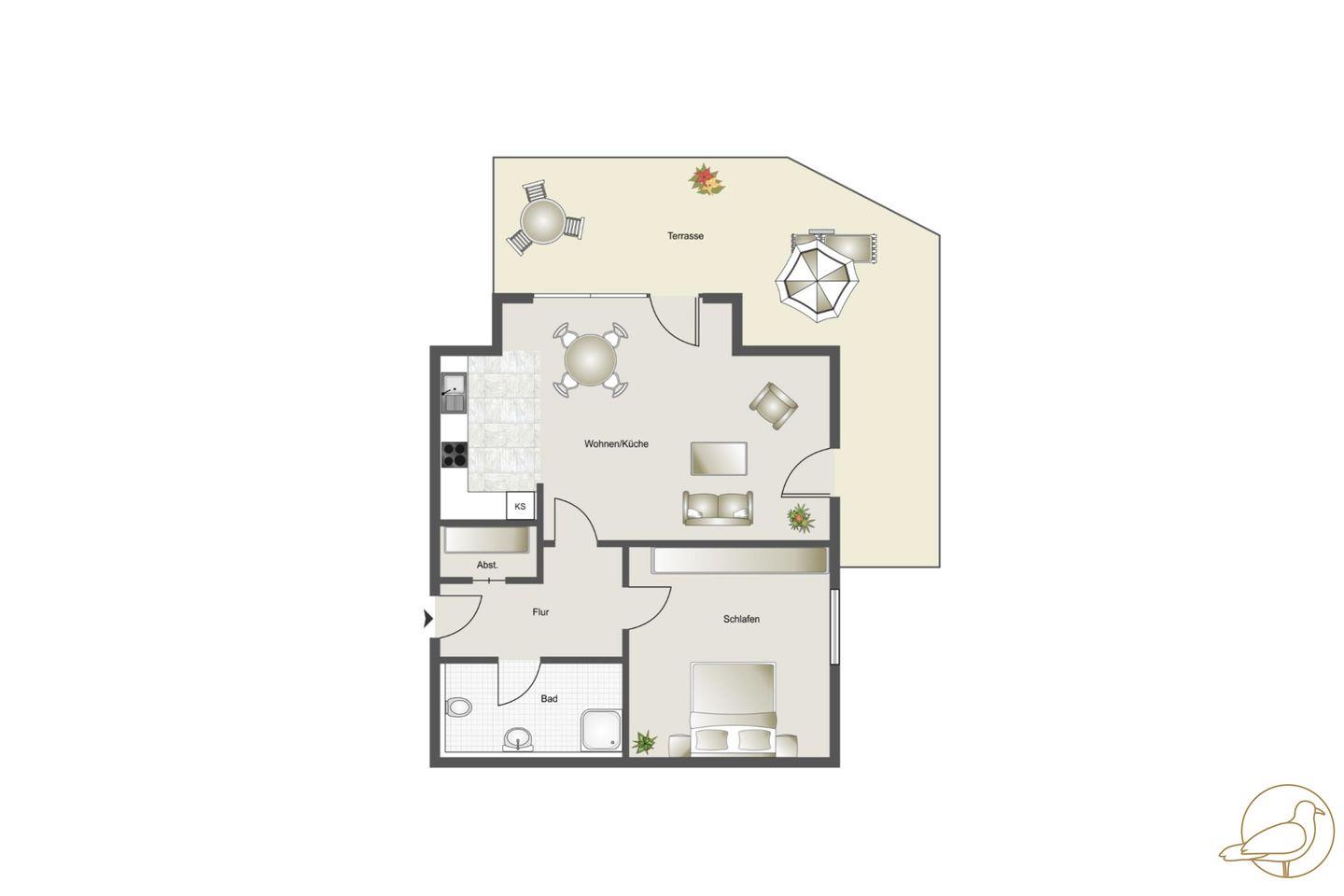 Die Wohnung befindet sich im Erdgeschoss des Hauses. Auf 48 Quadratmeter finden hier bis zu vier Personen ausreichend Platz. Die Wohnung besticht durch ihre liebevoll zusammengestellte Einrichtung im modernen Stil und der weitläufigen Terrasse als zusätzliches Highlight. Dank südlicher Ausrichtung, werden Sie hier zahlreiche Sonnenstunden erleben können. Sitzen Sie mit einem Glas Wein auf der gepolsterten Sitzecke gemütlich beisammen und genießen die Abendstunden oder frühstücken Sie mit der Familie an dem großen Gartentisch, die Entscheidung steht Ihnen frei.
