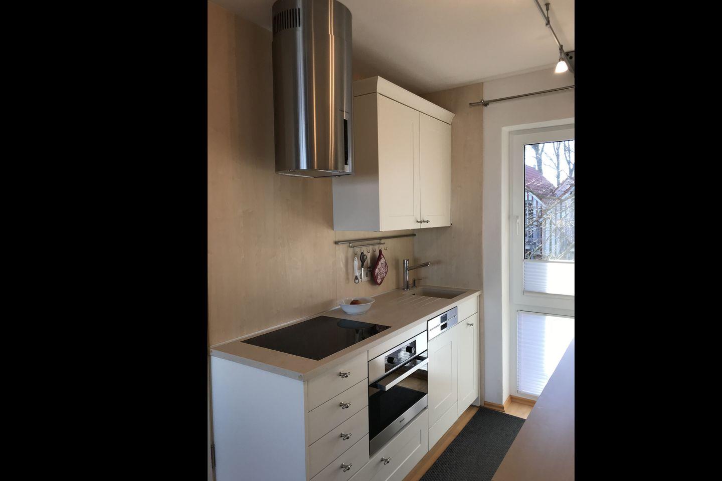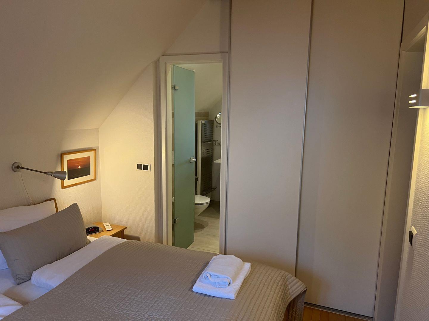 Ein Highlight der Wohnung ist der überdachte Balkon zur Seeseite, der zu jeder Tages und Jahreszeit zum Verweilen einlädt. Die hochwertige Ausstattung der Wohnung besticht durch einen Naturholzfußboden, der ein warmes und einladendes Ambiente schafft. Der großzügige Wohnbereich überzeugt mit einem Essplatz für vier Personen, ausgestattet mit stilvollen Loom-Sesseln. Ein gemütliches Ecksofa mit Recamiere vor dem charakteristischen Bullauge sowie zwei zusätzliche Sessel laden zu entspannten Stunden ein. Die freigelegten Sichtbalken, die sich bis in die Dachschrägen erstrecken, verleihen der Wohnung besonderen Charme. Die offene Küche bietet eine Vollausstattung und erfüllt alle Wünsche für anspruchsvolle Hobbyköche. Das moderne Duschbad ist ein Ort der Erholung: eine ebenerdige Dusche mit Ganzglasabtrennung, ein Einbauwaschtisch mit praktischem Stauraum und ein verschiebbarer Spiegel, der den Blick auf die Ostsee freigibt, machen den Raum besonders. Das komfortable Schlafzimmer ist mit einem gemütlichen Doppelbett und einem eigenen Fernseher ausgestattet – ideal für entspannte Nächte und morgendliches Wohlfühlen.
