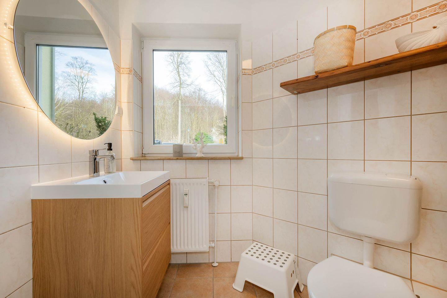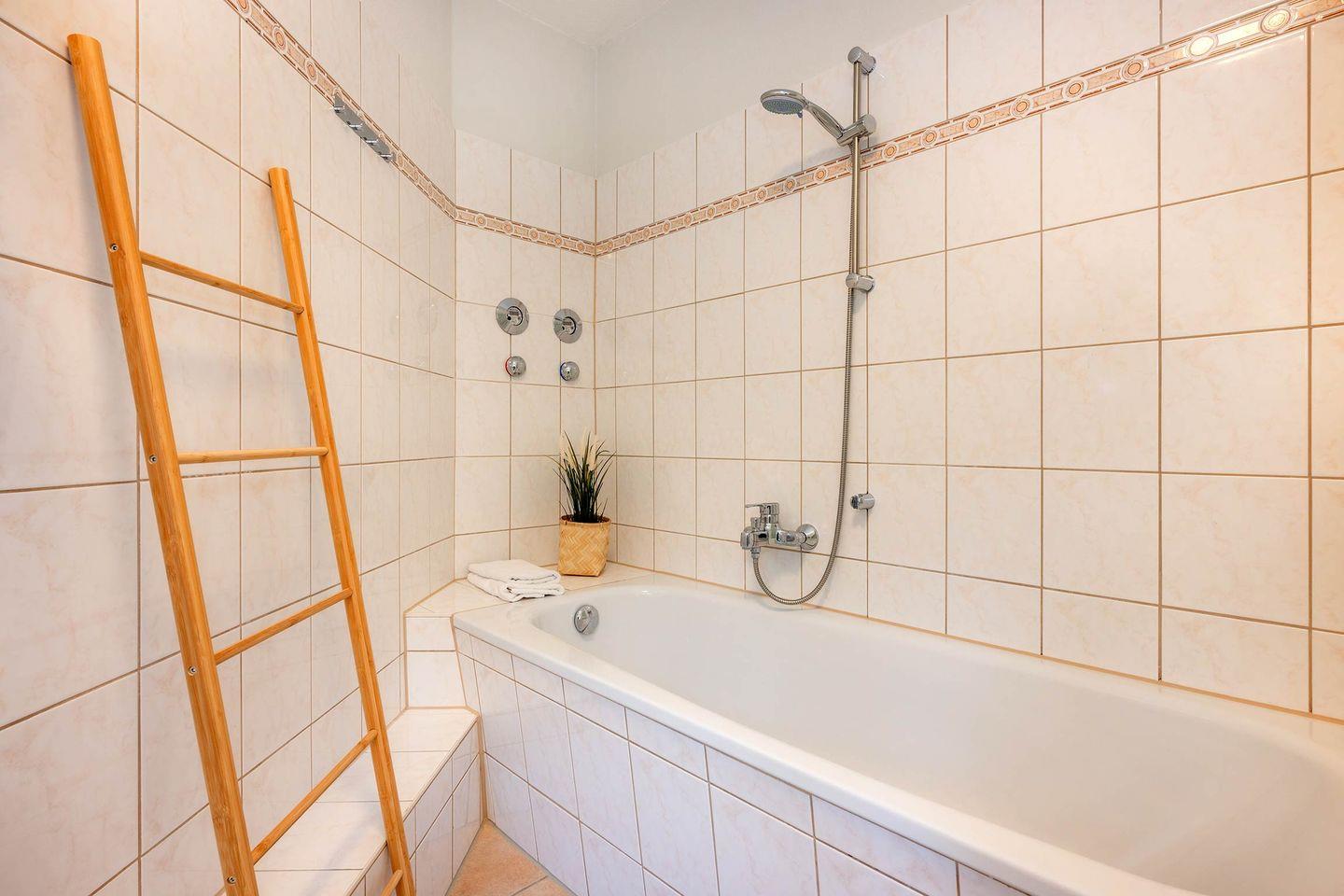 Weiterhin befindet sich in der Wohnung ein helles Badezimmer mit Tageslicht, das über Waschbecken, WC und eine Badewanne verfügt. Für den besonderen Komfort ist die Wohnung mit einem Gäste-WC ausgestattet.