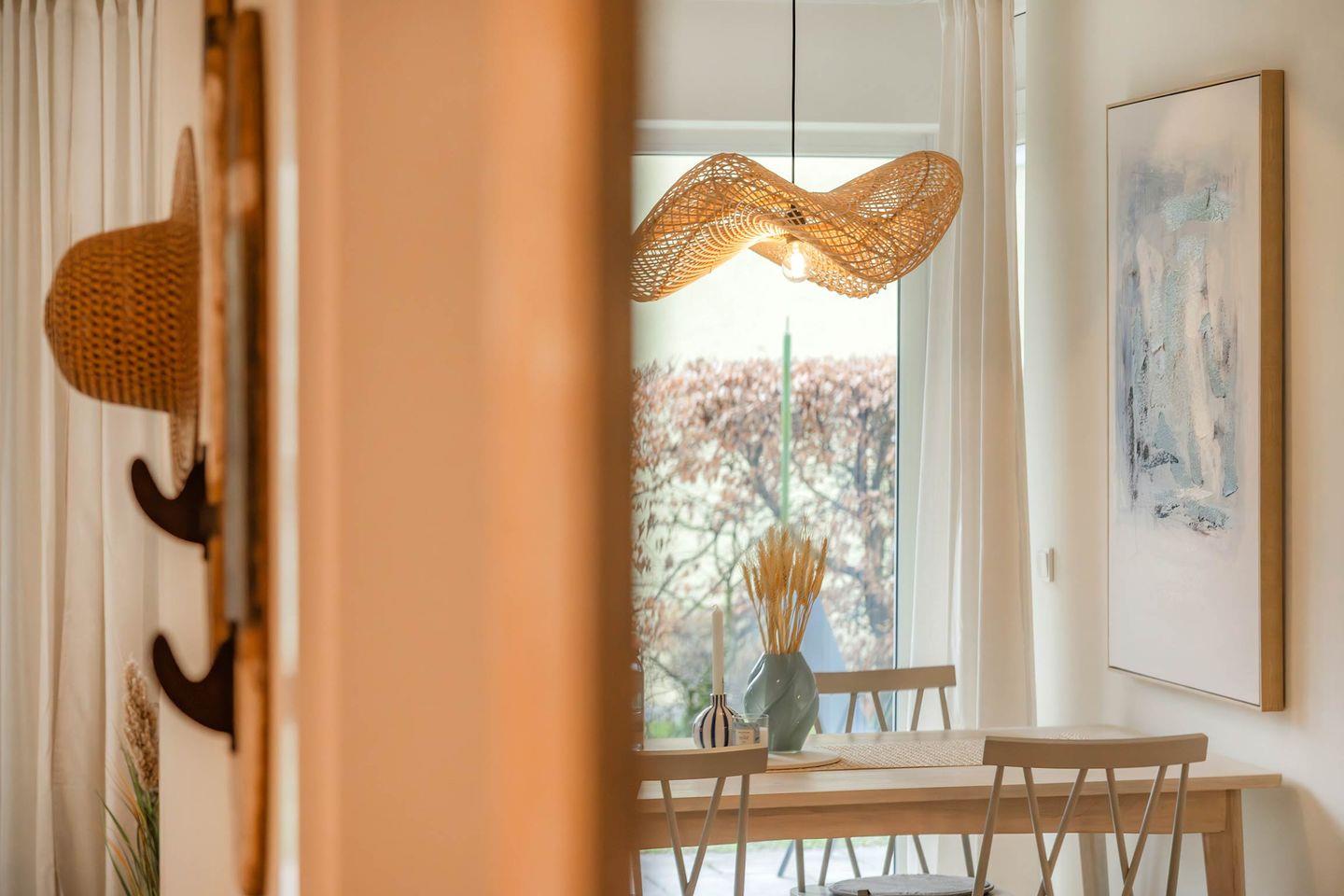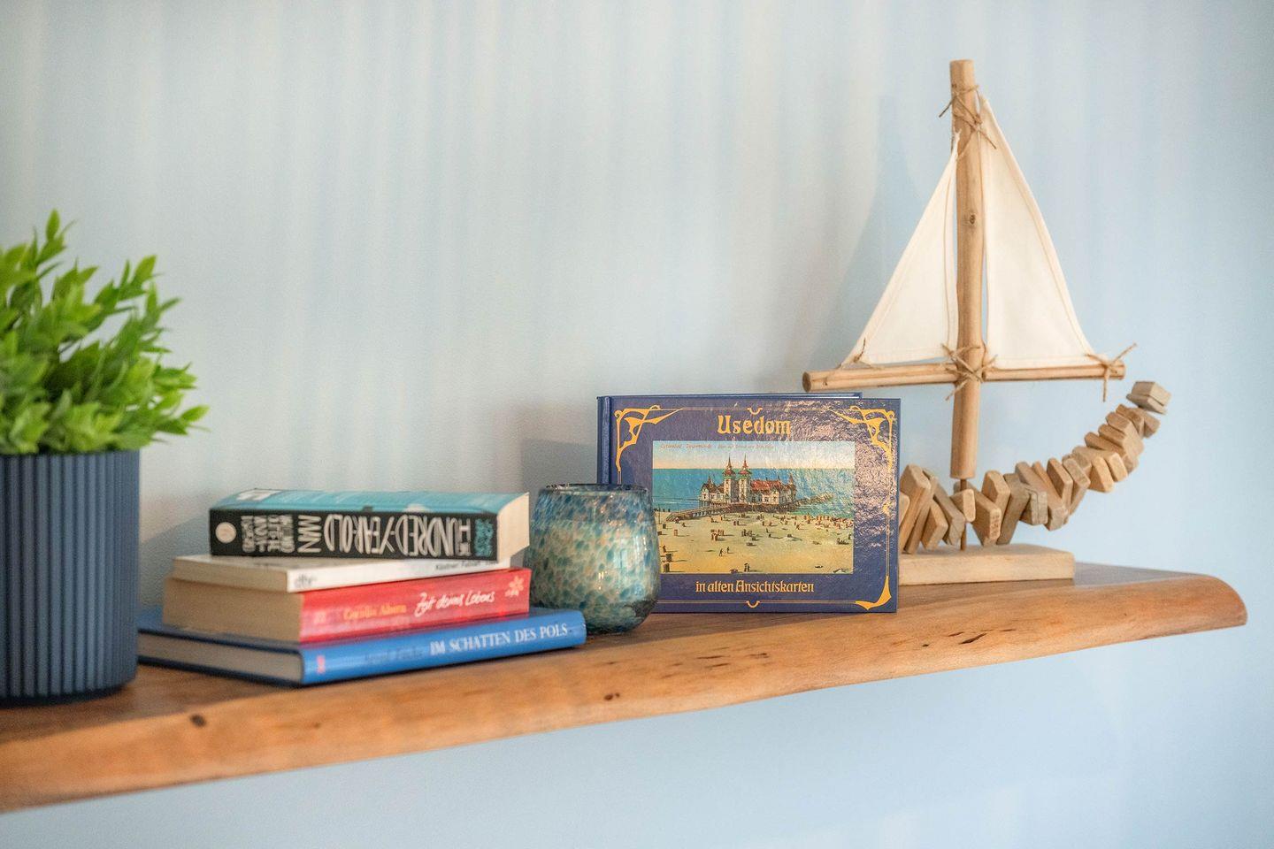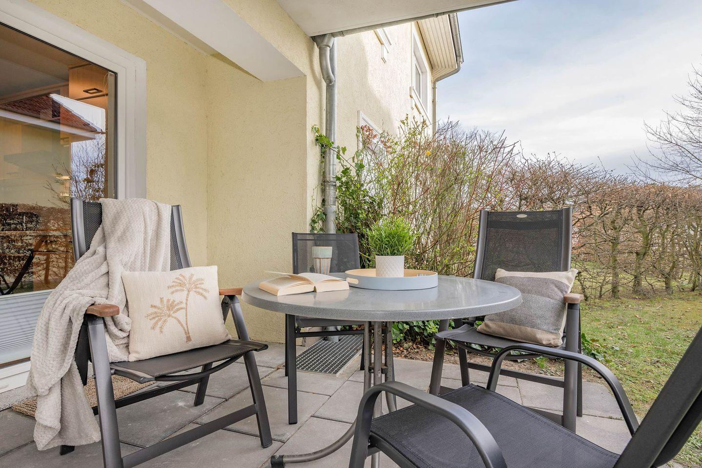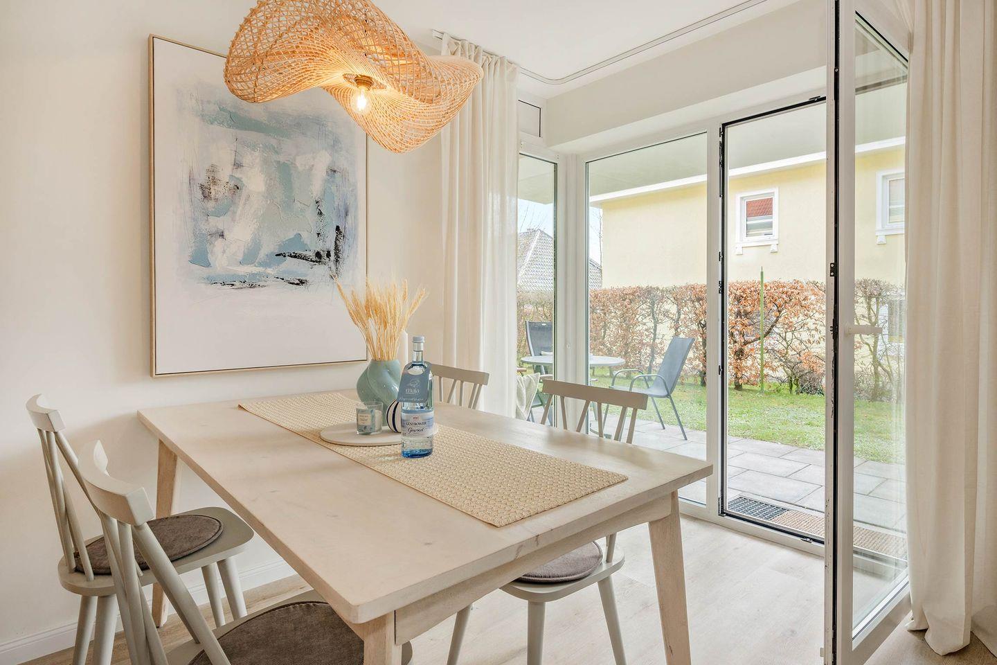 Der Wohnbereich überzeugt mit einem gemütlichen Ecksofa und einem Flat-TV, der dank Magenta-TV auch für eigene Streamingdienste verfügbar ist. Ziehen Sie sich zurück und gönnen Sie sich mit einem Buch in der Hand eine ausgiebige Pause auf dem bequemen Sessel in der kleinen Leseecke, oder richten Sie sich den Esstisch her und versammeln Sie sich mit der ganzen Familie zu einer gemeinsamen Mahlzeit. Die vielen Sonnenstunden auf der Insel Usedom lassen sich wunderbar auf der anliegenden, überdachten Terrasse verbringen. Durch die westliche Ausrichtung können Sie selbst die letzten Sonnenstrahlen des Tages noch erhaschen.