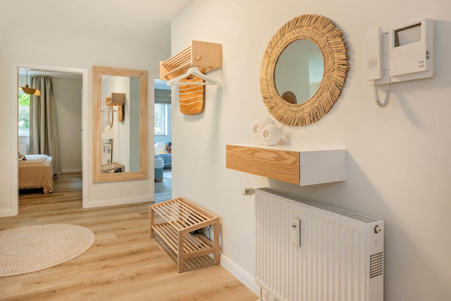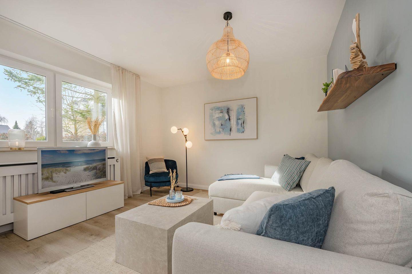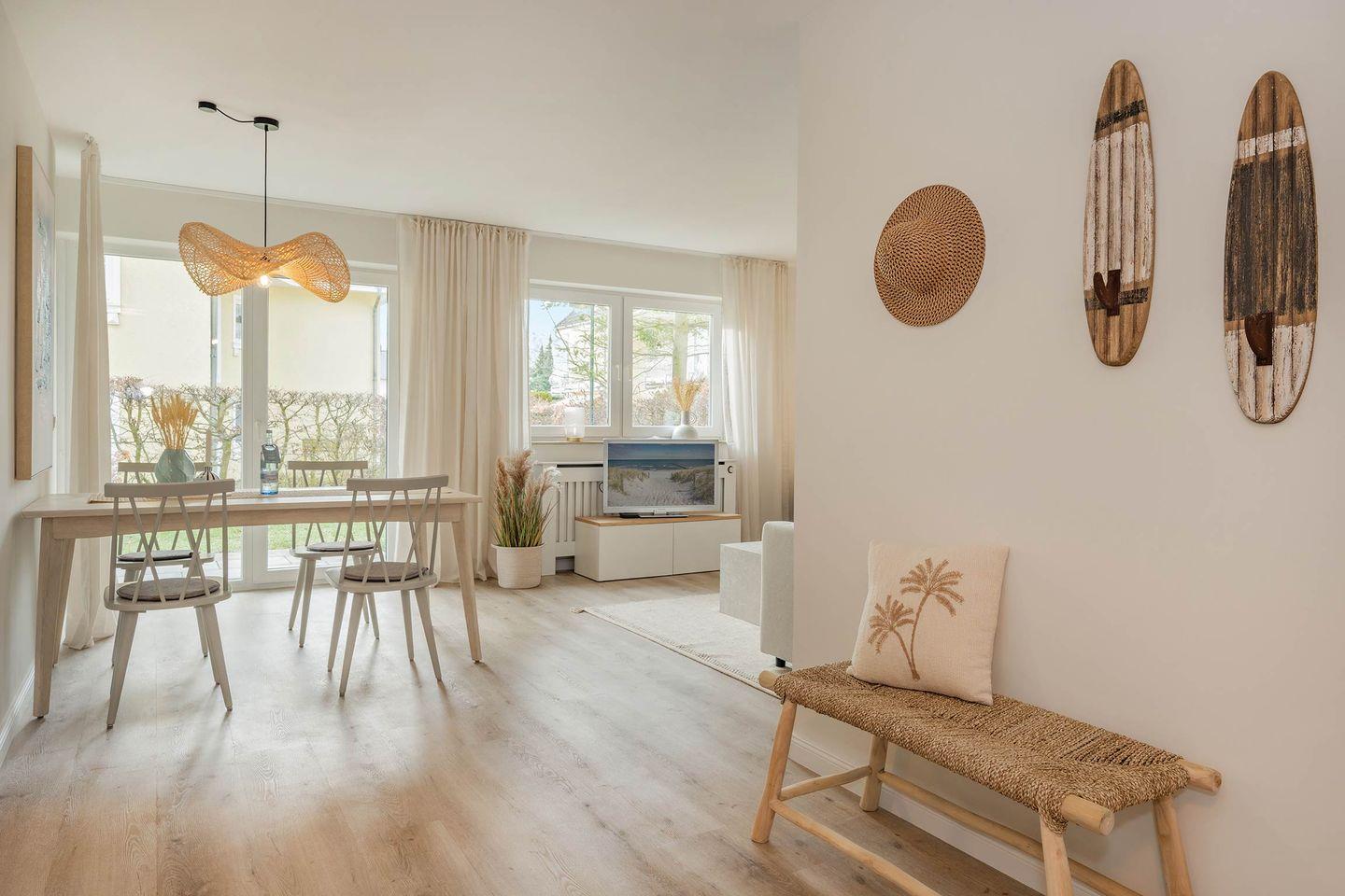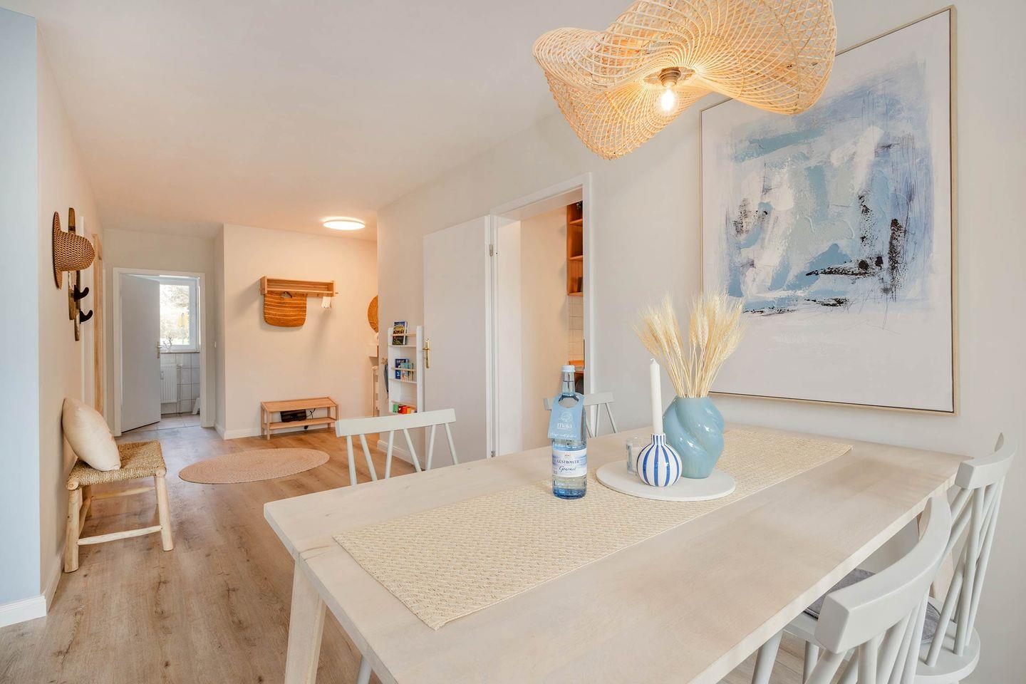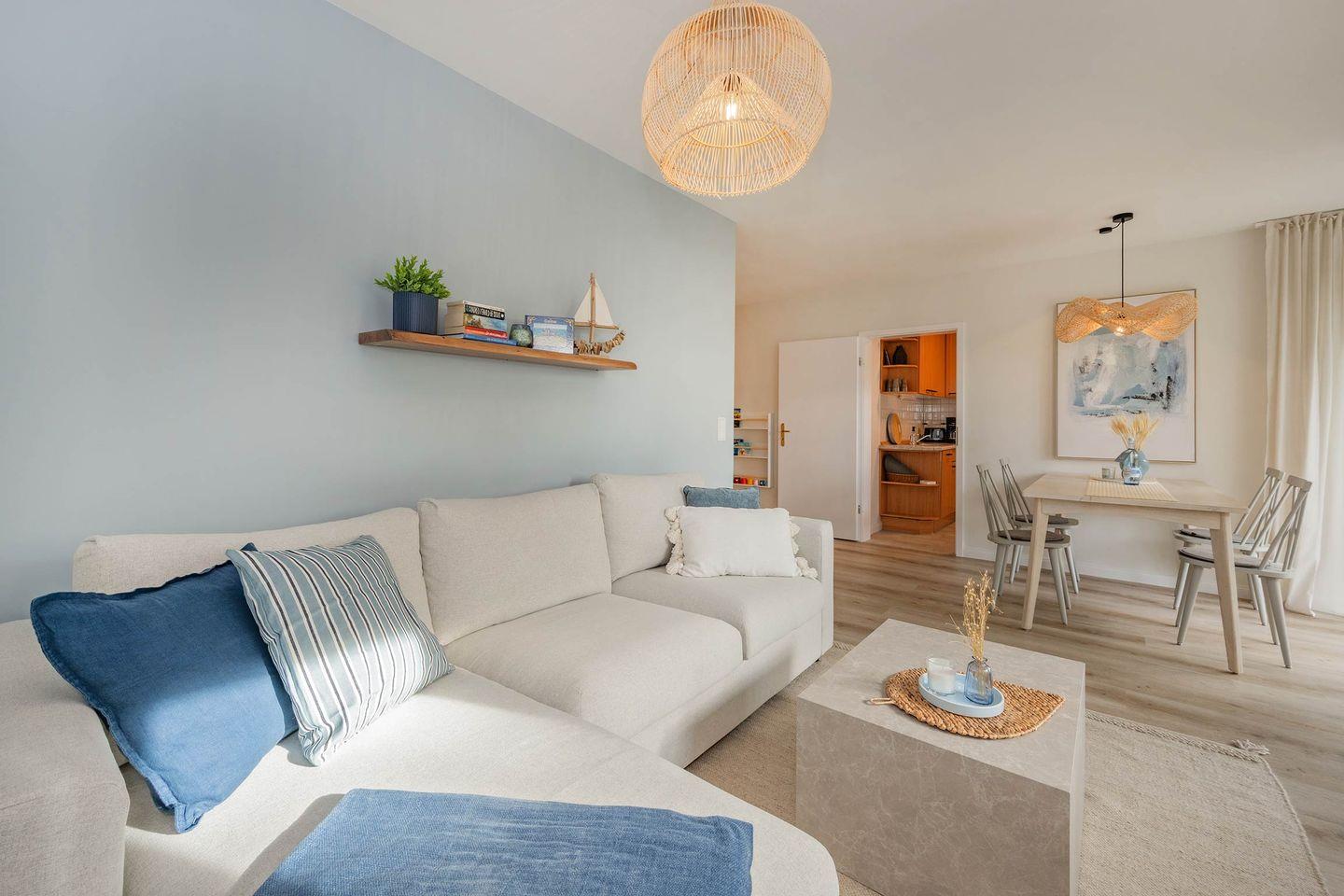 Das frisch renovierte Appartement "Blaue Brise" macht seinem Namen alle Ehre. So erwartet Sie im Erdgeschoss des Hauses eine geräumige Drei-Raum-Wohnung mit zwei Schlafzimmern, in harmonischem Einklang aus modernen Einrichtungselementen und maritimen Akzenten. Besonders für Familien stellt die Wohneinheit ein ideales Urlaubsdomizil dar.