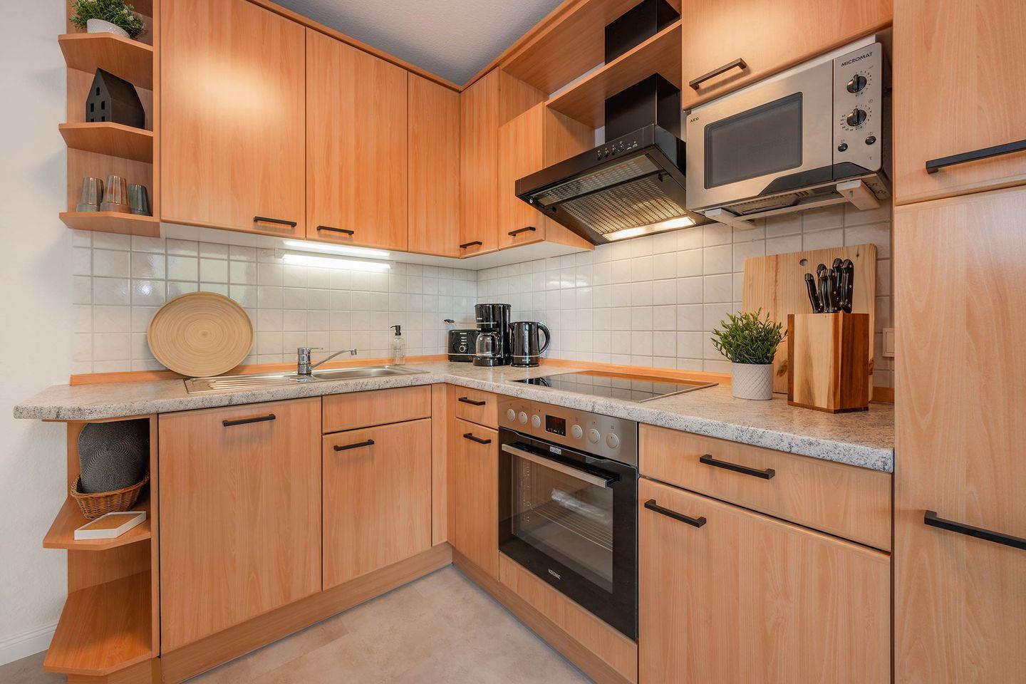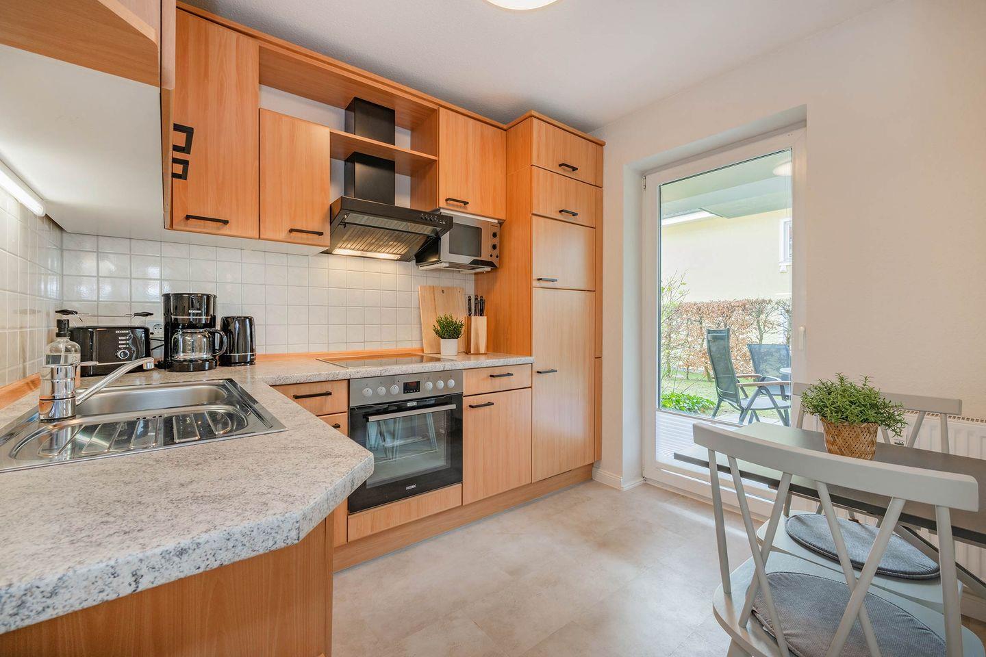 Die Küche befindet sich in einem separaten Raum, der unmittelbar an den Wohnbereich anschließt. Dort finden Sie alle gängigen Küchenutensilien mit wichtigen Helfern, wie ein Herd (4-Platten, Ceran) mit Backofen, Mikrowelle, Spülmaschine und selbstverständlich auch einen Kühl- und Gefrierschrank. Ein kleiner Tisch bietet zwei weitere Sitzmöglichkeiten und ermöglicht somit Platz für Gesellschaft während der Tätigkeiten in der Küche.