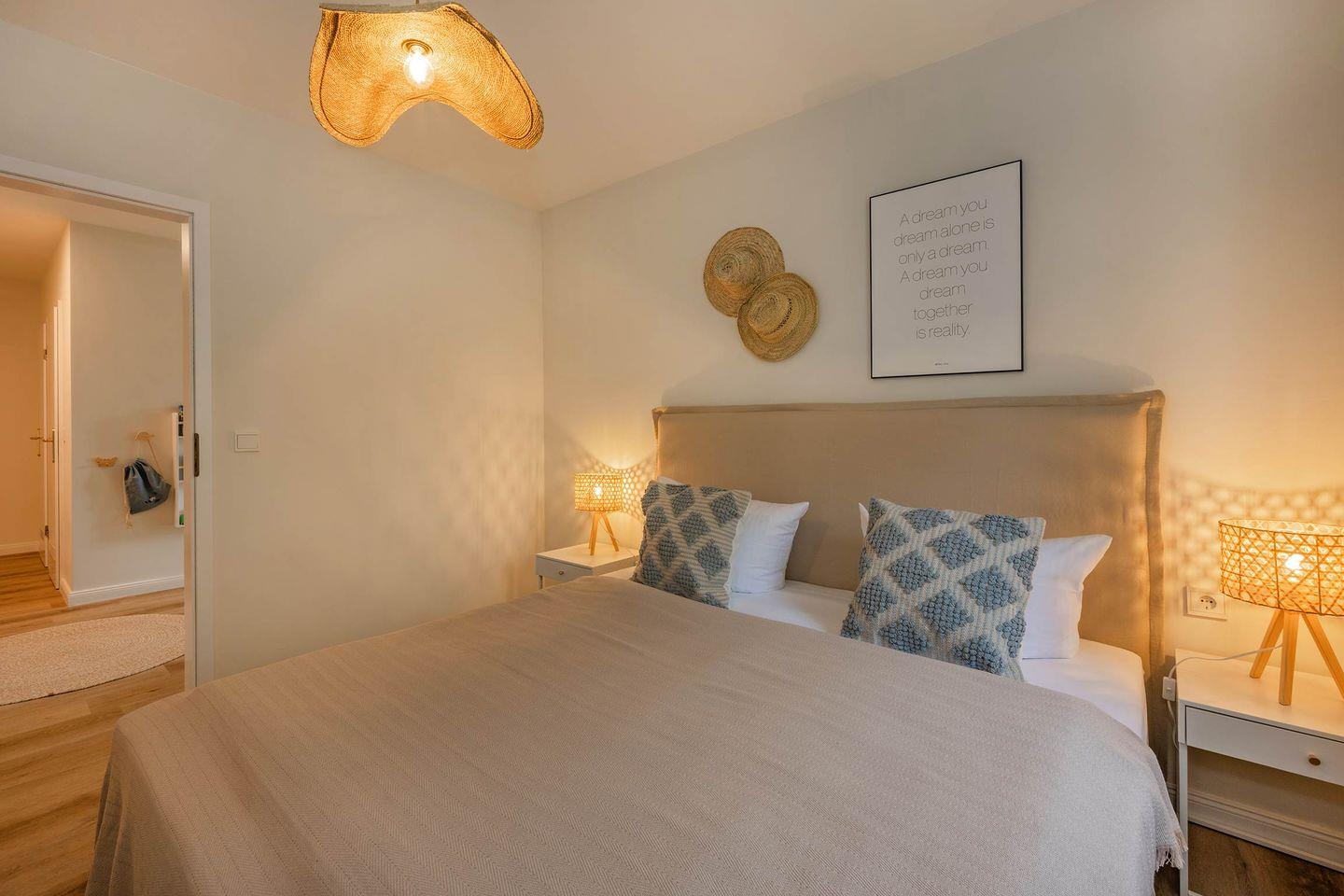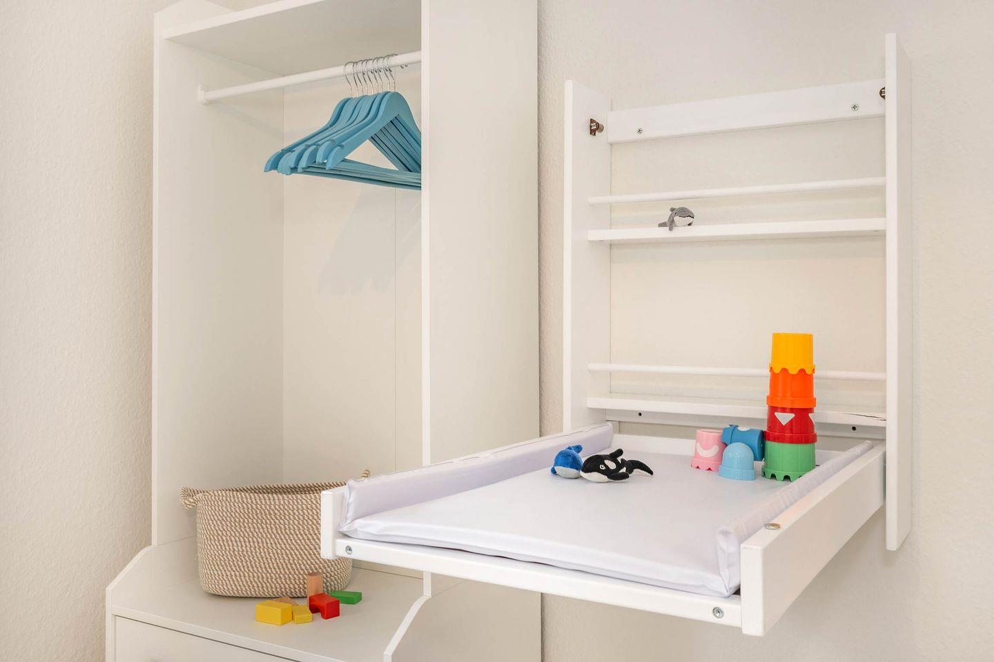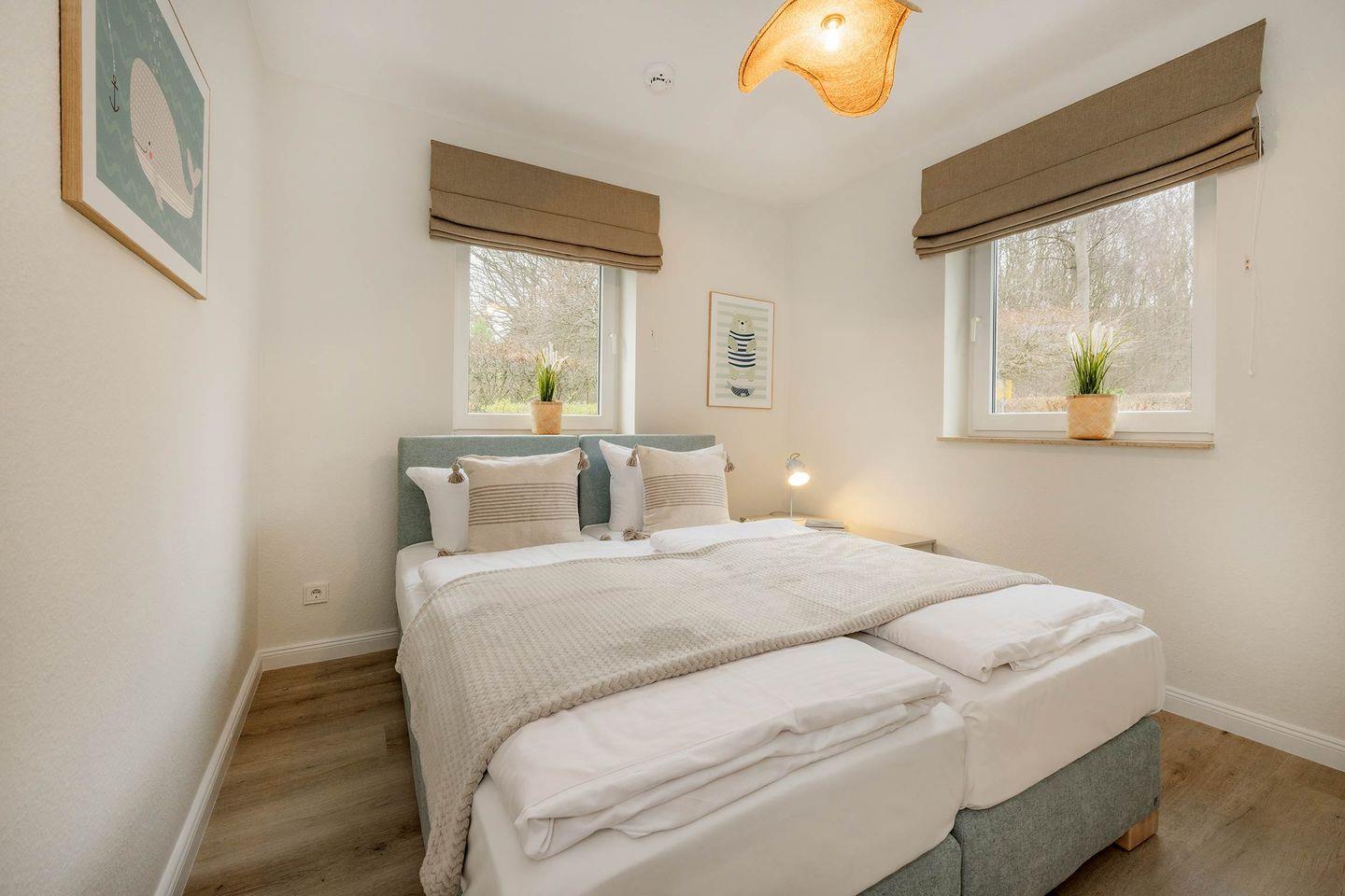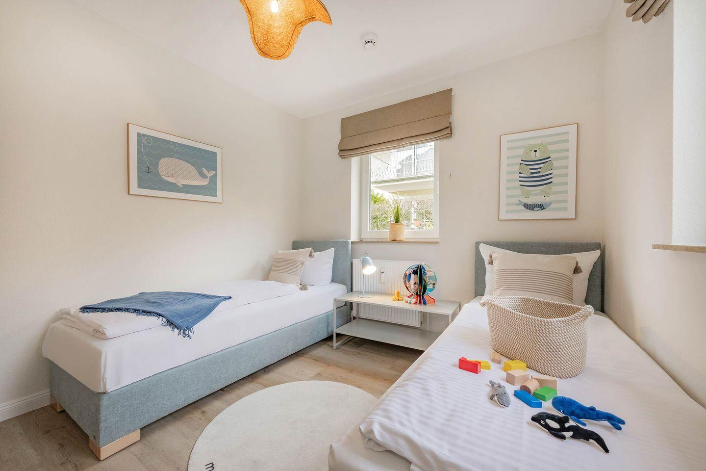 Die zwei Schlafzimmer sind komfortabel und harmonisch hergerichtet. So finden Sie im ersten Schlafzimmer ein geräumiges Boxspring-Doppelbett zusammen mit einem Kleiderschrank. Das zweite Schlafzimmer, ideal als Kinderzimmer nutzbar, ist mit zwei Einzelbetten, einem Kleiderschrank und einem ausklappbaren Wickeltisch eingerichtet. Auch wenn der Fokus der Unterkunft auf Familien mit Kindern gelegt wurde, so werden auch zwei Paare hier ihr Glück finden. So können die beiden Einzelbetten auch wunderbar zu einem Doppelbett zusammengeschoben werden.