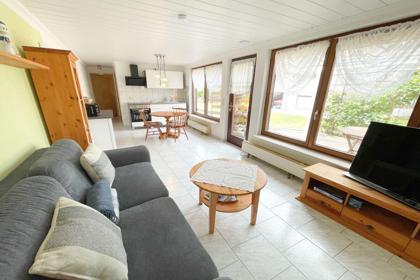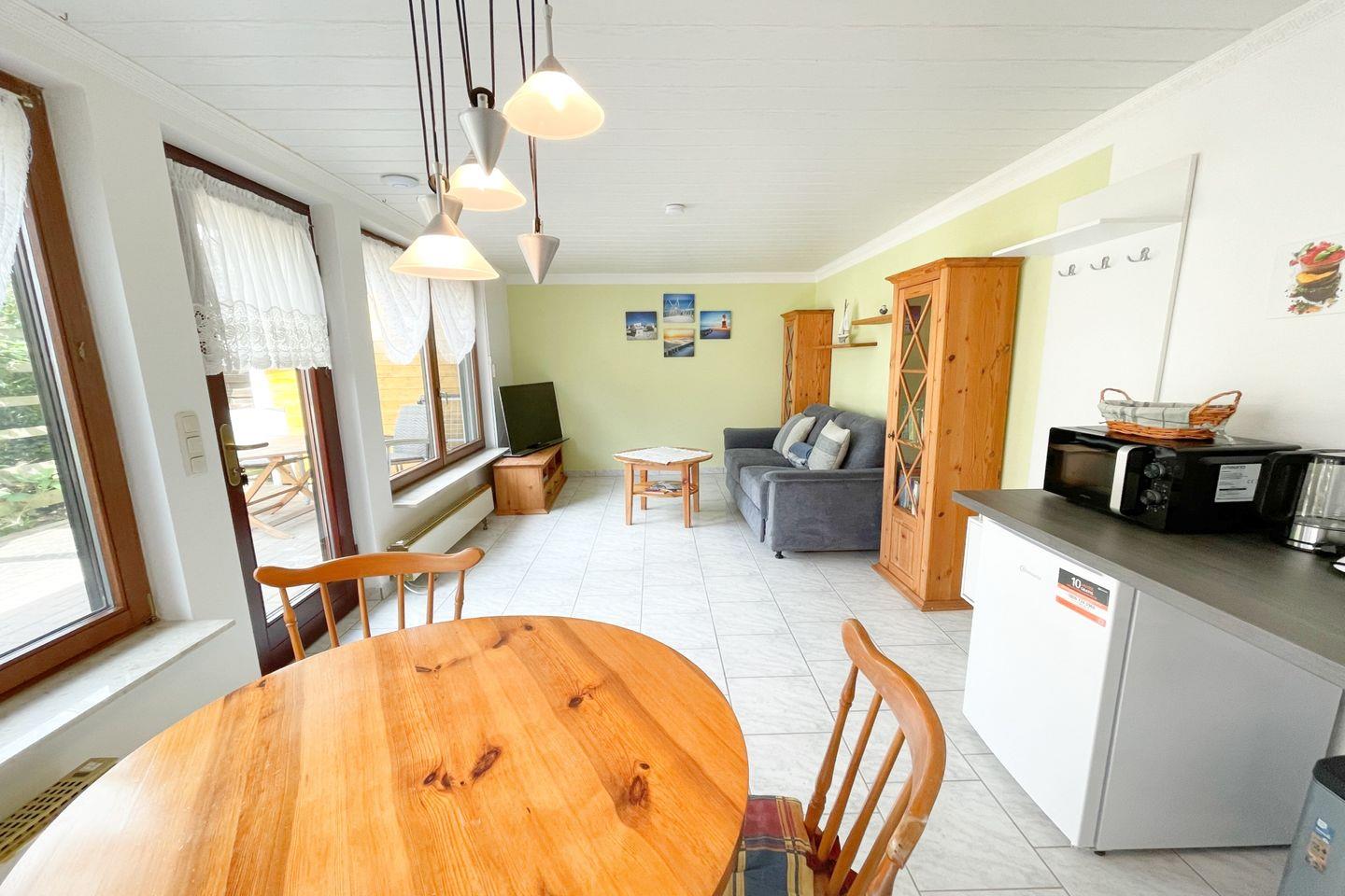 Der Ferienbungalow verfügt über ein geschmackvoll eingerichtetes Schlafzimmer und ein gemütliches Wohnzimmer, das mit einem bequemen Sofa, einem Essbereich und einer offenen Küche ausgestattet ist. Die Küche lässt keine Wünsche offen: Ein Cerankochfeld, Backofen, Mikrowelle und Kühlschrank mit Gefrierfach sorgen dafür, dass Sie all Ihre kulinarischen Ideen umsetzen können. Außerdem stehen Ihnen Geschirr, Besteck und nützliche Küchenutensilien zur Verfügung – alles, was Sie für einen unbeschwerten Aufenthalt benötigen.