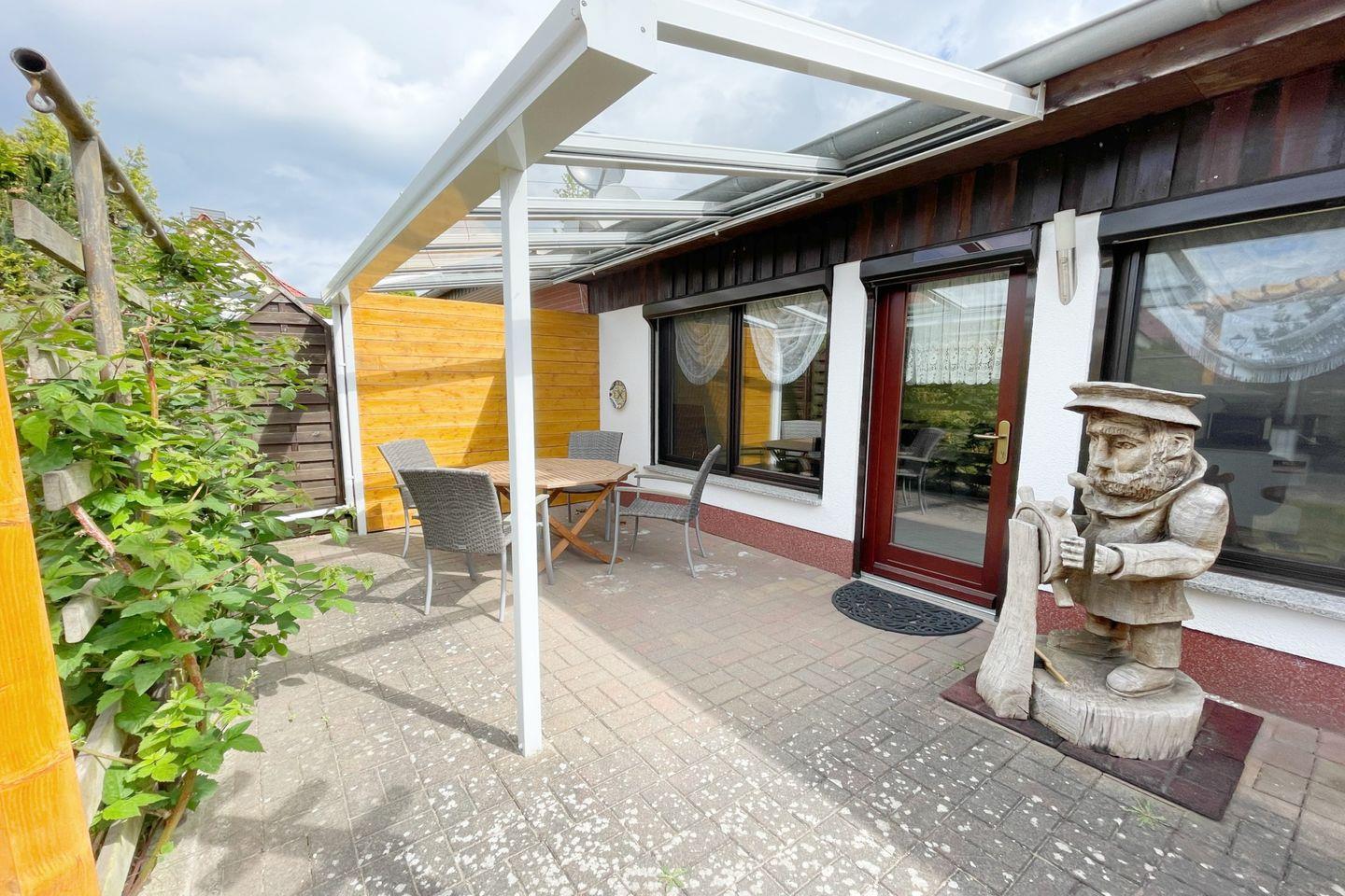 Genießen Sie die frische Ostseeluft auf Ihrer überdachten Terrasse, wo Gartenmöbel auf Sie warten, um entspannte Stunden im Freien zu verbringen. Umgeben von einem herrlichen Garten ist der Bungalow ideal für eine kleine Auszeit im Grünen. Die Ruhe und Abgeschiedenheit des abgeschlossenen Grundstücks runden das Erlebnis ab und sorgen für erholsame Urlaubstage.