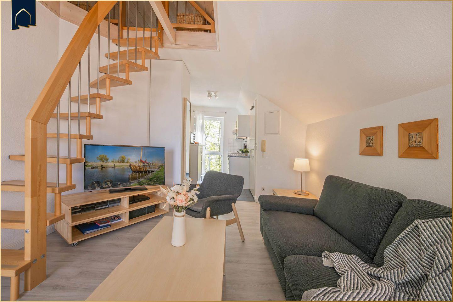 Auf ca. 44?m² bietet die lichtdurchflutete Ferienwohnung Platz für bis zu vier Personen. Der offene Wohnbereich mit Sofa, Sessel und Esstisch ist stilvoll und funktional eingerichtet. Die moderne Küche ist voll ausgestattet mit Herd, Backofen, Mikrowelle, Geschirrspüler, Kaffeemaschine und sogar einem Mixer – ideal für Selbstversorger. Ein separates Schlafzimmer sorgt für erholsamen Schlaf, während das Badezimmer mit Dusche, Waschbecken, WC und Haartrockner alle Annehmlichkeiten für den täglichen Komfort bietet. WLAN und TV sind selbstverständlich inklusive.
