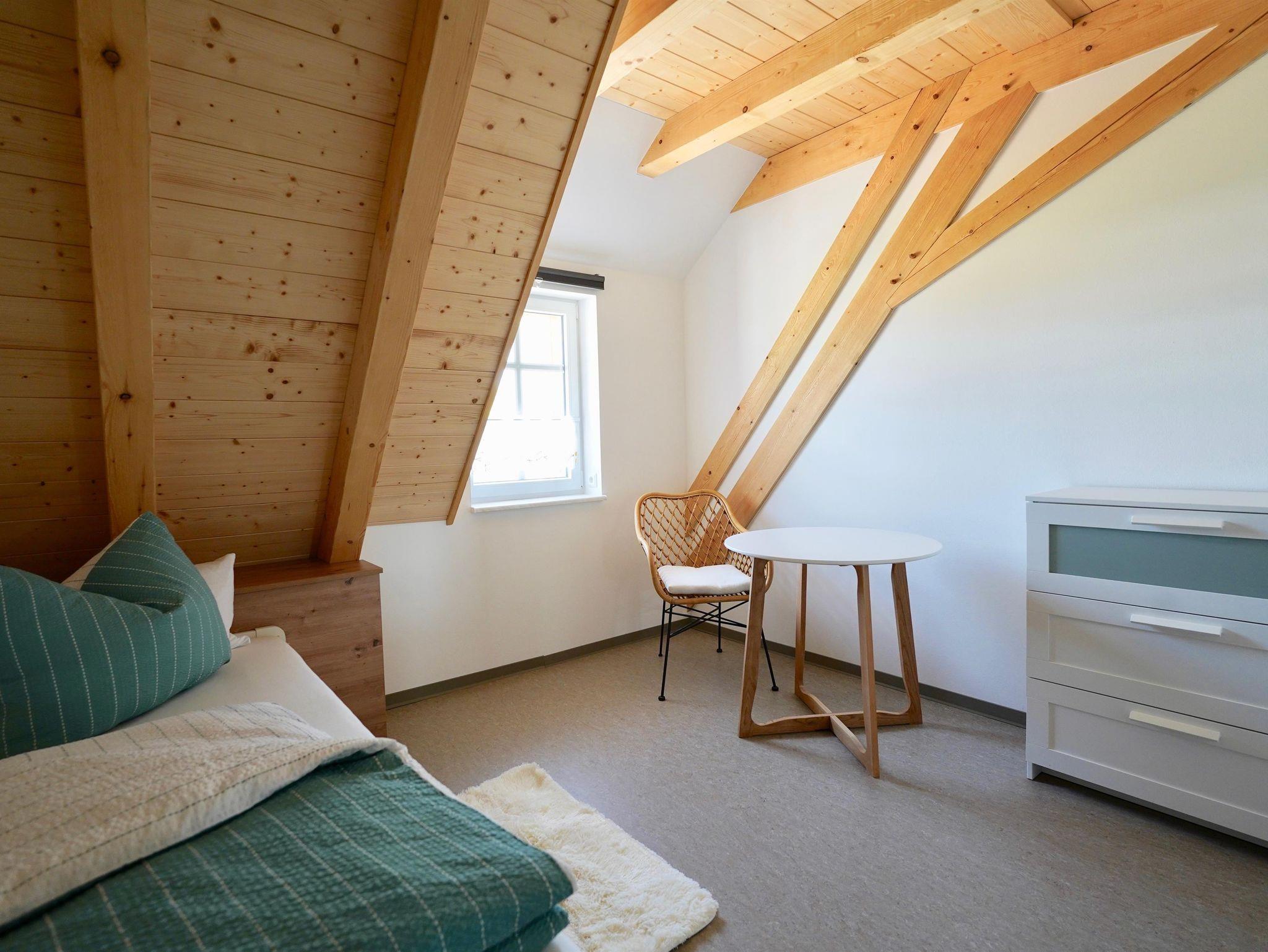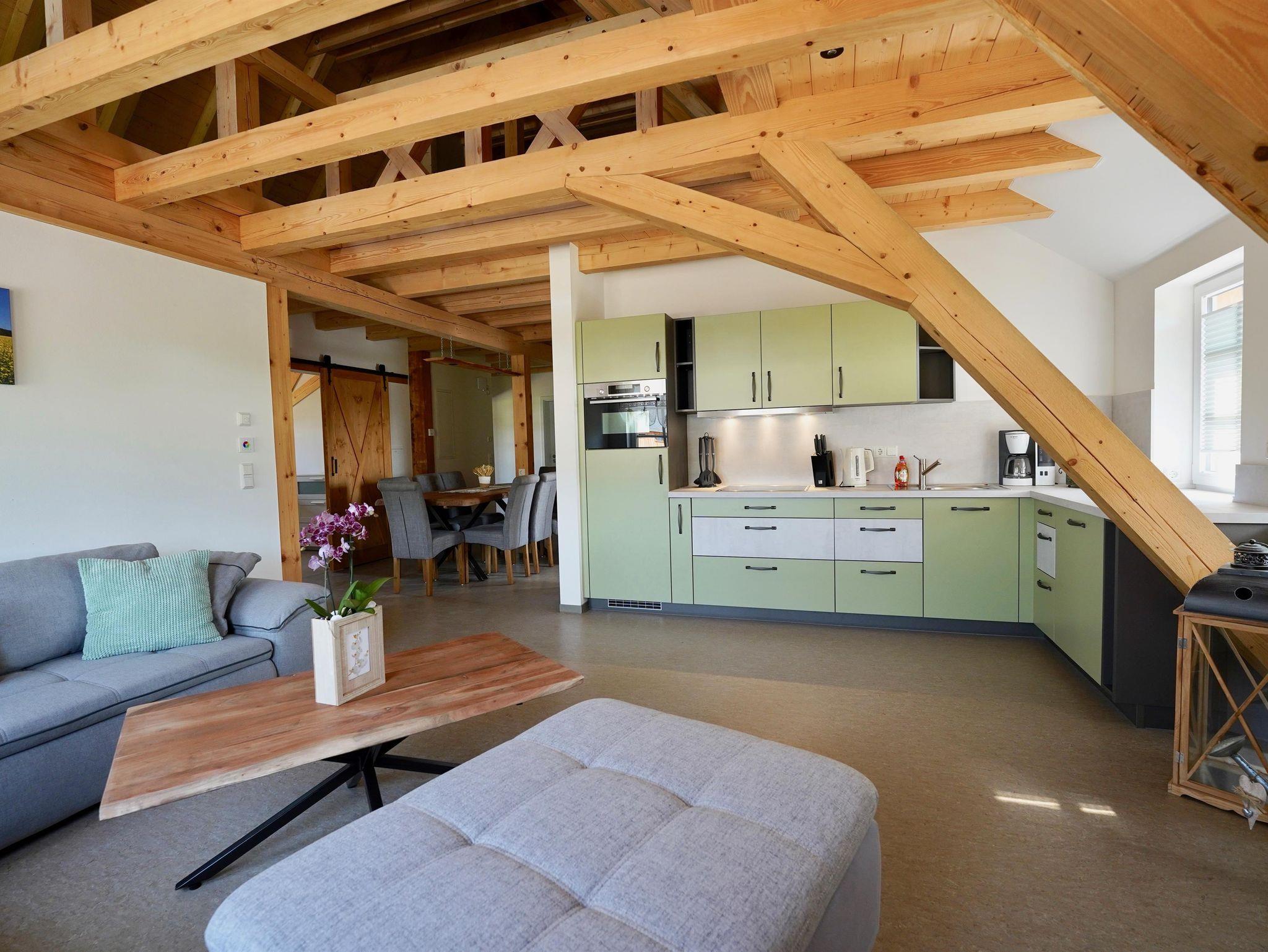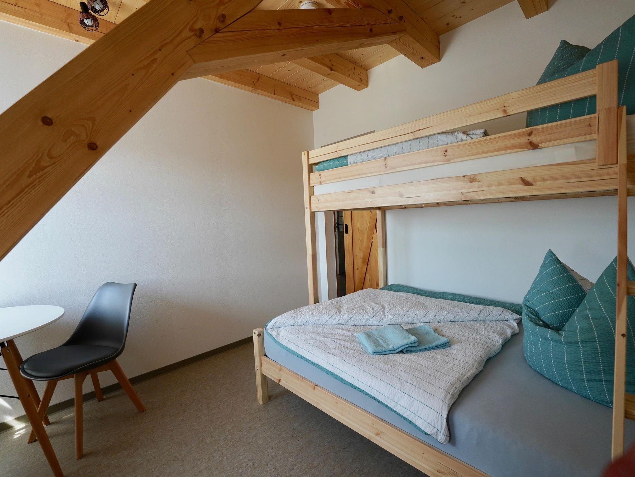 Unsere Familiensuite „Lerchenberg“ verfügt über einen geräumigen Wohn- und Essbereich mit viel Holzoptik, für ein wohliges Raumgefühl, sowie eine vollausgestattete Küche. Das große Badezimmer ist mit einer ebenerdigen Dusche, WC, Waschtischschrank und beleuchteten Spiegel ausgestattet, sowie einem separates WC. In den 3 Schlafräumen befinden sich 1 Doppelbett, 1 Einzelbett und 1 Etagenbett. Der offene Dachausbau erfolgte durch eine aufwendige Holzkonstruktion. Es besteht die Möglichkeit von 2 Aufbettungen und bei Bedarf die Nutzung einer zweiten Ferienwohnung mit 4 Betten. In der Ferienwohnung sind der Bettwäsche- und Handtuchservice sowie der Kaffee und eine kleine Tee-Auswahl in der Küche, als Service inbegriffen. Eine Flasche Mineralwasser als Begrüßungsgetränk und die Endreinigung nach dem Check Out gehören ebenfalls standardmäßig zu unserem Service.