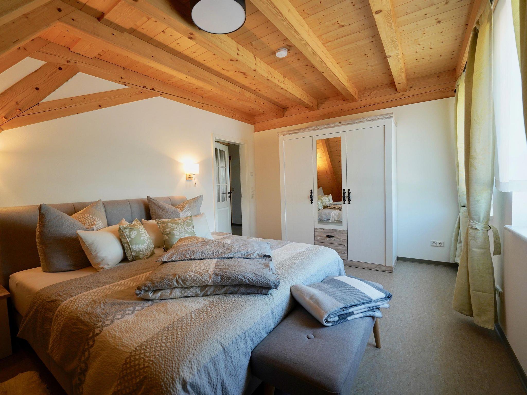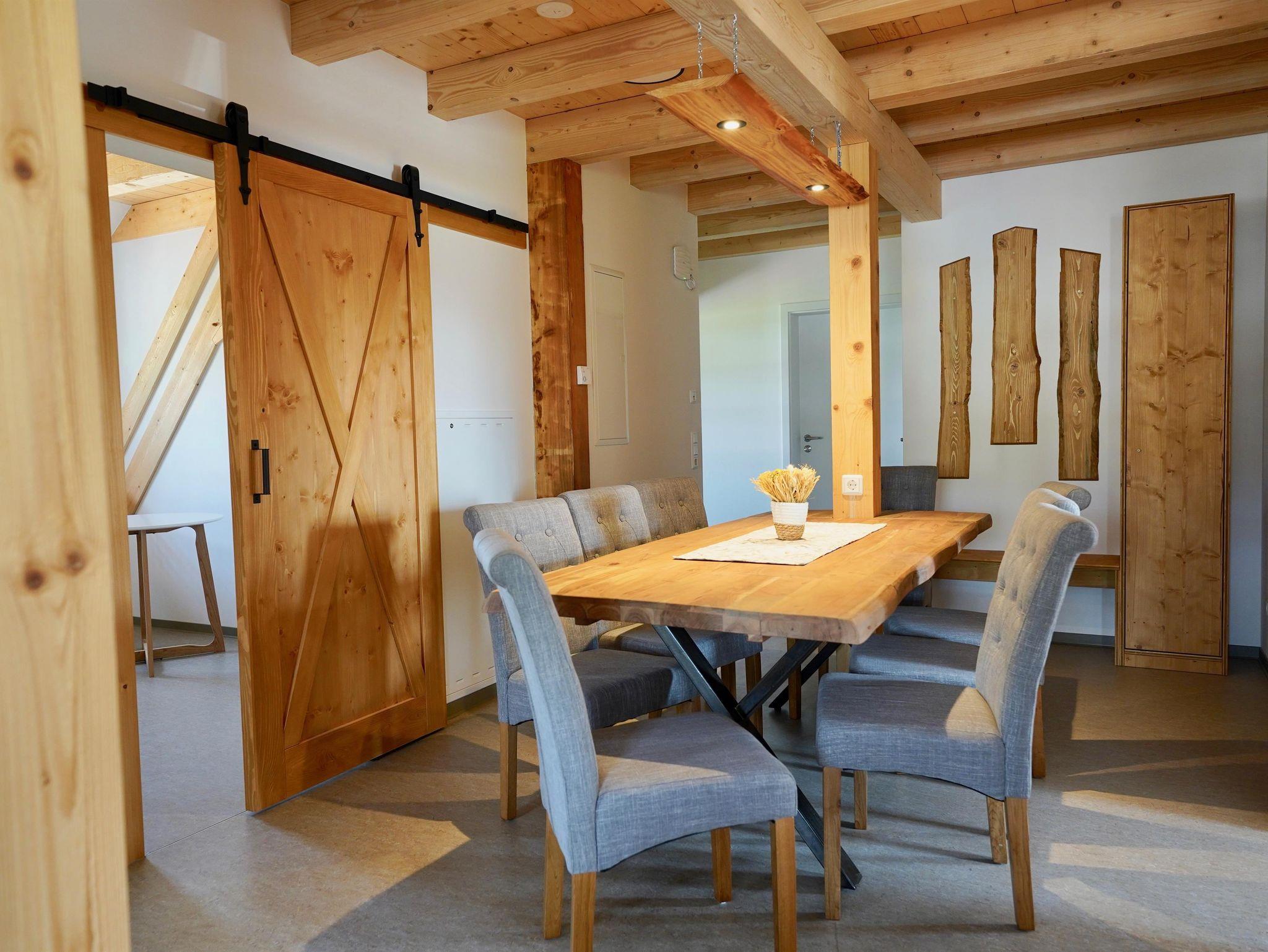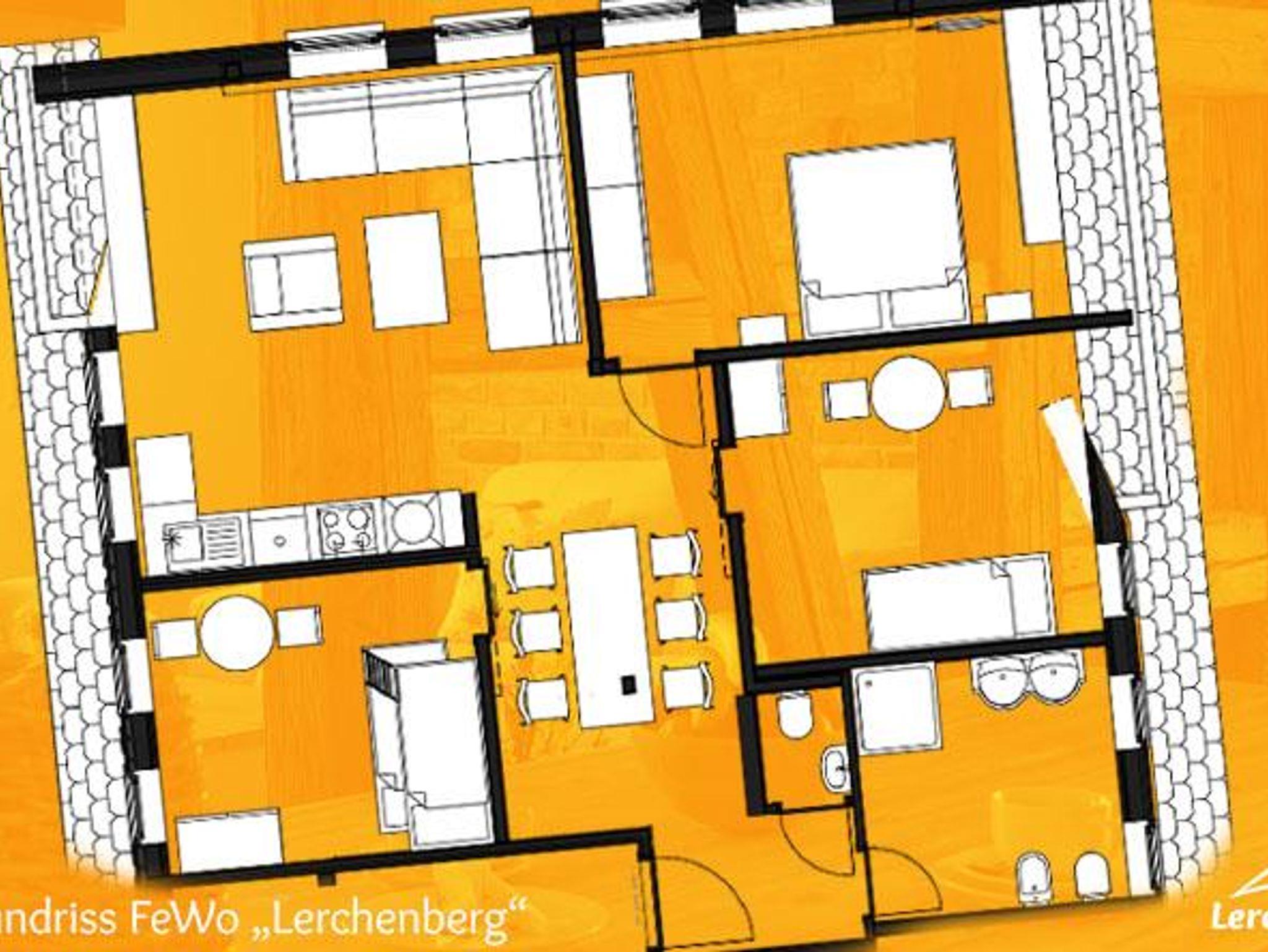 Unsere Familiensuite „Lerchenberg“ verfügt über einen geräumigen Wohn- und Essbereich mit viel Holzoptik, für ein wohliges Raumgefühl, sowie eine vollausgestattete Küche. Das große Badezimmer ist mit einer ebenerdigen Dusche, WC, Waschtischschrank und beleuchteten Spiegel ausgestattet, sowie einem separates WC. In den 3 Schlafräumen befinden sich 1 Doppelbett, 1 Einzelbett und 1 Etagenbett. Der offene Dachausbau erfolgte durch eine aufwendige Holzkonstruktion. Es besteht die Möglichkeit von 2 Aufbettungen und bei Bedarf die Nutzung einer zweiten Ferienwohnung mit 4 Betten. In der Ferienwohnung sind der Bettwäsche- und Handtuchservice sowie der Kaffee und eine kleine Tee-Auswahl in der Küche, als Service inbegriffen. Eine Flasche Mineralwasser als Begrüßungsgetränk und die Endreinigung nach dem Check Out gehören ebenfalls standardmäßig zu unserem Service.