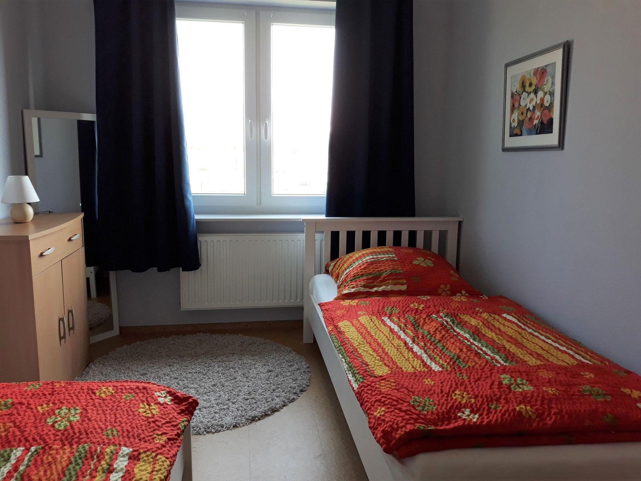 Ein Schlafzimmer mit Doppelbett und ein Schlafzimmer mit 2 Einzelbetten runden die gemütliche und in angenehmen Farben eingerichtete Wohnung ab.