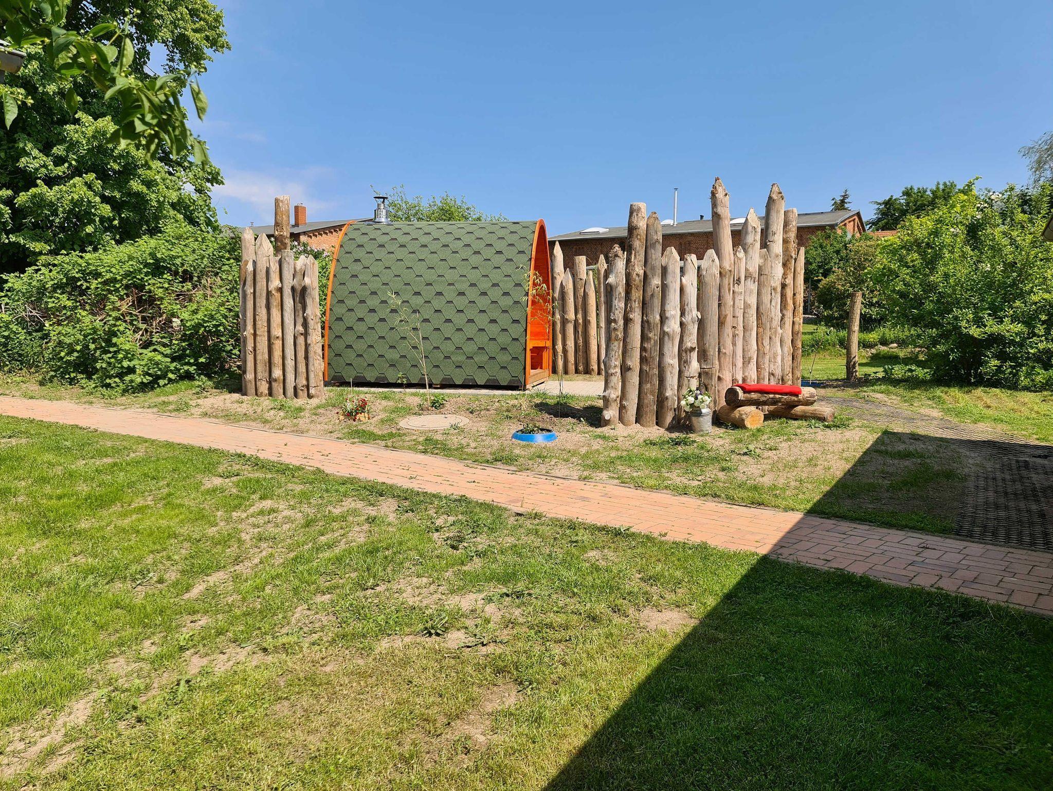 Podsauna und Waschmaschine am Haus (Buchung gegen Gebühr), 1 kostenloser Parkplatz am Haus und genügend Platz zum Toben auf dem Grundstück runden das Angebot ab.