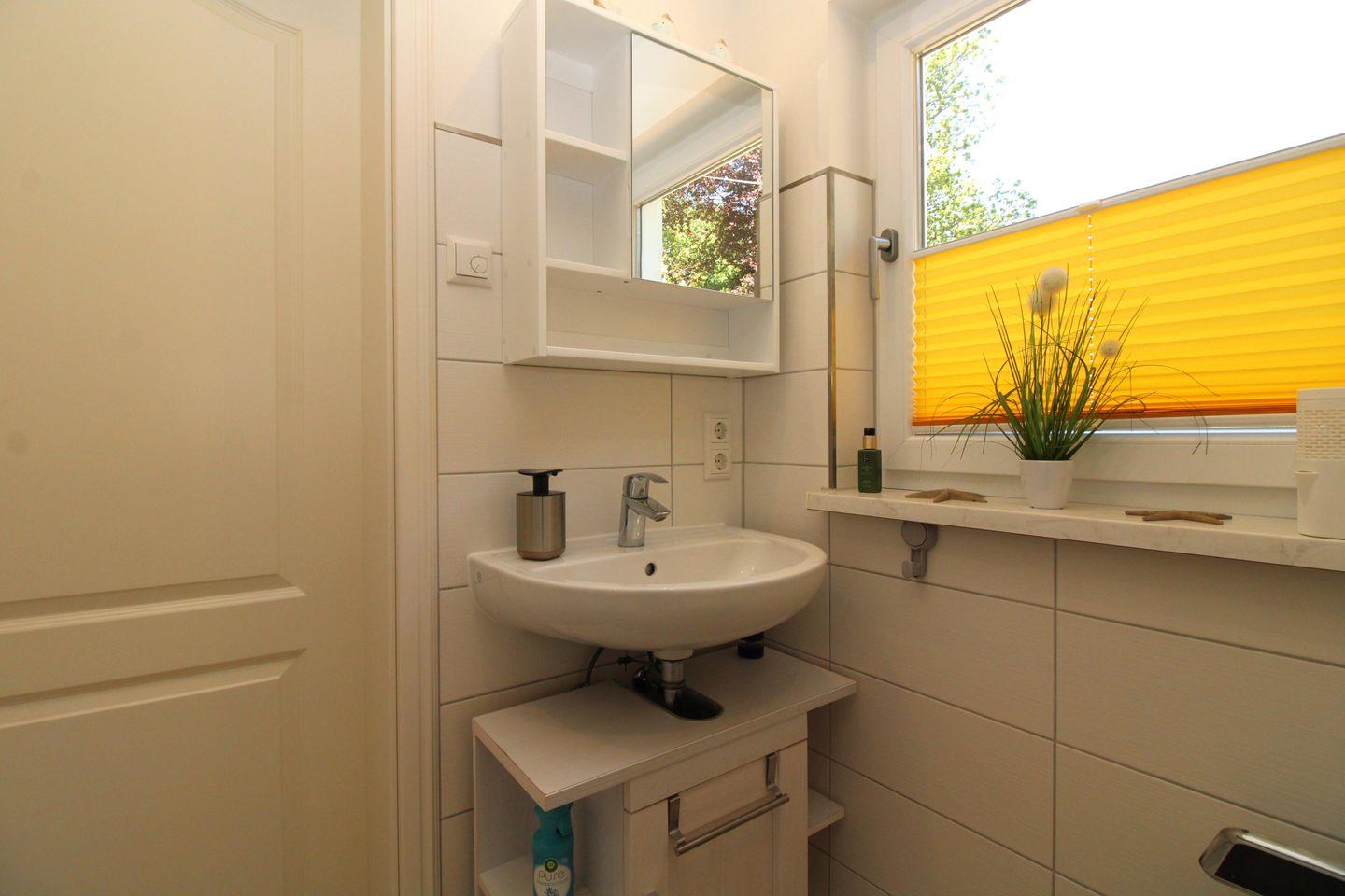 Das Badezimmer (mit Tageslicht / Fenster) verfügt über eine Dusche mit niedrigem Einstieg (seniorenfreundlich!), Waschbecken mit Unterschrank, einen Badezimmerschrank, WC, Föhn sowie ausreichend Ablagemöglichkeiten.