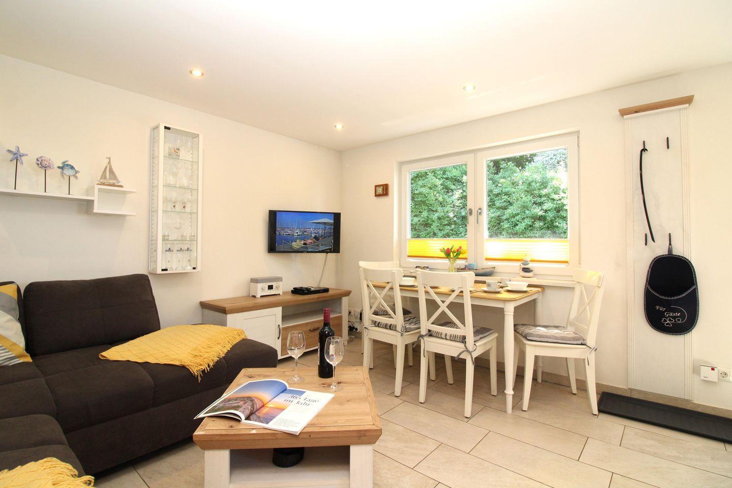 Das gemütliche Wohn-/Esszimmer verfügt über eine separate Sitzgruppe mit bequemer Eck-Couch und Couchtisch, einen separaten Esstisch mit 4 Stühlen, zwei Sideboards sowie eine Glasvitrine. Vom Wohnbereich aus haben Sie direkten Zugang zu der ca. 50 m² großen und sonnigen Terrasse (nach Süden und Westen ausgerichtet) mit Gartenmobiliar (Tisch mit Sitzbank und Stühlen). Hier sitzen Sie entspannt und gemütlich mitten im Grünen und können abends bei einem guten Glas Wein in Ruhe die lauen Sommernächte genießen!