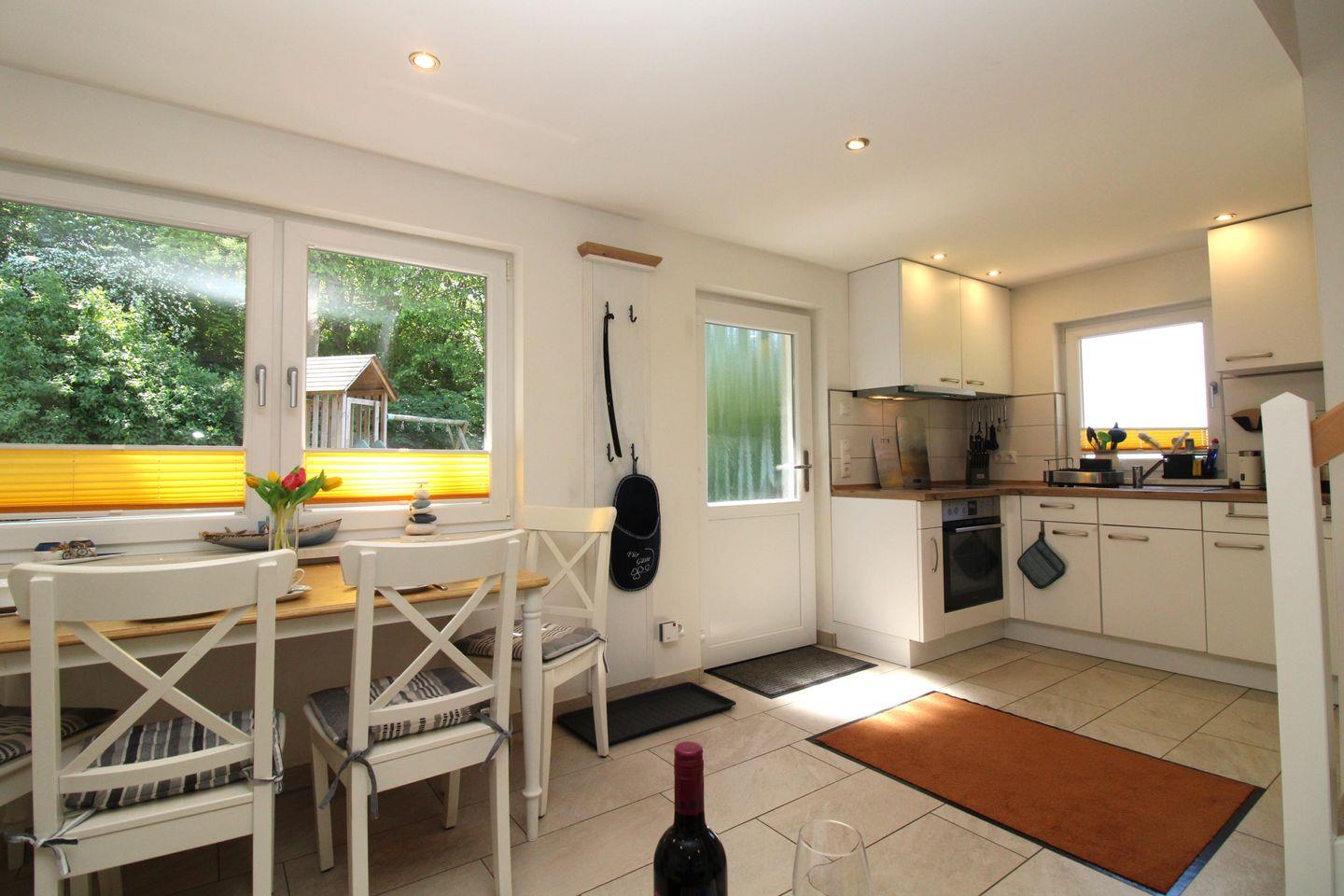 Die offene Küche beinhaltet eine voll ausgestattete Einbauküchenzeile mit 4-Zonen-Ceran-Kochfeld, Backofen, Airfryer (Heißluftfritteuse), Dunstabzug, Kühlschrank mit Gefrierfach, Kaffeemaschine, Wasserkocher, Toaster und Eierkocher. Die Küche ist mit Geschirr, Gläsern, Besteck und Töpfen komplett ausgestattet. Auf der Terrasse kann mit dem vorhandenen Elektrogrill auch gerne gegrillt werden – auf Grund der umliegenden Häuser mit Reet-Bedachung ist die Nutzung eines Kohlegrills nicht möglich und untersagt!