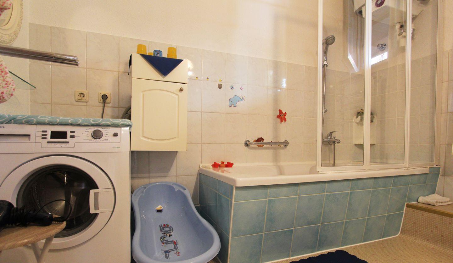 Das Badezimmer ist mit einer Badewanne samt Duschmöglichkeit, Waschbecken, WC, Haartrockner, Fenster, großen Spiegeln sowie Kosmetikspiegel ausgestattet. So beginnt und endet jeder Tag mit Komfort und Funktionalität.