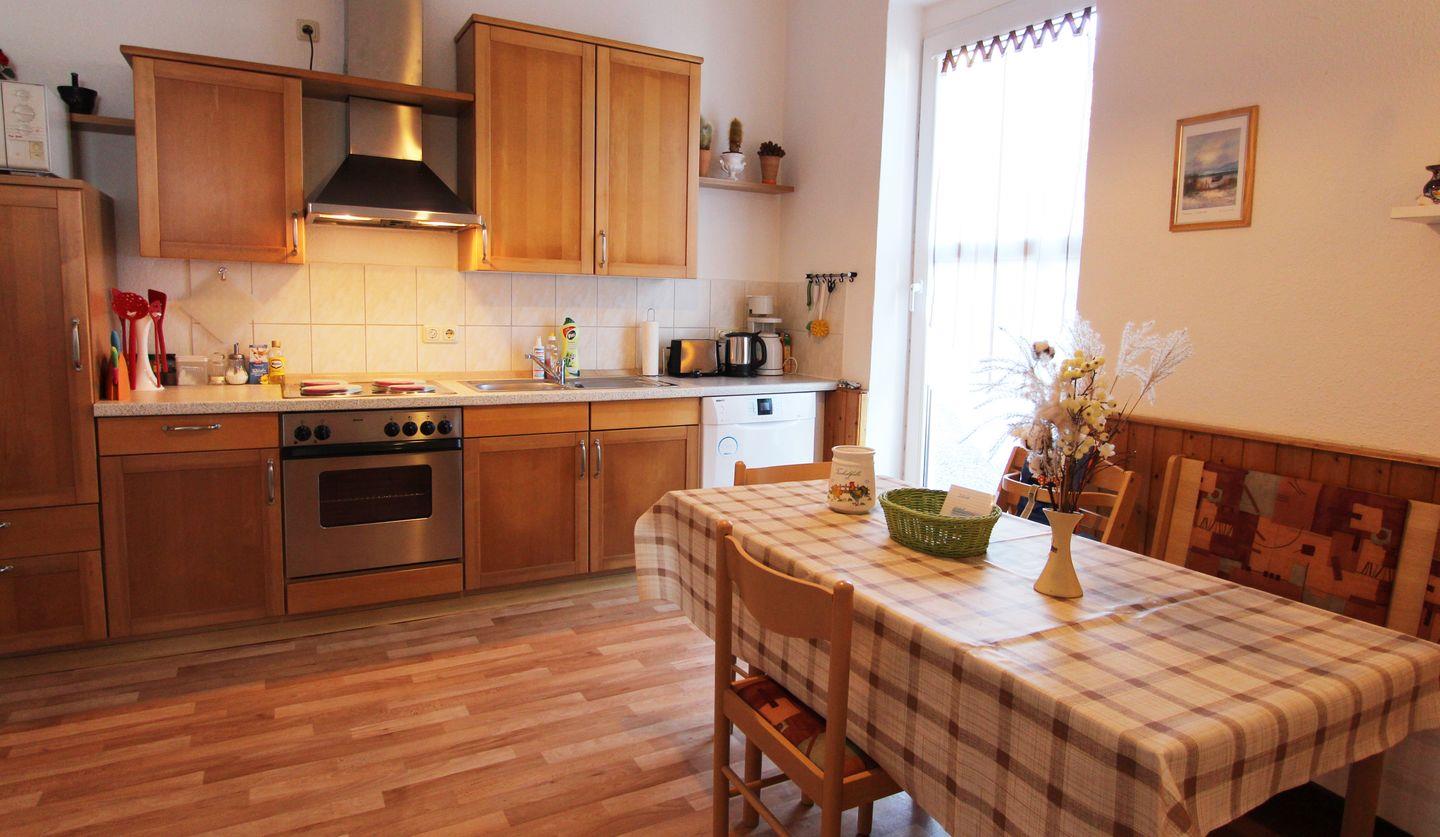 Die vollständig ausgestattete, separate Küche mit Esstisch bietet Ihnen alles, was Sie für die Zubereitung Ihrer Mahlzeiten benötigen: ein moderner 4-Platten-Herd mit Elektroanschluss, Backofen, Mikrowelle, Kaffeemaschine, Wasserkocher, Toaster sowie ein Kühlschrank mit integriertem Gefrierfach. Geschirrspüler, ausreichende Küchenutensilien wie Geschirr und Besteck, Geschirrhandtücher sowie ein Abfalleimer stehen selbstverständlich ebenso bereit. Der helle Essbereich, eingebettet in die Küche, lädt zu gemeinsamen Mahlzeiten ein und unterstreicht den wohnlichen Charakter der Unterkunft. Waschmaschine, Wäscheständer und Staubsauger bieten gerade bei längeren Aufenthalten wertvolle Alltagskomforts.