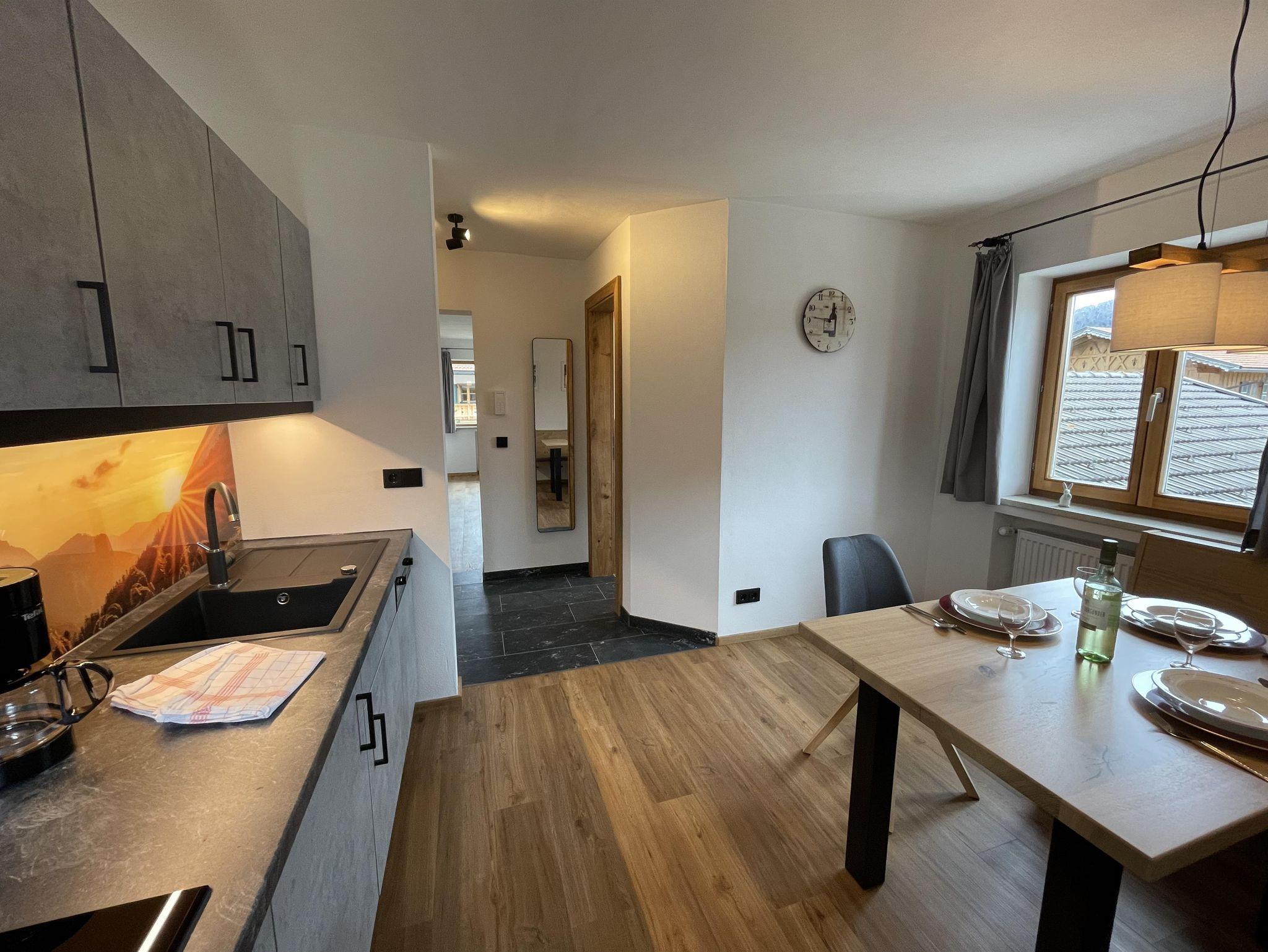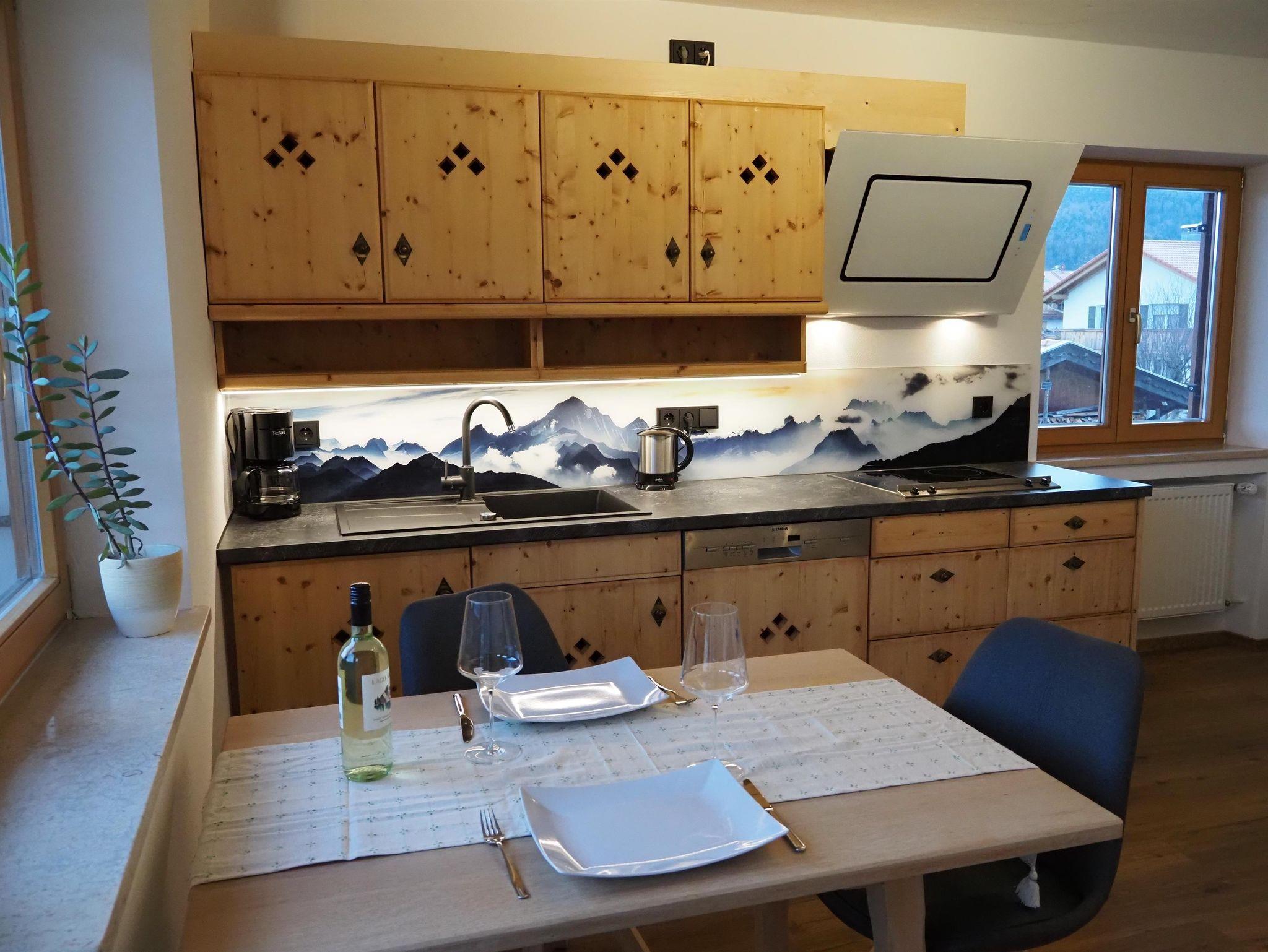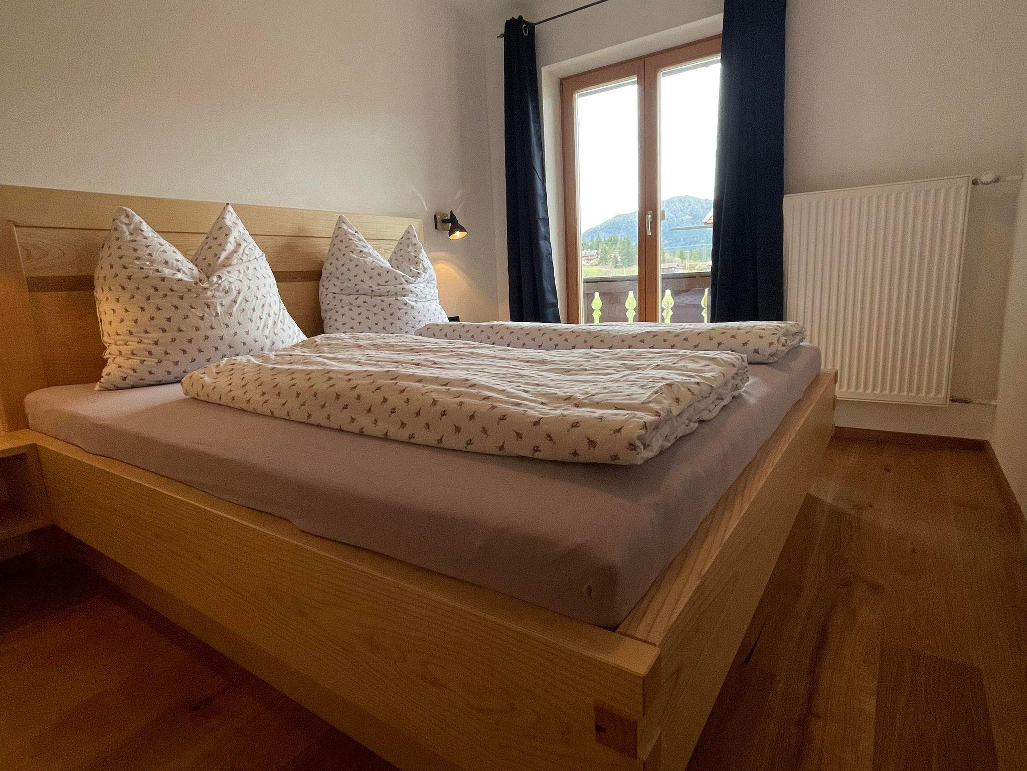 Unsere Ferienwohnung Alpspitze bietet mit einem westlich ausgerichteten Balkon traumhafte Sonnenuntergänge und einen herrlichen Ausblick auf das gesamte Karwendel- und Wettersteinmassiv inkl. Zugspitze. Die Ferienwohnung verfügt über eine geschmackvolle & rustikale Einrichtung, eine separate Küche inkl. Geschirrspülmaschine und 3-Plattenceranfeld, Flachbild-TV und kostenfreies WLan. Das Bad ist mit einem WC und einer Dusche ausgestattet. Mit einer großen Fensterfront im Wohnzimmer, haben Sie uneingeschränkten Blick auf das tolle Bergpanorama von Krün. Eine große Couch lädt zum Entspannen vor toller Bergkulisse ein. Eine Ausziehmöglichkeit der Couch ist vorhanden. Erholsamen Schlaf finden sie in einem handgefertigtem Bett aus Eschenholz. Die Couch im Wohnzimmer ist ausziehbar und bietet ein vollwertiges Bett mit Matratzengröße 160cm x 200cm. Das macht die Ferienwohnung auch für 3 Erwachsene oder Zwei Erwachsene und zwei Kinder buchbar.