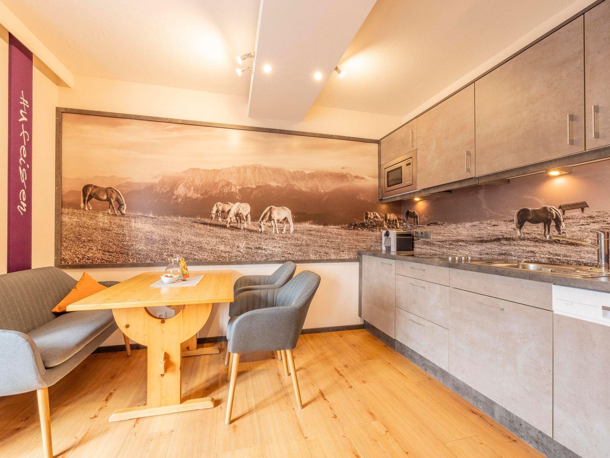 Unsere stilvolle Ferienwohnung Hufeisen verdankt ihren Namen einem ganz besonderen Blickfang: Ein großes Panoramabild in der Küche zeigt eine Gruppe Pferde auf dem Wank oberhalb von Garmisch-Partenkirchen, im Hintergrund das majestätische Wettersteingebirge – ein kraftvolles, ruhiges Motiv, das sofort Sehnsucht weckt.