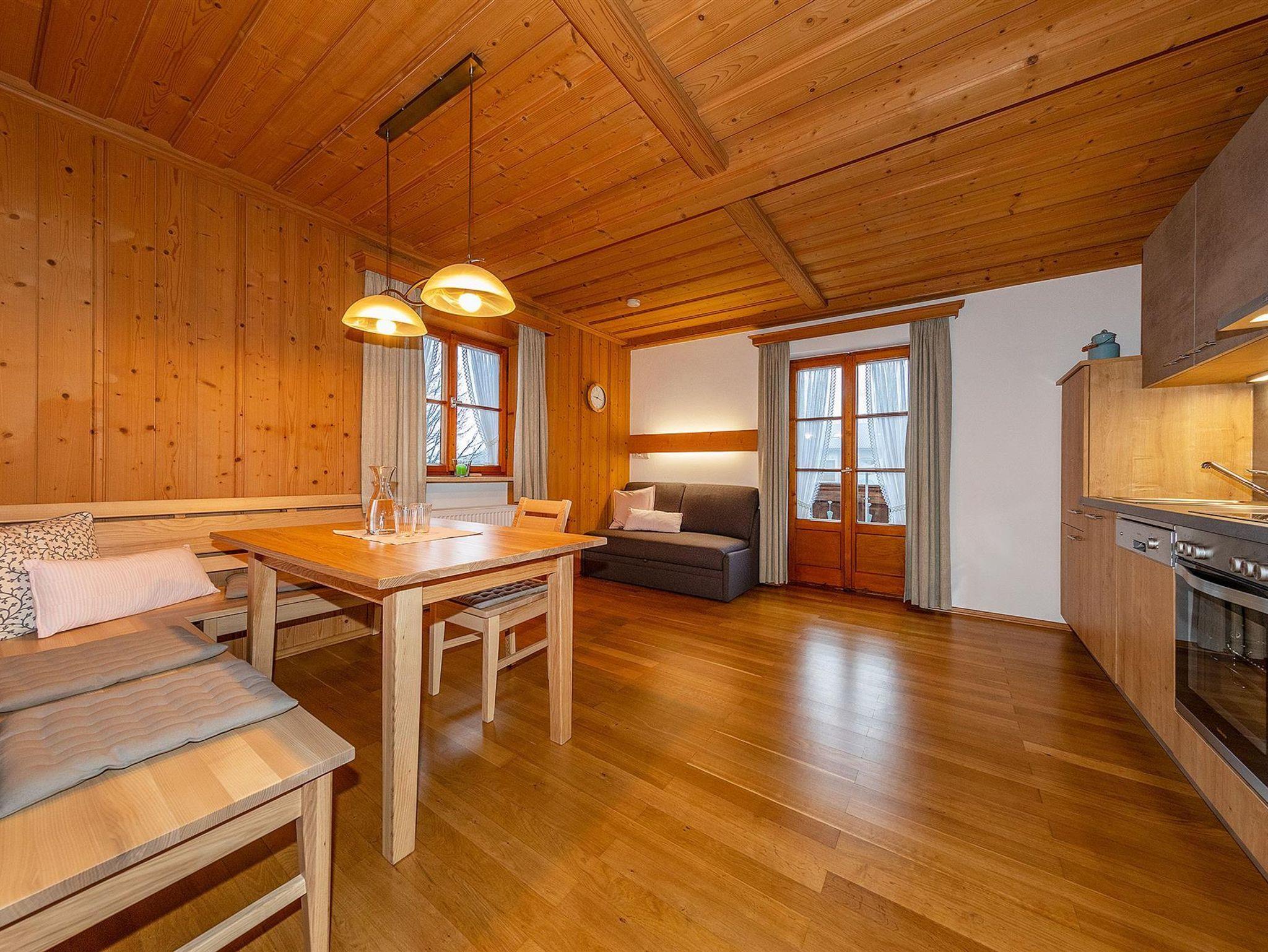 Die Ferienwohnung für 2 Personen, mit 37qm im ersten Stock, bietet eine ganz besondere Wohn-Atmosphäre. Das Zirbenholz-Schlafzimmer sorgt für Entspannung, da die Zirbe eine beruhigende und schlaffördernde Wirkung verspricht. Es befindet sich ein Zirbenholzbett (180x200) und ein Zirbenholzkleiderschrank darin, außerdem der Zugang zum Balkon. In der Wohnküche können Sie an sonnigen Tagen bereits auf dem Balkon frühstücken. Ein Kühlschrank mit Gefrierfach, Spülmaschine, Kaffeemaschine, Wasser- und Eierkocher, sowie Herd und Backofen helfen Ihnen dabei. Auch das Bad ist komfortabel mit Duschkabine und Handtuchtrockner ausgestattet. Der Süd- und Ostbalkon ermöglicht einen Rundumblick auf das Soiern-, Karwendel- und Wettersteinmassiv.