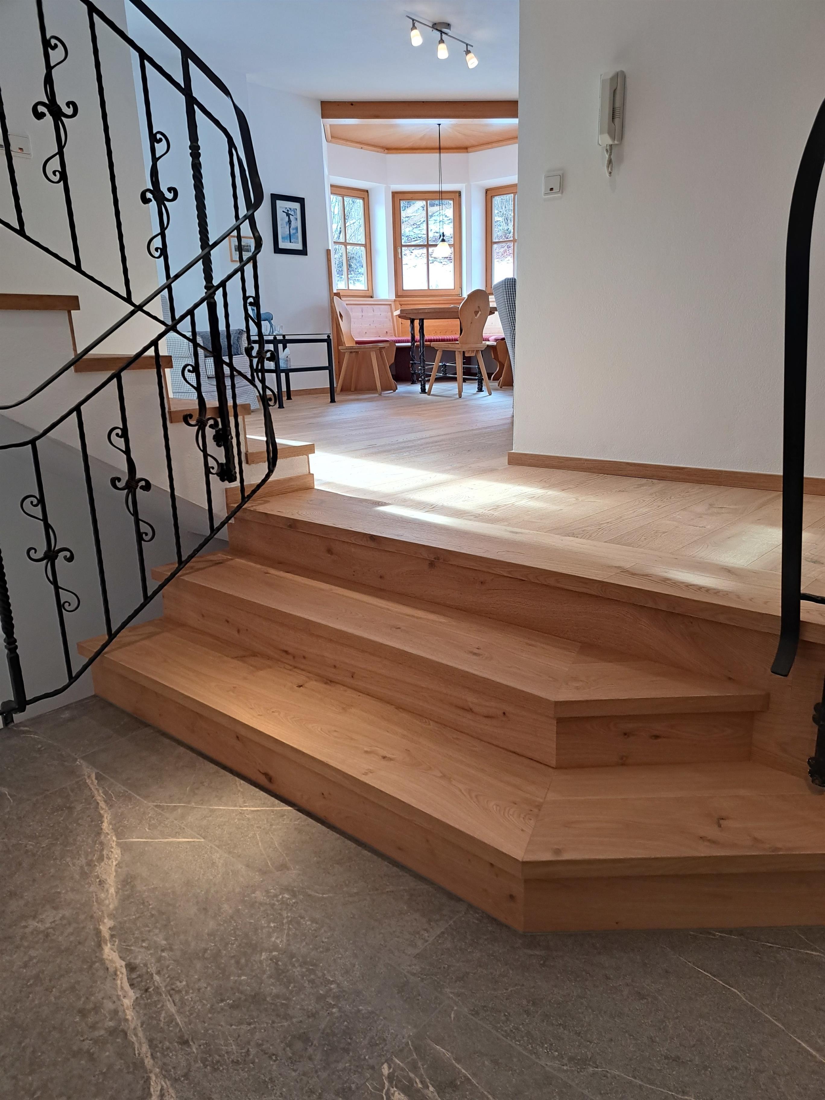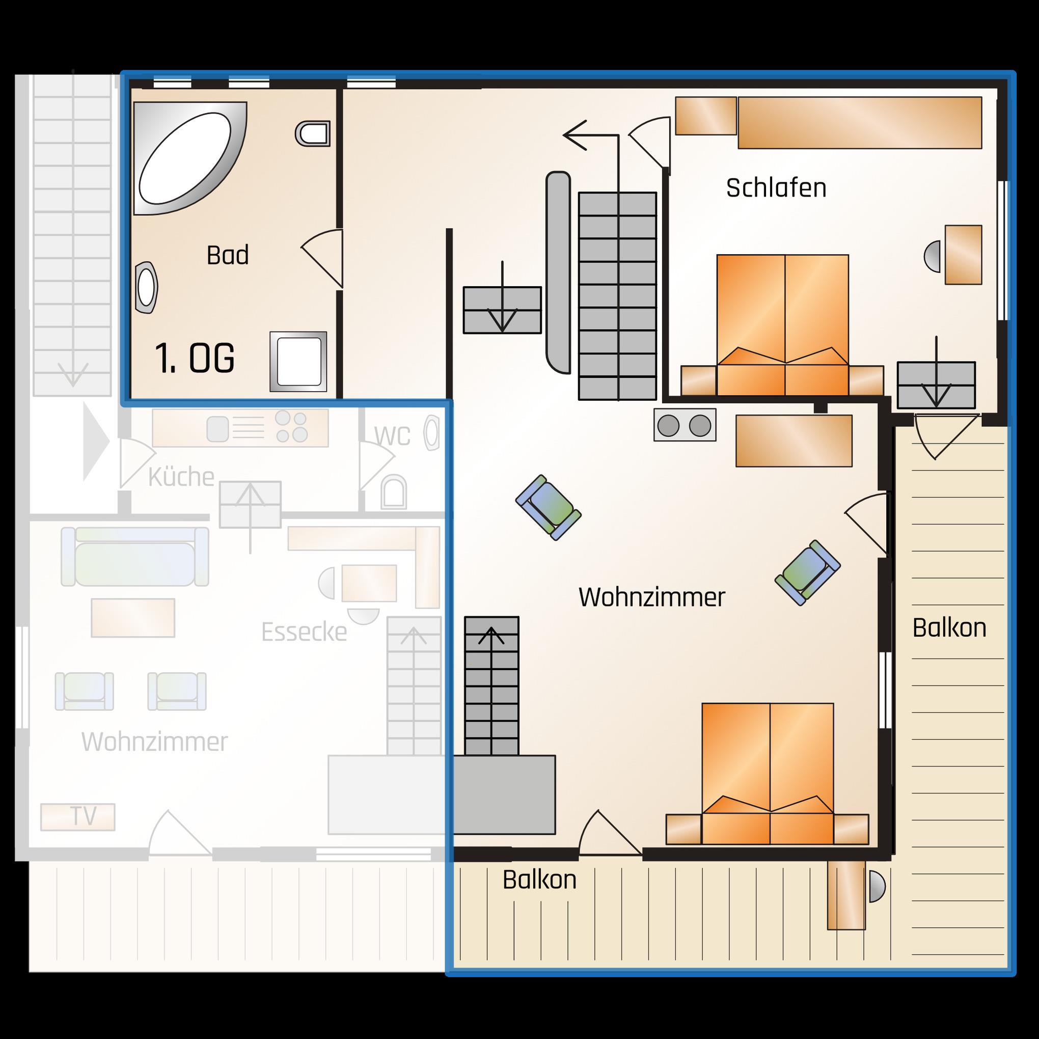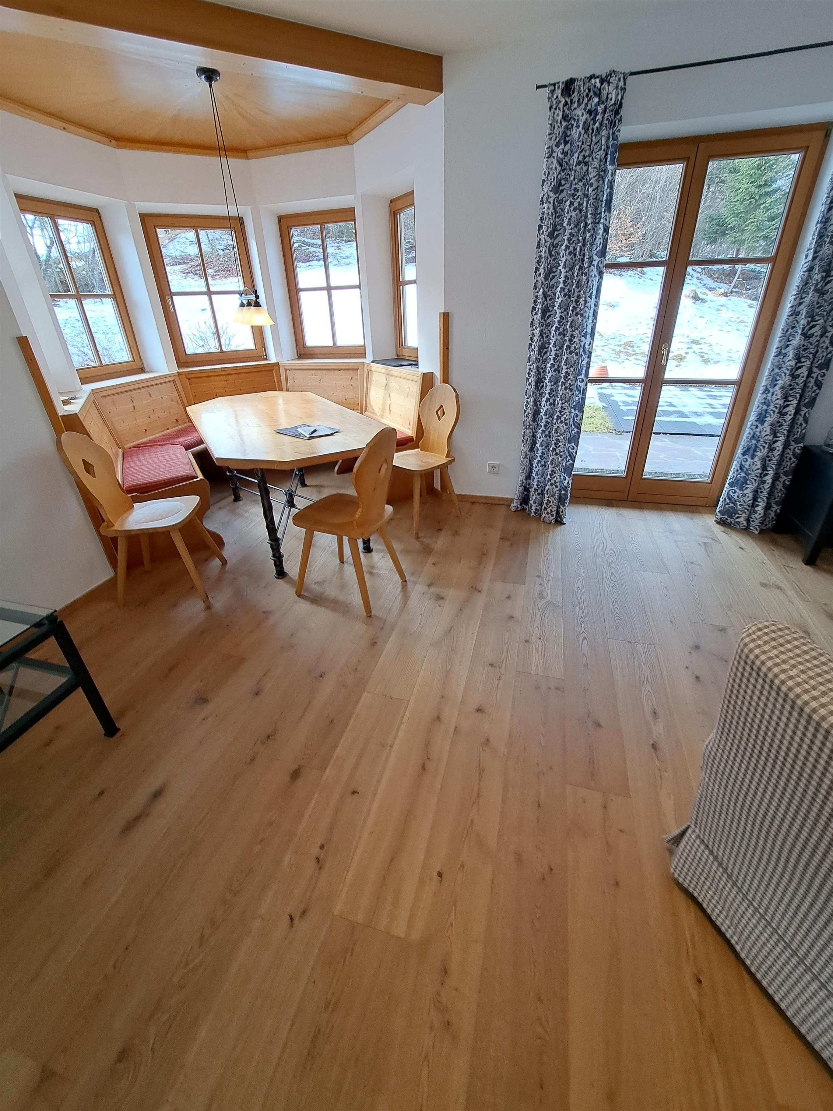 Das gemütliche Wohnzimmer und die Essecke im Erker bilden mit der neuen Luxus-Küche (Dez. 22) mit Ausstattung vom obersten Bord eine großzügige, offene Einheit, im Sommer herrlich erweitert mit Rundum-Terasse und Freisitz. Auch Diele und Eingangsbereich mit Gäste-WC bieten viel Platz zum Ankommen und sind neu renoviert. Im Erdgeschoss befindet sich ein Schlafzimmer mit zwei Einzelbetten (90x200cm). Im Obergeschoss können Sie im größten Schlafzimmer mit Galerie für Homeoffice-Pflichten einen Schwedenofen nutzen. Auf der Etage befindet sich ein zweites einladendes Schlafzimmer und das hochwertige Masterbad mit DU/WC/Badewanne. Große Balkone laden zu sonnigen Mußestunden mit Bergblick ein.
