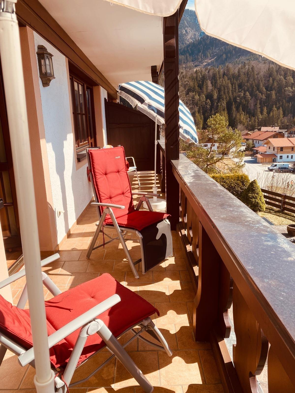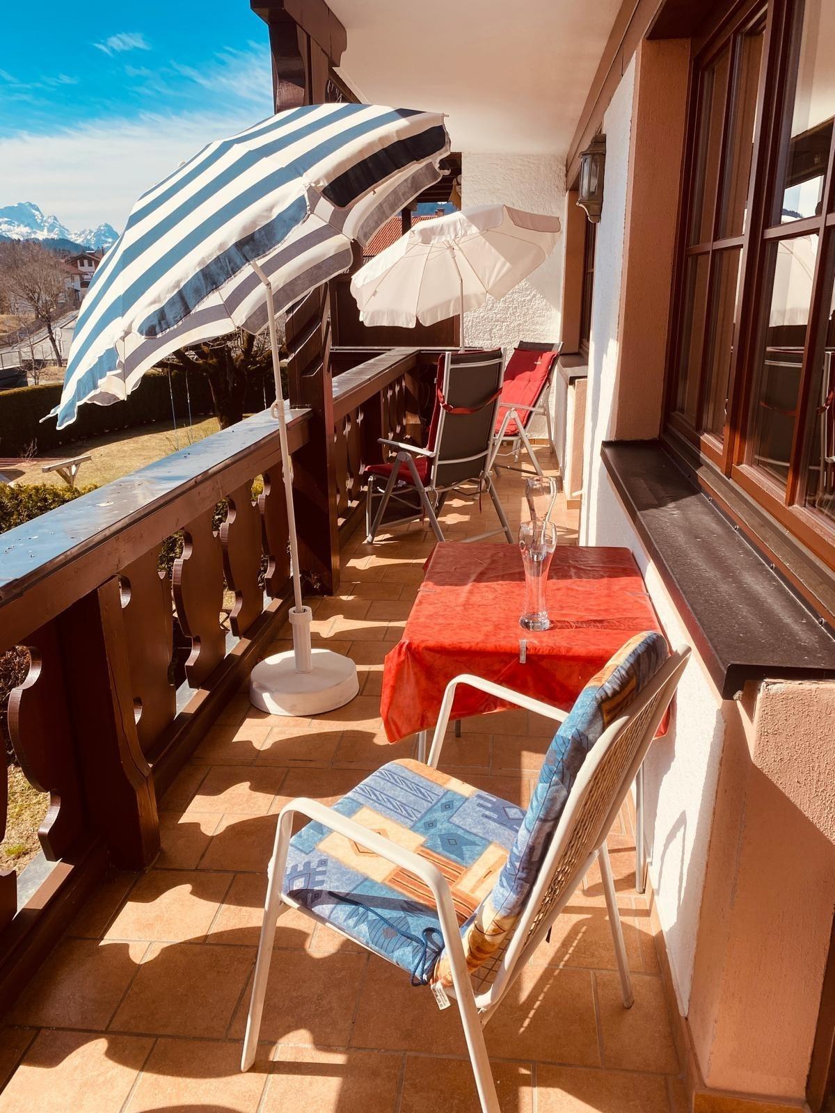 Ein sonniger Balkon für Frühstück mit Gipfelblick.