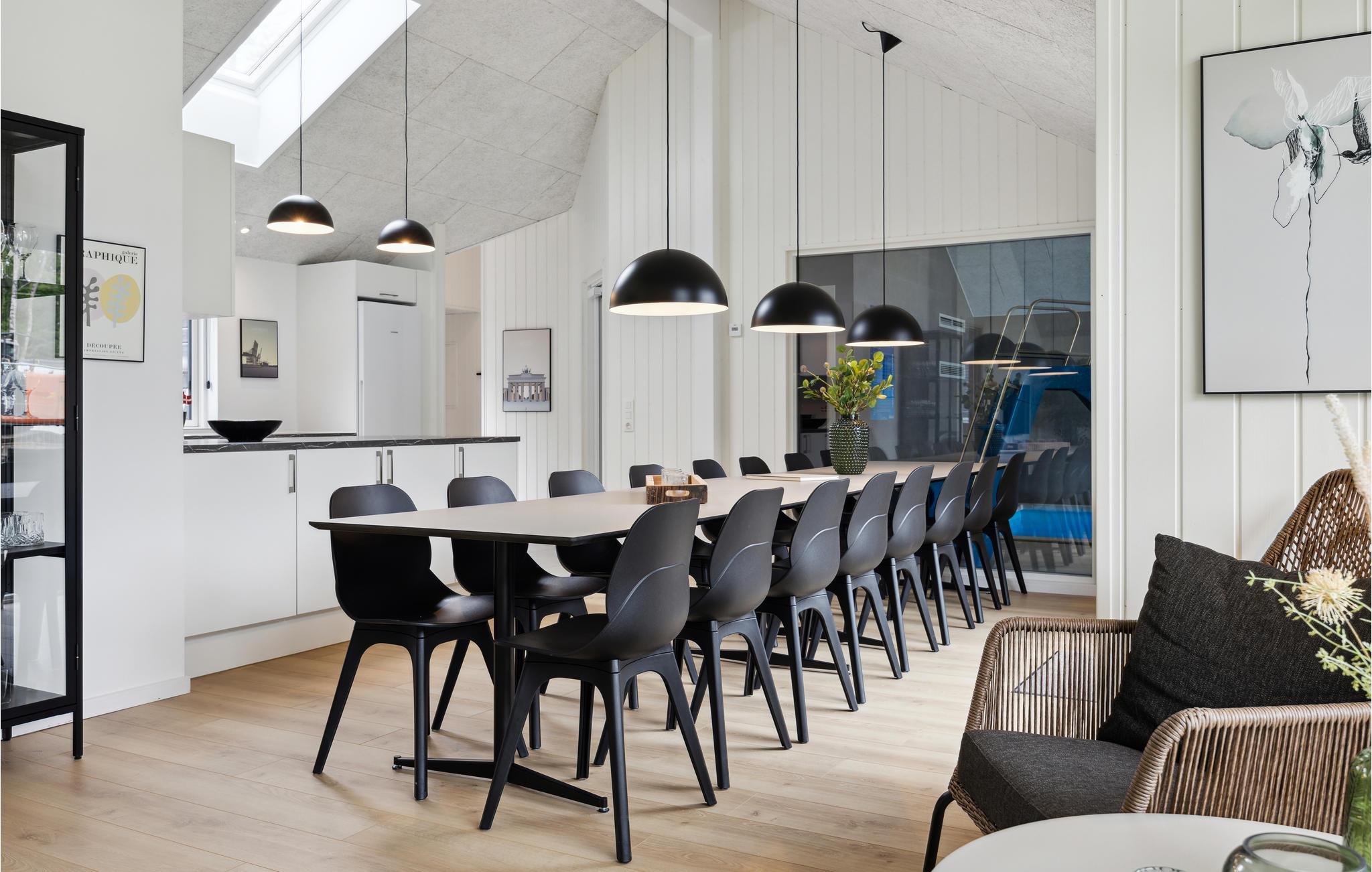Dette moderne feriehuset ligger i en liten feriehuslandsby i nærheten av Krakow am See og ikke langt fra Krakowsjøen. Det har et lyst interiør av høy kvalitet og mange komfortable og familievennlige fasiliteter. Husets midtpunkt er den vakre stuen med åpen kjøkkenløsning og plass til å lage mat sammen. Deretter kan dere nyte deilige måltider sammen ved det store spisebordet. Utfordre hverandre i bordtennis, bordfotball eller dart i aktivitetsrommet, og nyt en kald forfriskning i baren innimellom. Det vakre bassenget med vannsklie innbyr til timevis med moro for store og små. Eller nyt en massasje i det store boblebadet for 6 personer og slapp deretter av i din egen badstue. Huset har seks soverom og en hems med fire madrasser, som er spesielt egnet for barn som ønsker å finne seg til rette der. De tre badene kompletterer tilbudet og gjør huset svært godt egnet for flere familier eller venner.