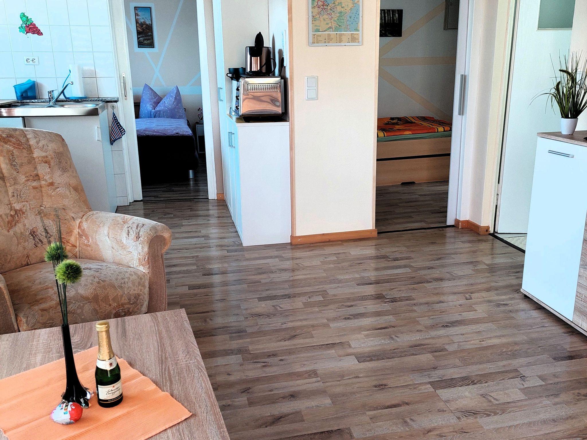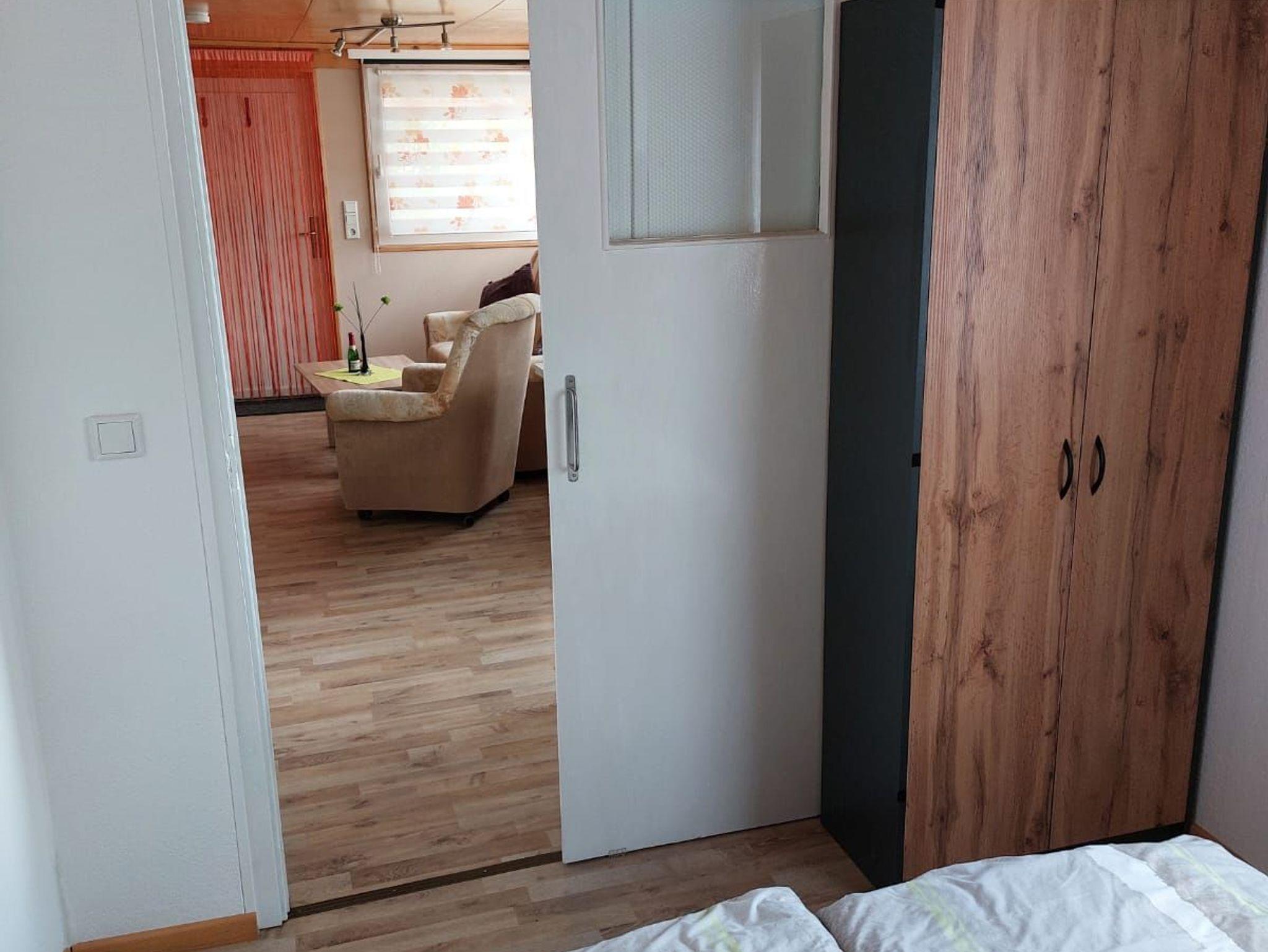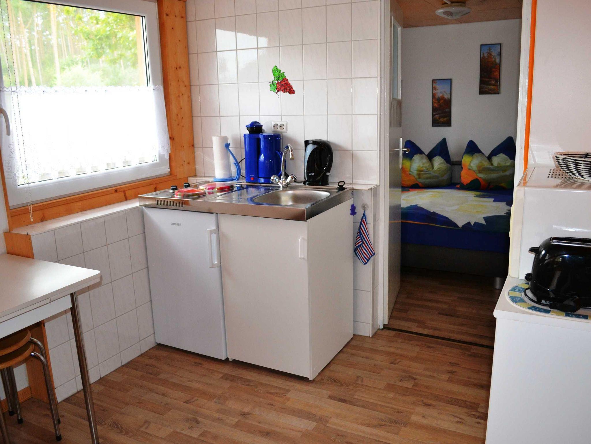 Der Wohnraum ist mit Sitz- und Essecke ausgestattet sowie einer Kochnische. Ein Kaminofen sorgt an kühleren Tagen für wohlige Wärme. Im kleinen Schlafzimmer gibt es ein Doppelbett und einen Kleiderschrank. Das Bett im Kinderzimmer kann bei Bedarf ausgezogen werden und dient als Aufbettung. Das Bad hat eine Dusche.
