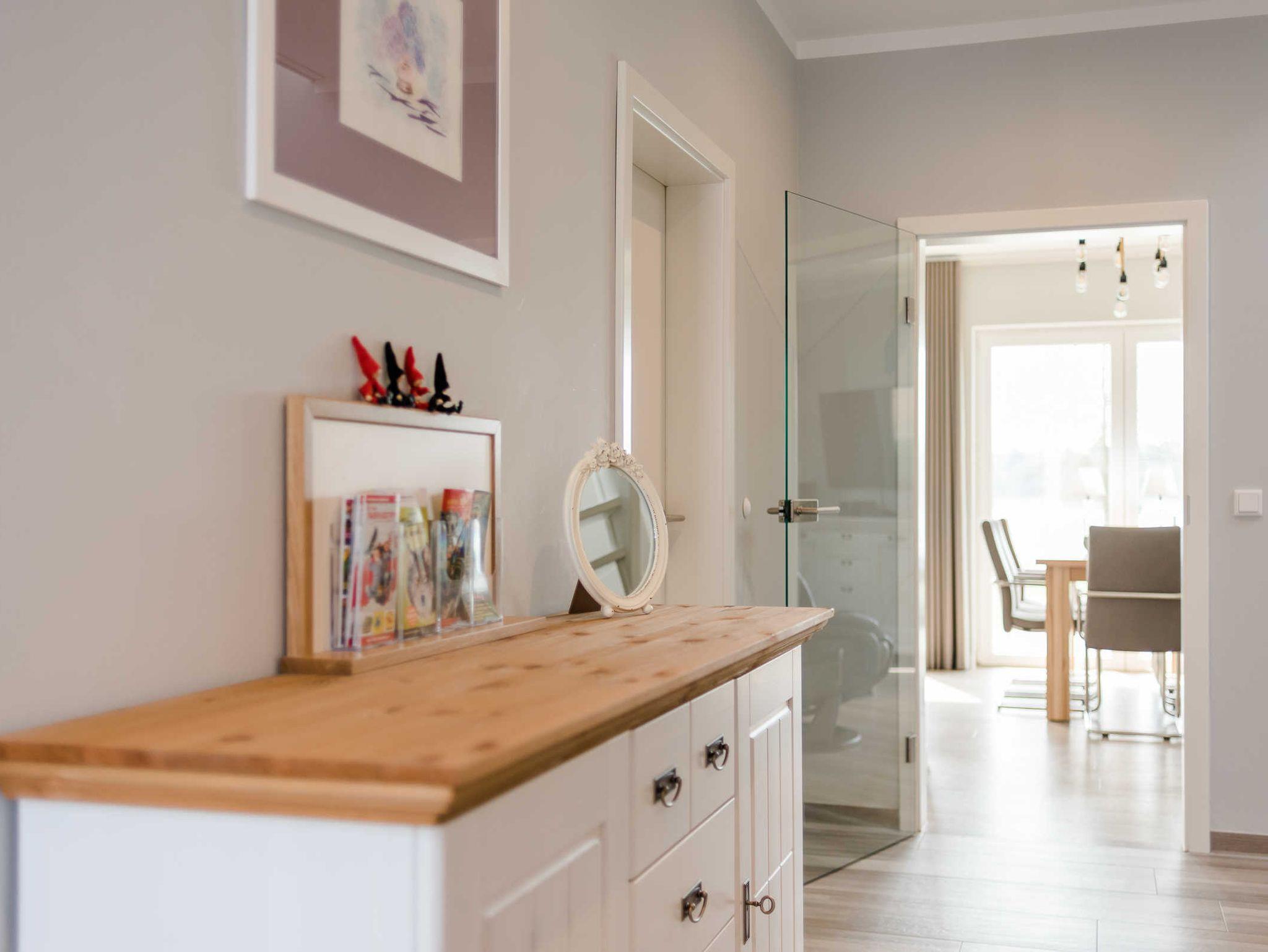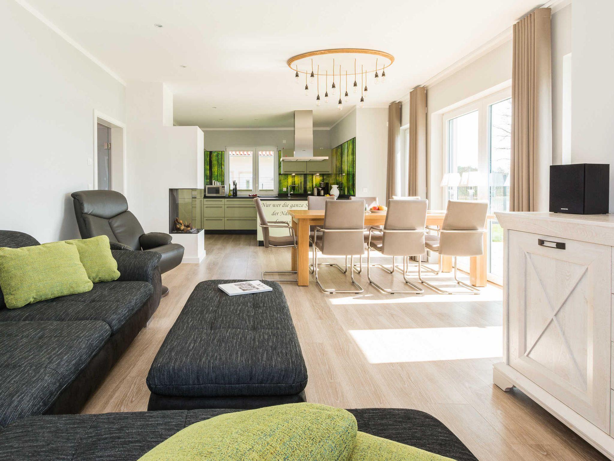 Sie betreten das Ferienhaus und gelangen nach dem Durchqueren des Flurbereiches in den geräumigen, lichtdurchfluteten Wohn- und Essbereich mit offener, vollausgestatteter Küche.