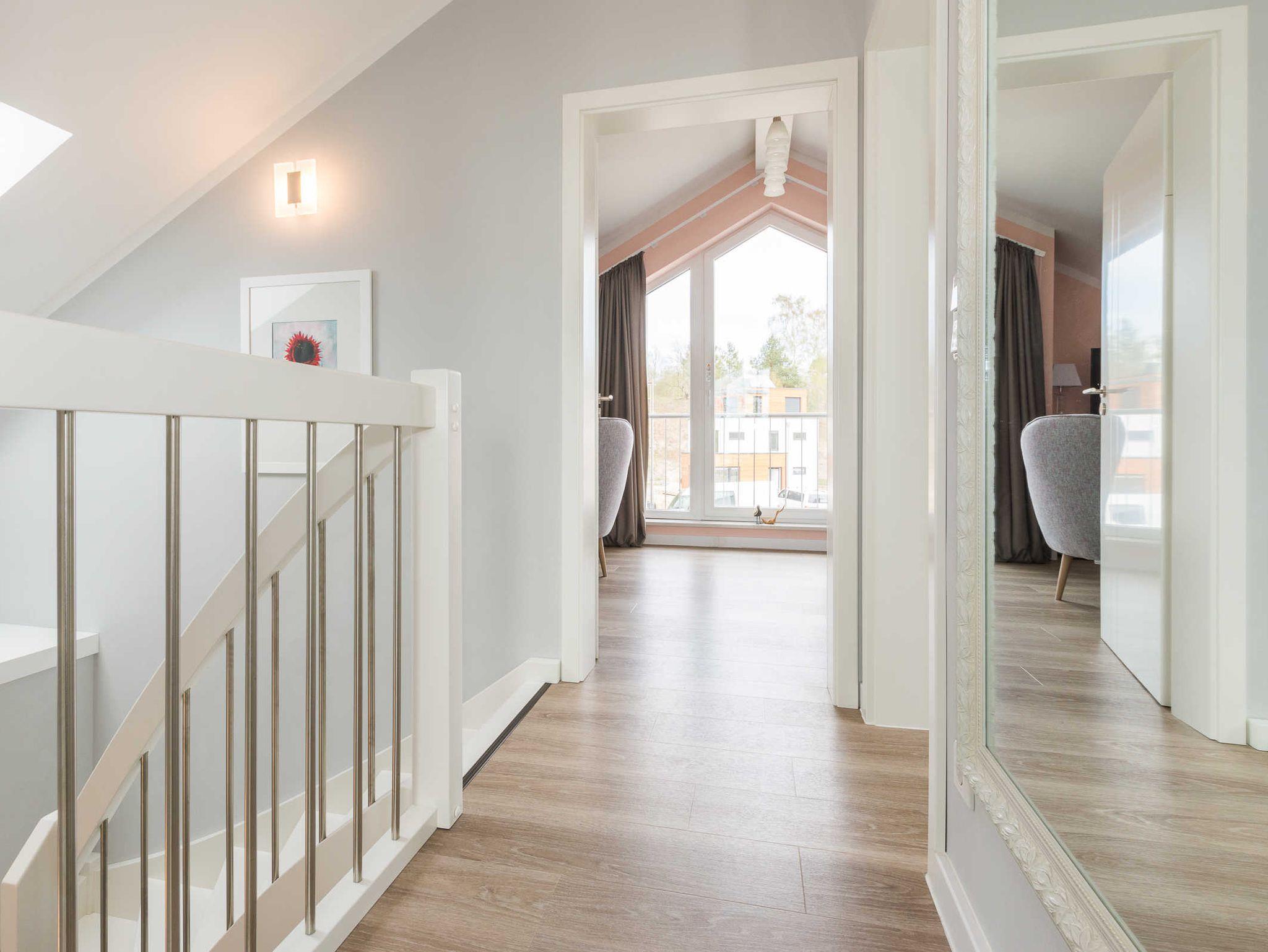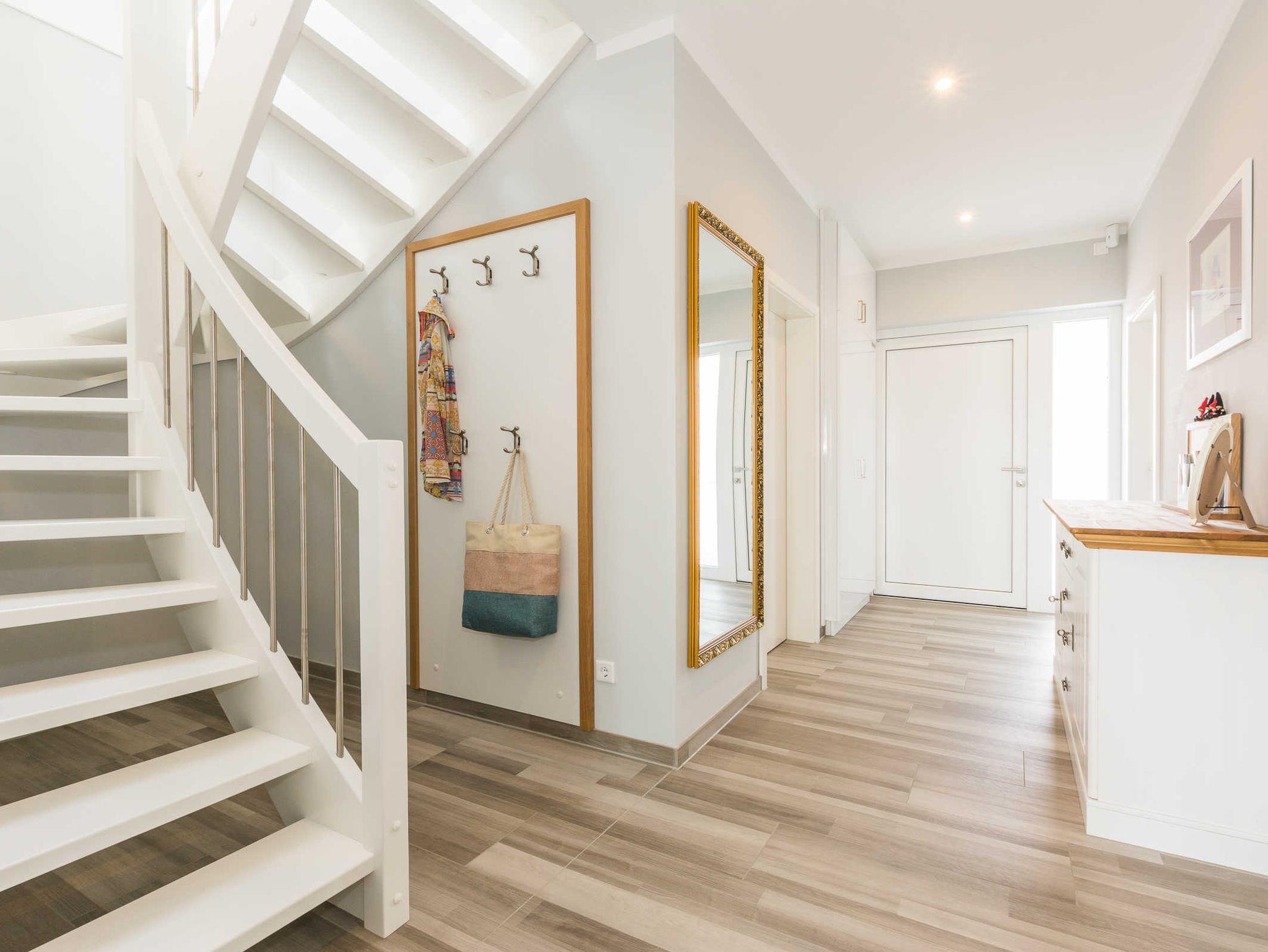 Eine hochwertige Holztreppe führt in das ebenfalls geräumige Obergeschoss. Hier befinden sich zwei weitere Schlafzimmer und ein Badezimmer.