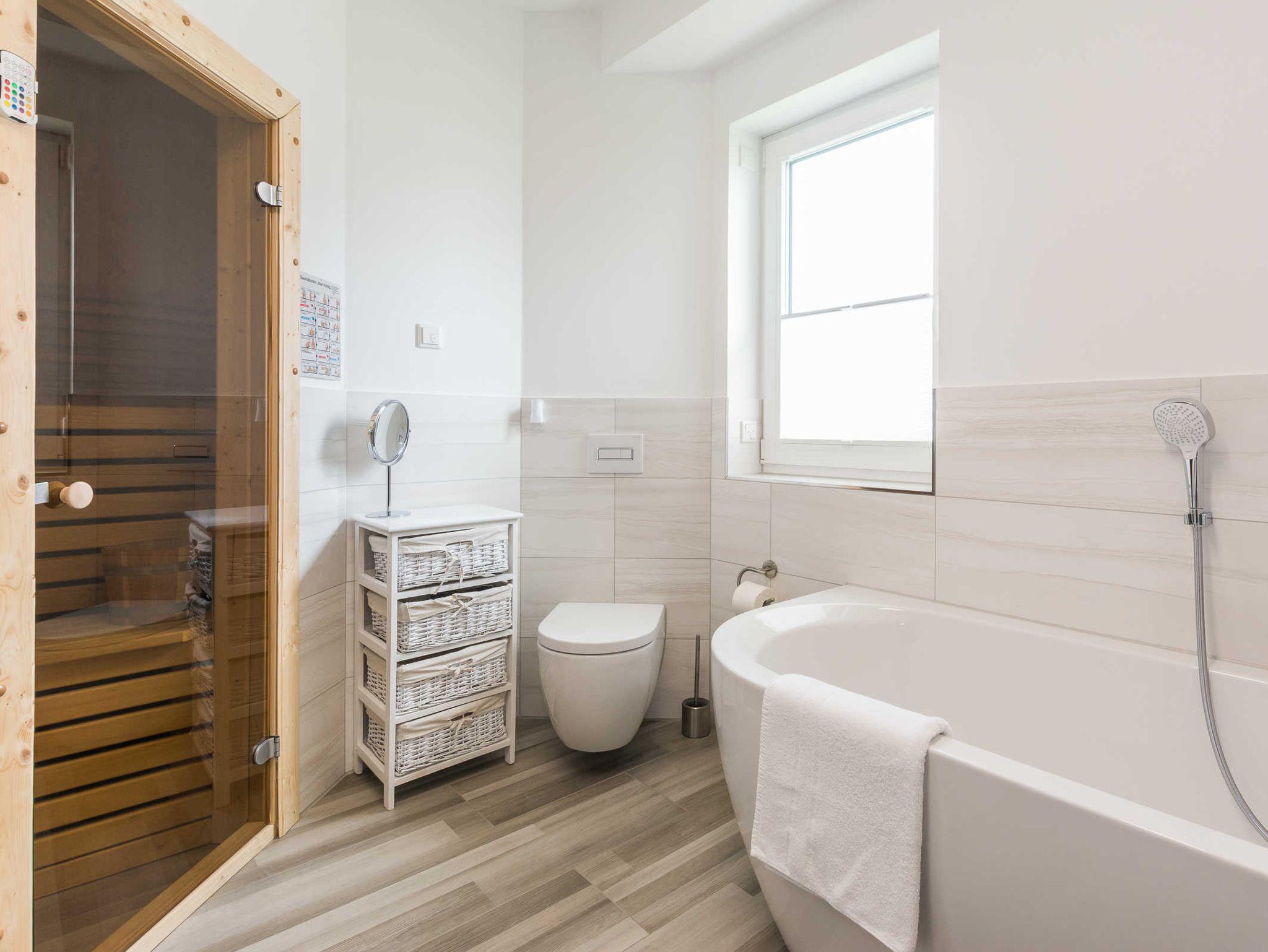 Tageslichtfenster, Sauna mit Lichtspiel, Badewanne, ebenerdige große Wellnessdusche, WC, Waschtisch, Handtuchtrockner, Fön, Kosmetikspiegel, Personenwaage