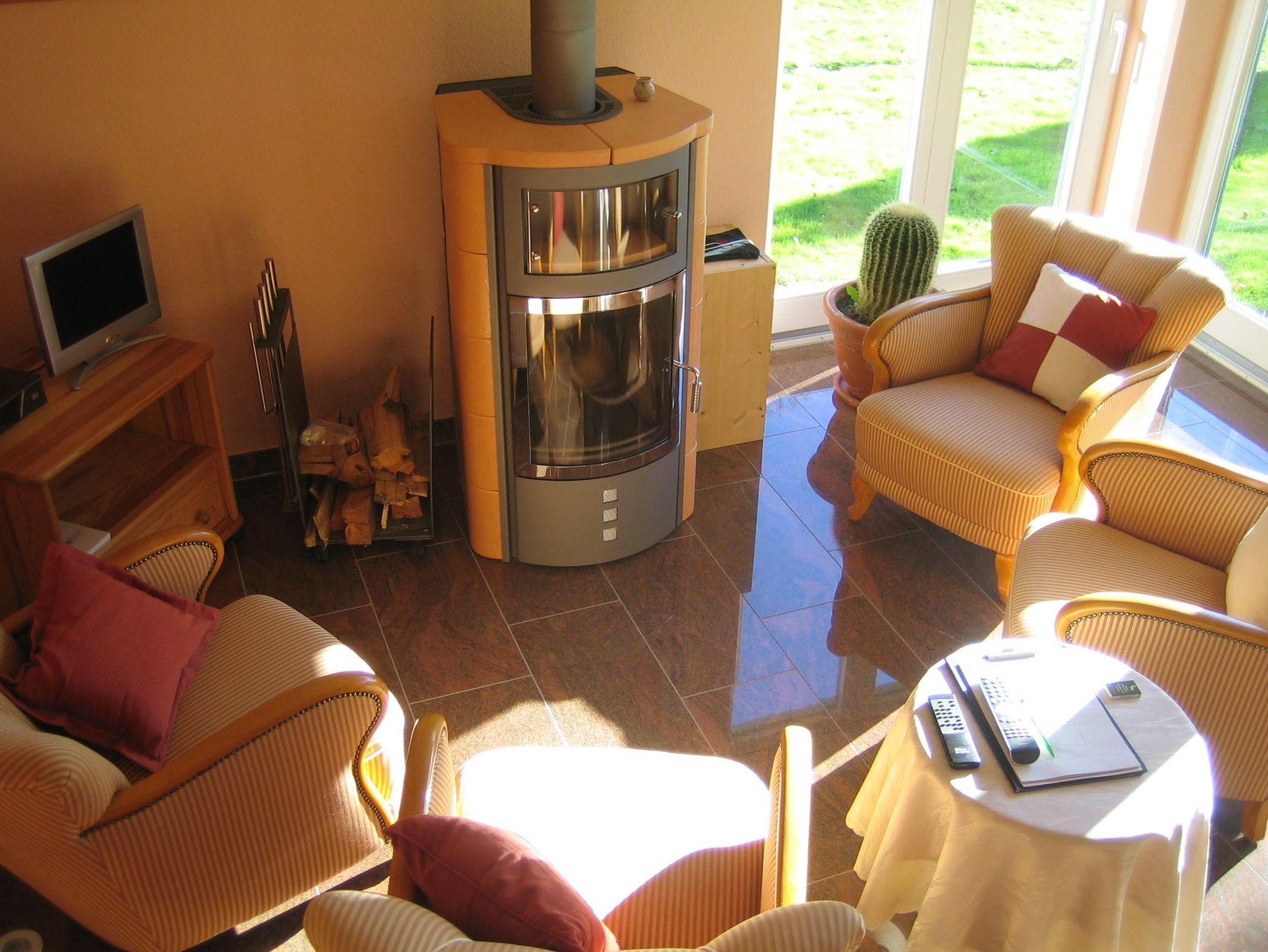 Der Wohnraum ist mit 4 gemütlichen Sesseln,TV/Radio und Kamin für besinnliche Abendstunden ausgestattet.