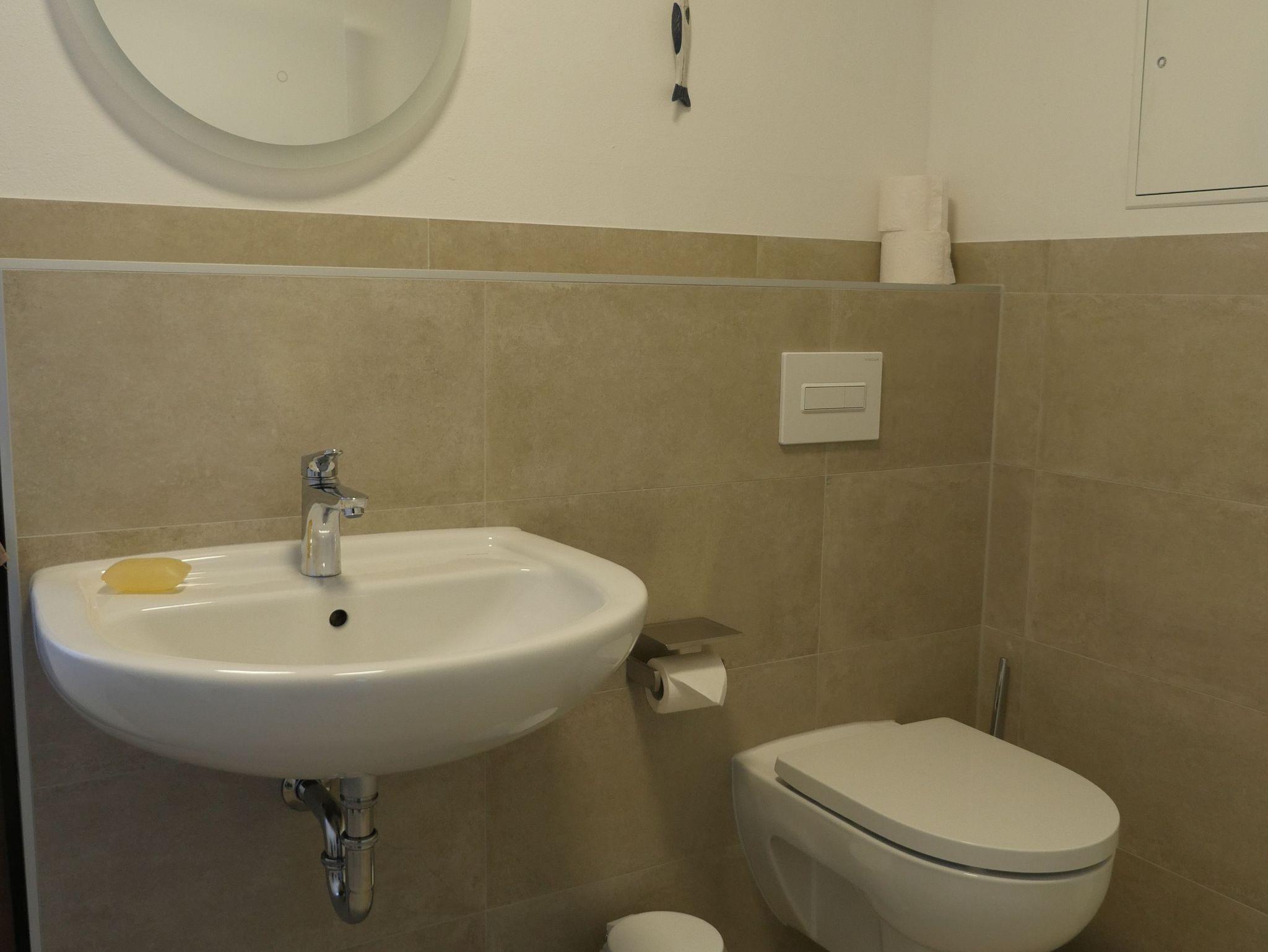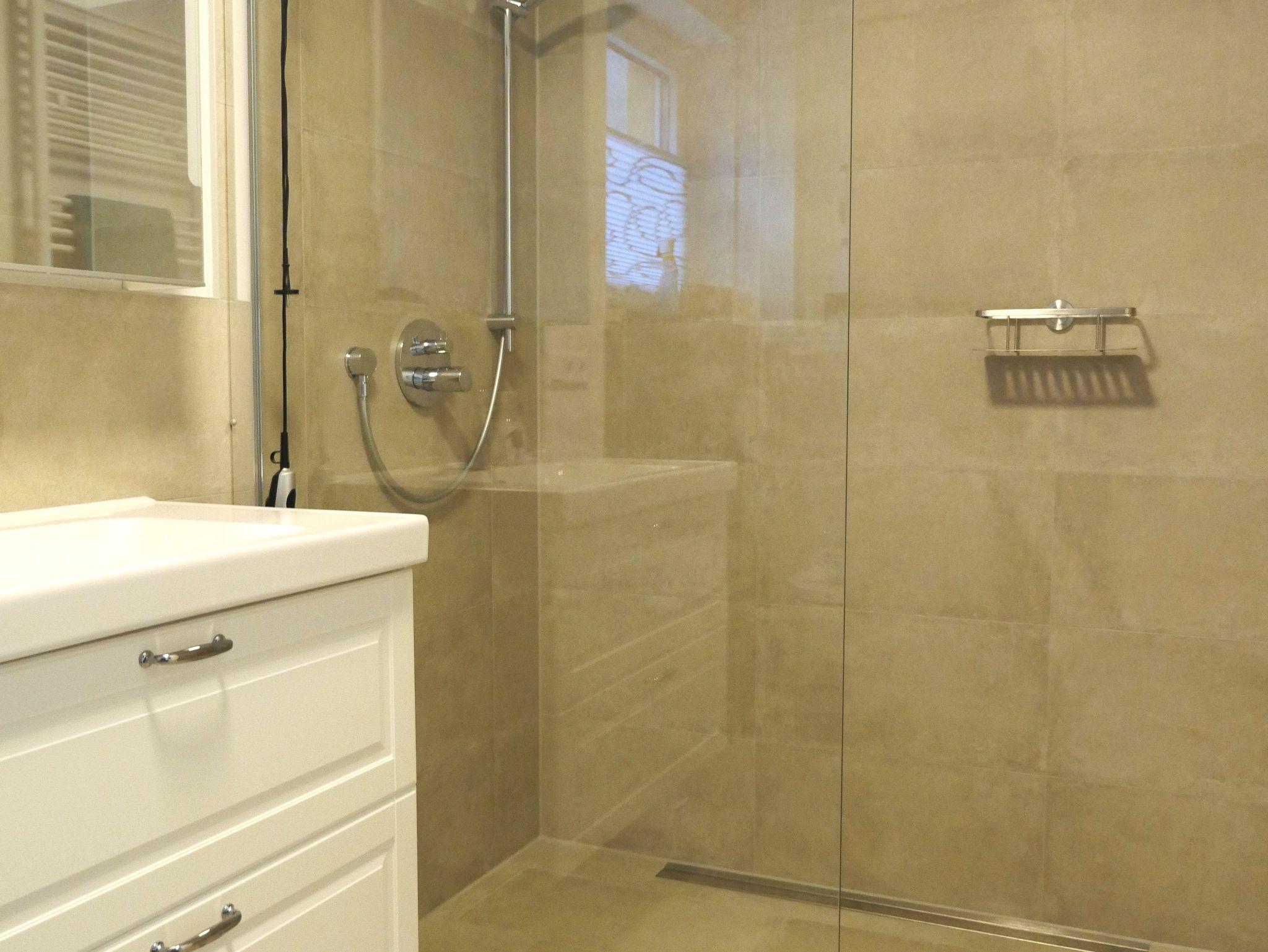 Sie möchten sich erst einmal frisch machen? Gleich links ist das Badezimmer mit Toilette und großzügigem Waschtisch sowie stufenlos begehbarer, geräumiger Dusche, Stauraum und Ablageflächen und einem Fenster zum Lüften. Im Sommer lässt sich der Badezimmerheizkörper separat mit Strom einschalten.