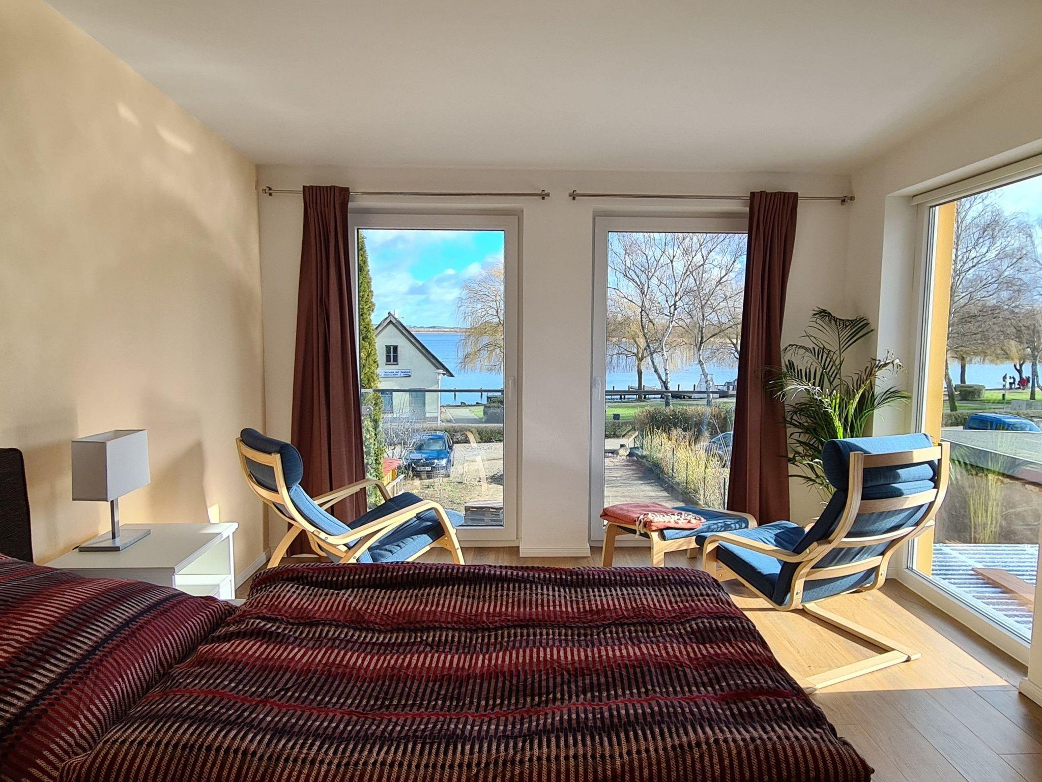 Dort befindet sich seeseitig das Schlafzimmer mit einem modernen Box-Springbett (1,80 x 2 Meter) und zwei Relax-Sesseln. Auch von hier aus können Sie den Seeblick durch zwei französische Fenster genießen. Ein weiteres bodentiefes Fenster lässt die Morgensonne herein oder Sie ziehen das lichtdichte Sonnenrollo herunter. Im Schlafzimmer ist eine Kommode mit mehreren Schubladen und am oberen Treppenabsatz befindet sich ein großer geräumiger Kleiderschrank.