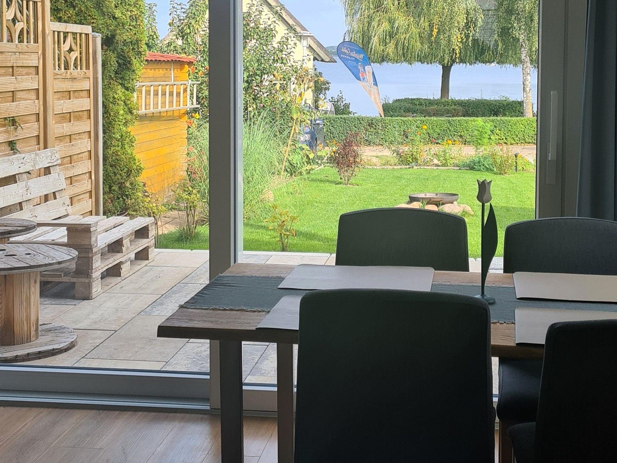 Die Haustür führt in den Eingangsbereich mit Treppenhaus. Von dort gehen Sie auf der Seeseite in den Wohnraum und finden den Esstisch, ein gemütliches Sofa sowie eine komplett ausgestattete Küchenzeile, inklusive Backofen und Spülmaschine. Die große Schiebeglastür lässt sich zur Terrasse hin öffnen. Von Wohnraum und Terrasse aus haben Sie einen herrlichen Seeblick.