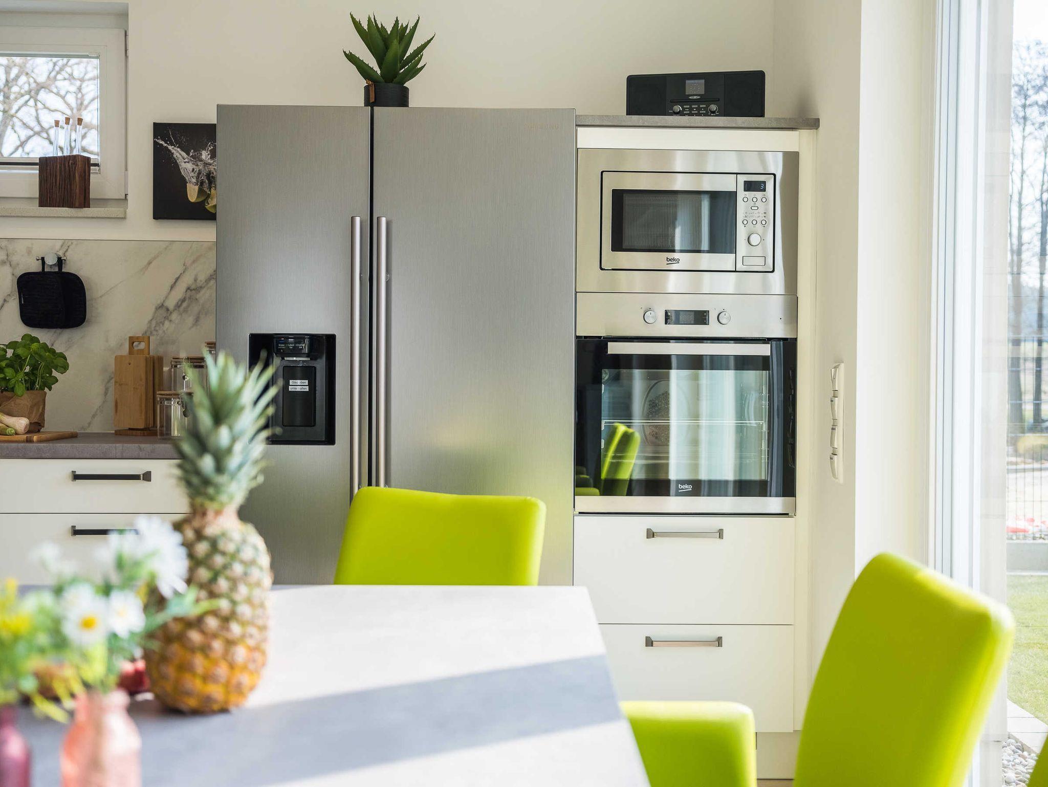 Der lichtdurchflutete Wohn- Essbereich mit offener, vollausgestatteter Küche lädt zum Kochen, Essen und gemeinsamen Miteinander ein. Für regelmäßig kühle Drinks und frische Eiswürfel steht Ihnen ein exklusiver Side-by-Side Kühlschrank mit Eiswürfelspender zur Verfügung.