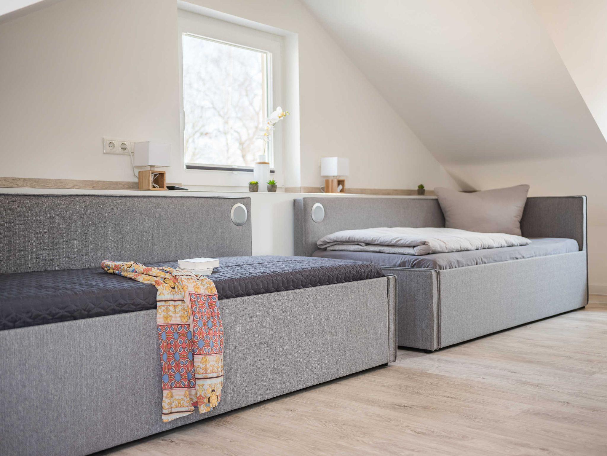 Dachschrägen und Möbel aus massivem Eichenholz sind ein echter Blickfang und werden von abgestimmten Accessoires harmonisch ergänzt. Beide Schlafzimmer sind mit einem Fernseher ausgestattet. Elektrische Rollläden helfen dabei, seligen Schlaf zu finden.