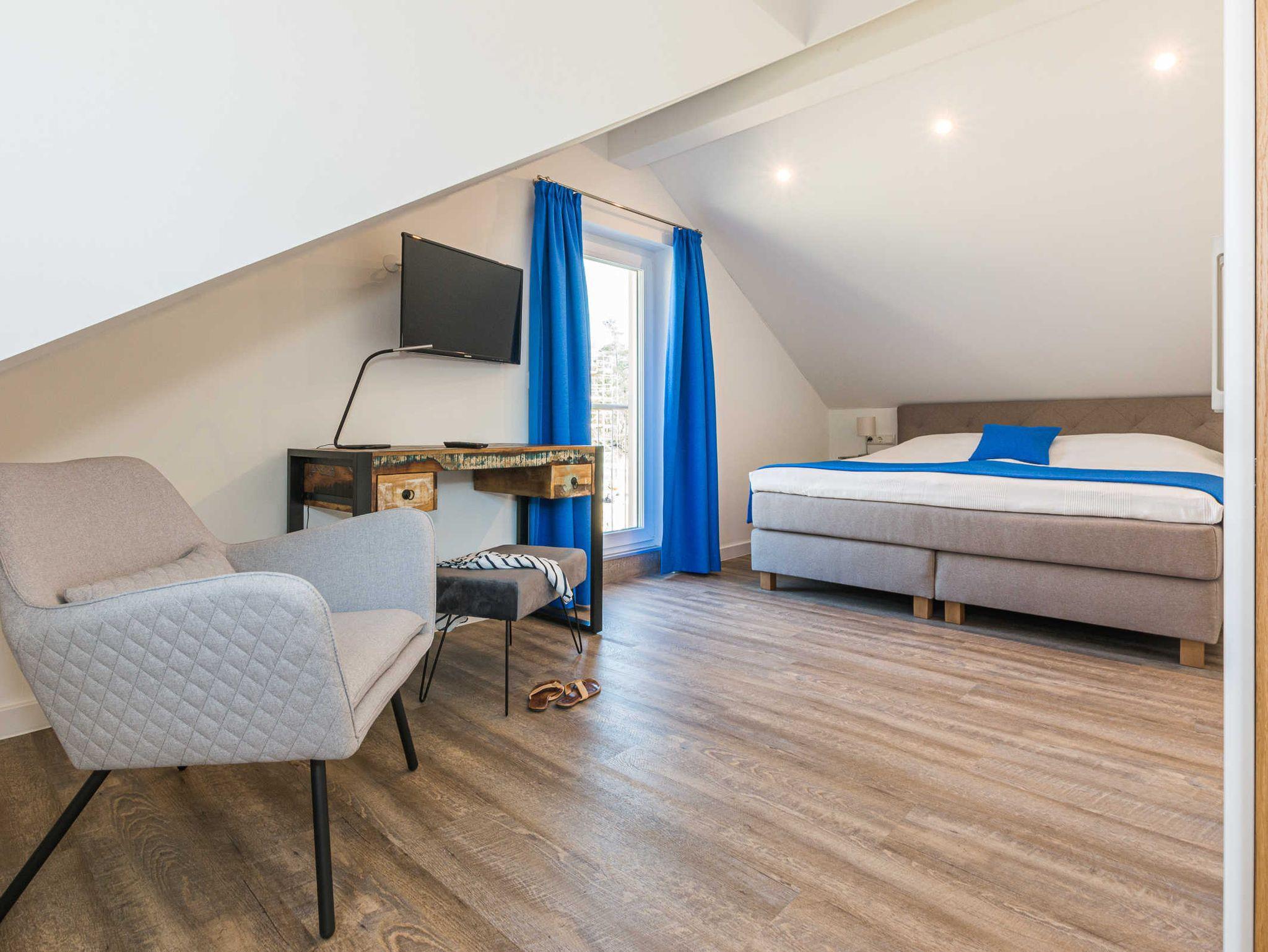 - 2 Schlafzimmer mit hochwertigen Boxspringbetten, TV, Schreibtisch und elektrischen Rollläden