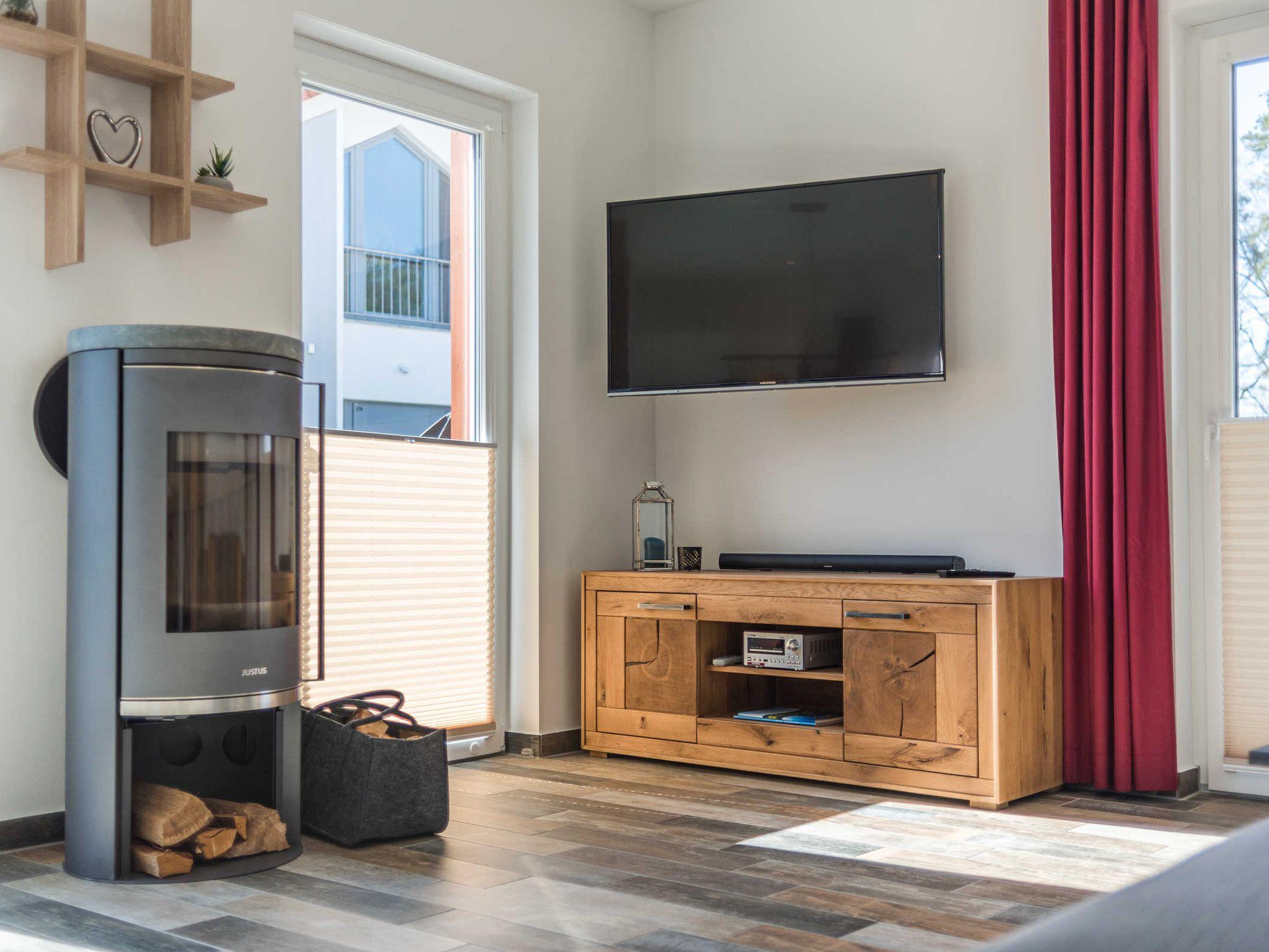 Esstisch mit 4 Stühlen, Couchecke, Couchtisch, Kaminofen, TV-Flachbild UHD, Soundbar, Radio/CD/DVD-Player Spielesammlung