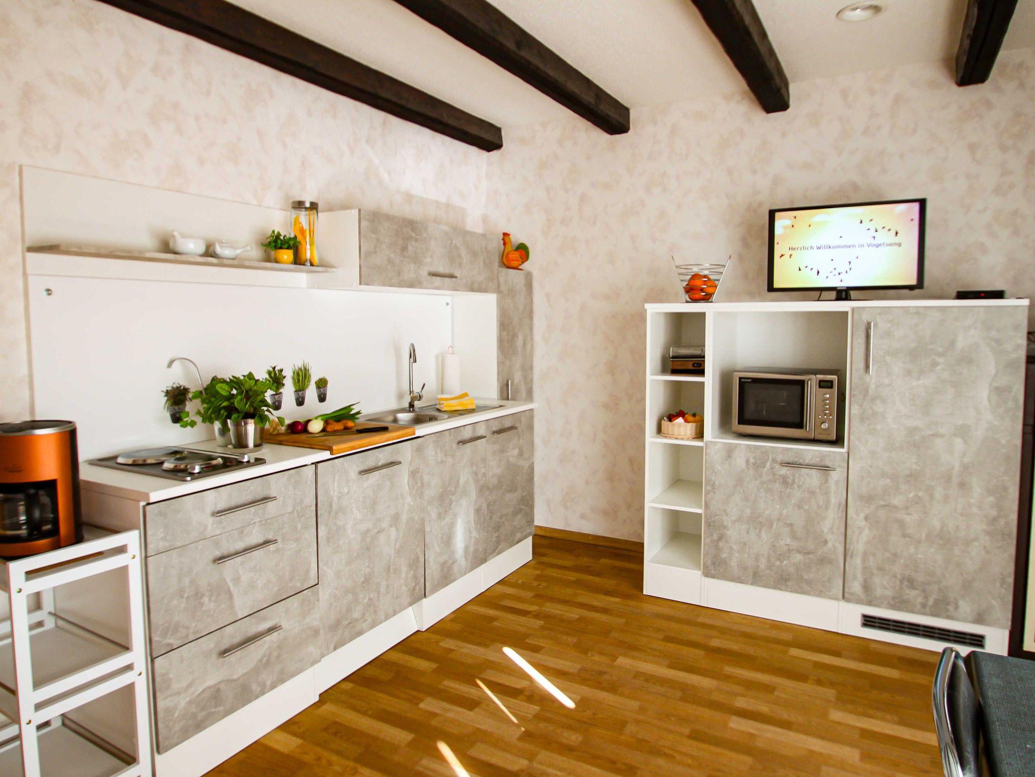 In der 1. Etage liegen die Ferienwohnung Schwalbennest mit ca. 105 m², drei Schlafzimmern und Platz für bis zu sechs Personen sowie die Ferienwohnung Eulennest mit ca. 73 m², zwei Schlafzimmern und Platz für bis zu vier Personen. Im Erdgeschoss befindet sich das Spatzennest, ein ca. 41 m² großes Appartement für bis zu zwei Personen. Alle Wohnungen sind modern eingerichtet. Je nach Wohneinheit schaffen sichtbares Fachwerkgebälk und Oberlichter in den Decken eine helle, freundliche Atmosphäre.