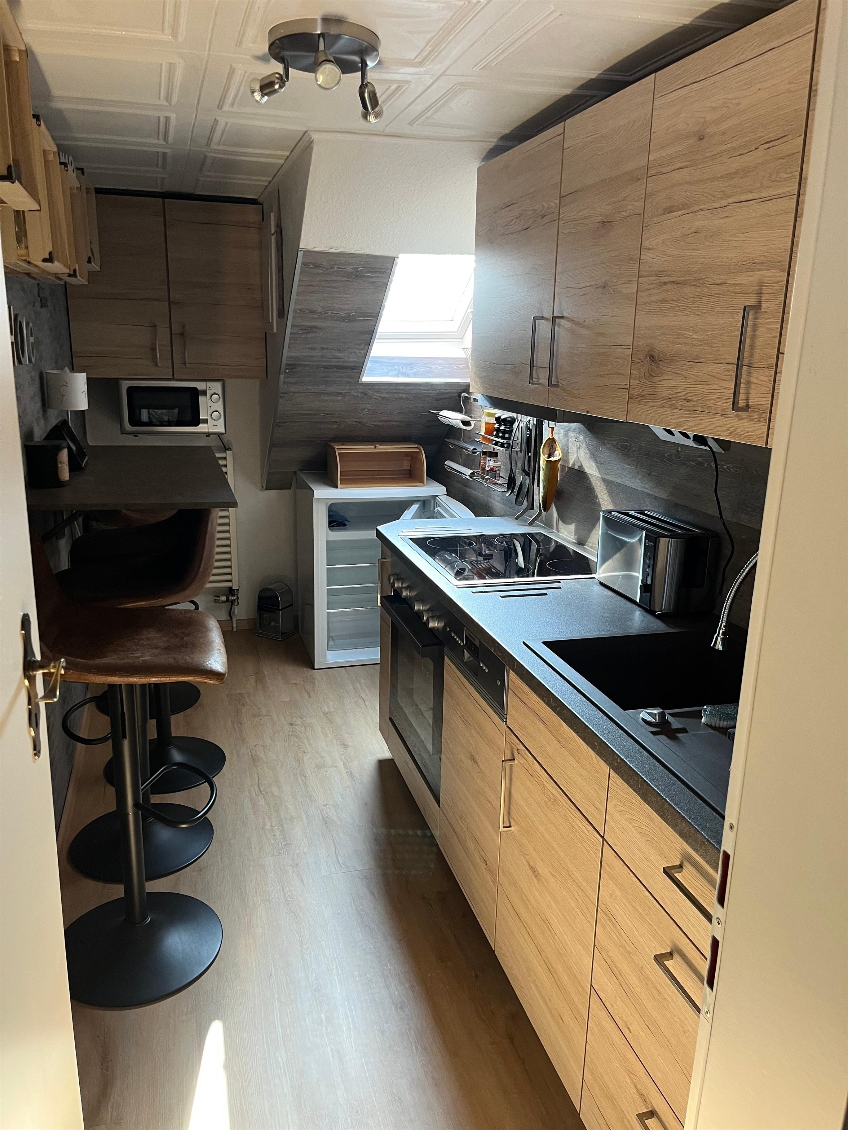 Die Küche ist komplett neu und modern eingerichtet und verfügt über eine Ceranfeld, Microwelle, Backofen, Kaffeemaschine, Kühlschrank mit Gefrierfach, Spülmaschine, Uhr, Toaster, Geschirr, Gläser, Töpfe, Pfannen usw.