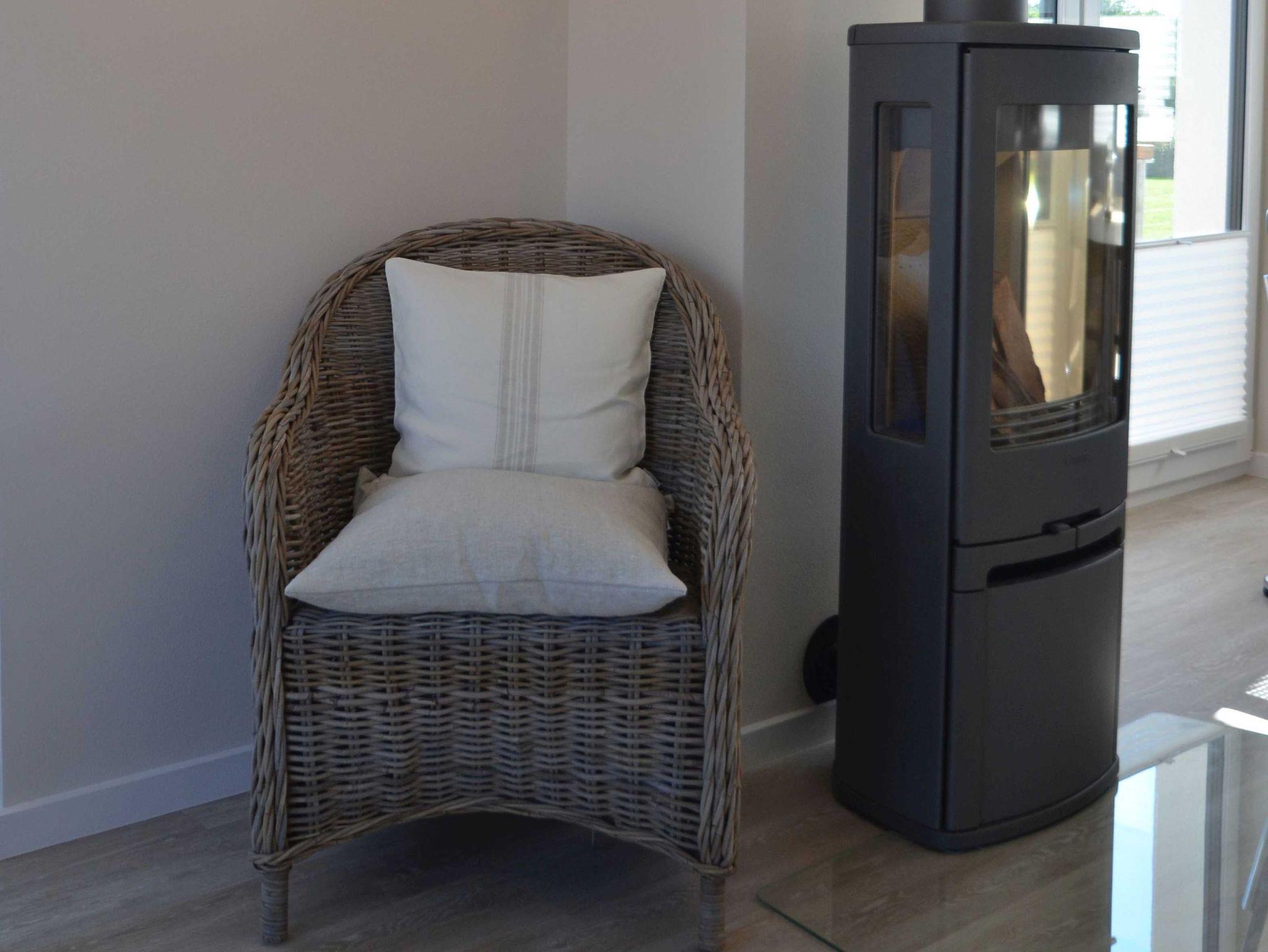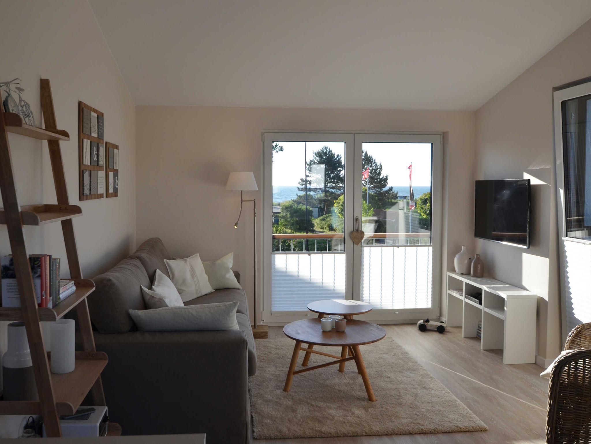 Der Wohnbereich ist lichtdurchflutet, der Blick auf die Ostsee immer wieder faszinierend. Die hochwertigen Möbel (wie Thonet-Stühle) und die Farbgestaltung in Beige und Braun machen die Ferienwohnung Ærø zu etwas ganz Besonderem.