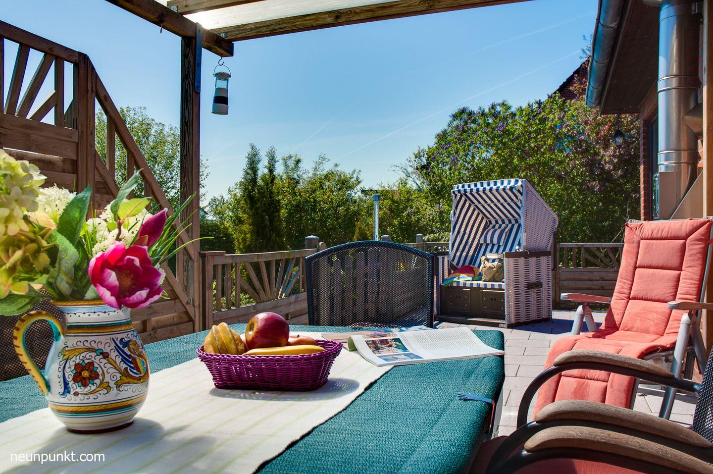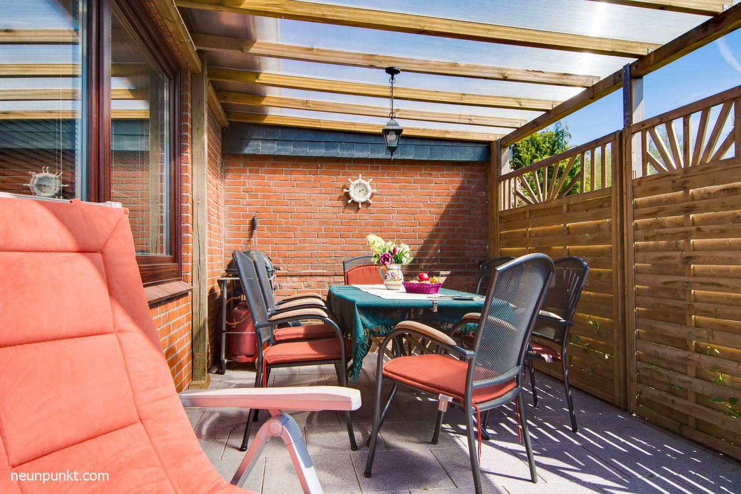 Auf der teil-überdachten Terrasse können Sie bei jedem Wetter grillen.