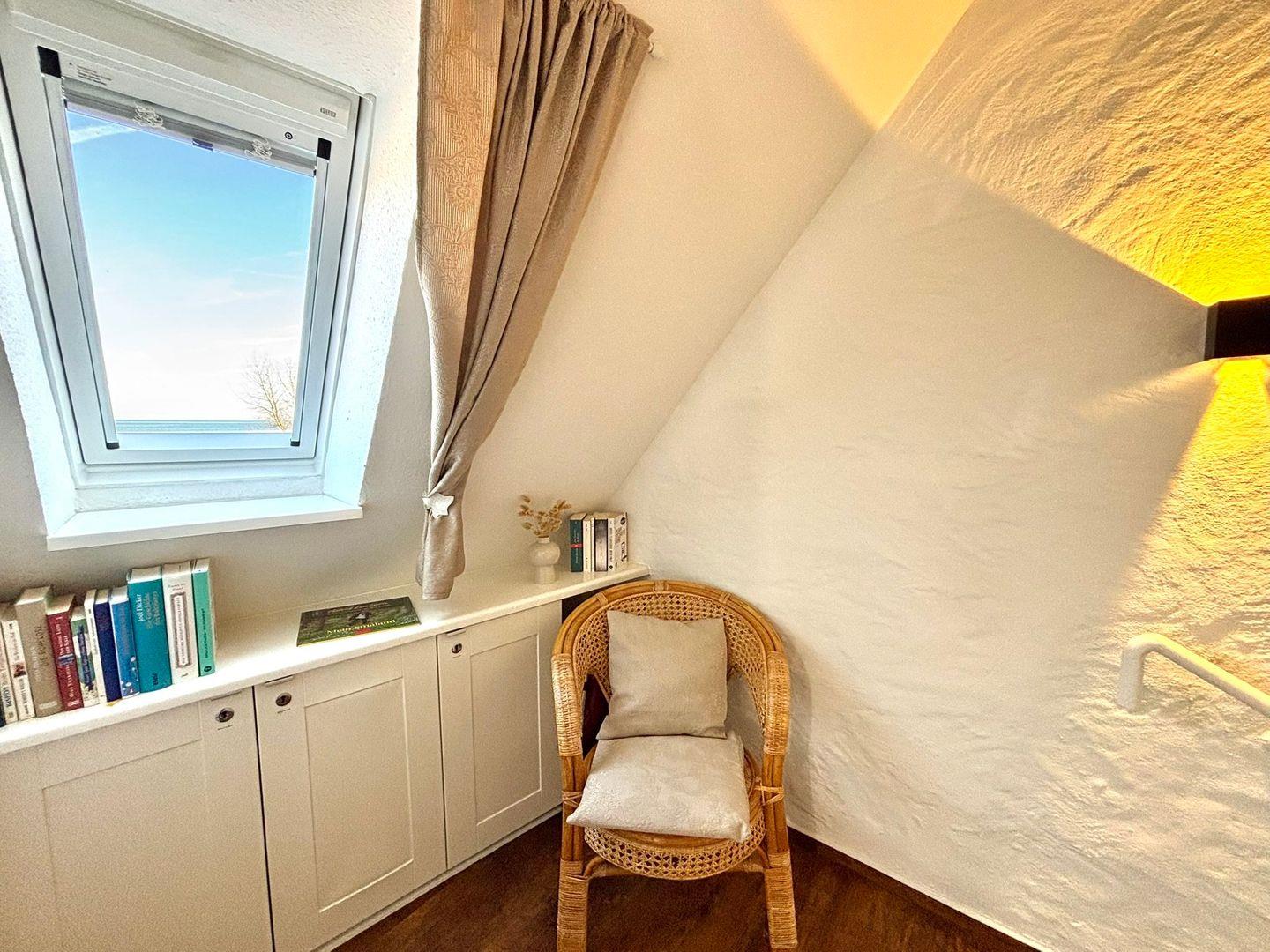 Im Dachgeschoss befindet sich eine Leseecke, der zweite Schlafraum ist mit einem Doppelbett (2x 80x200cm) und einem weiteren Einzelbett (90x200cm) ausgestattet.