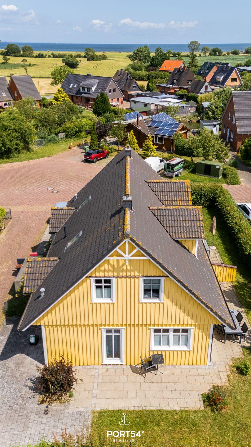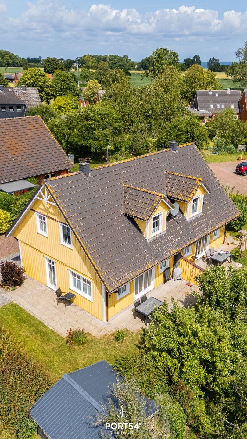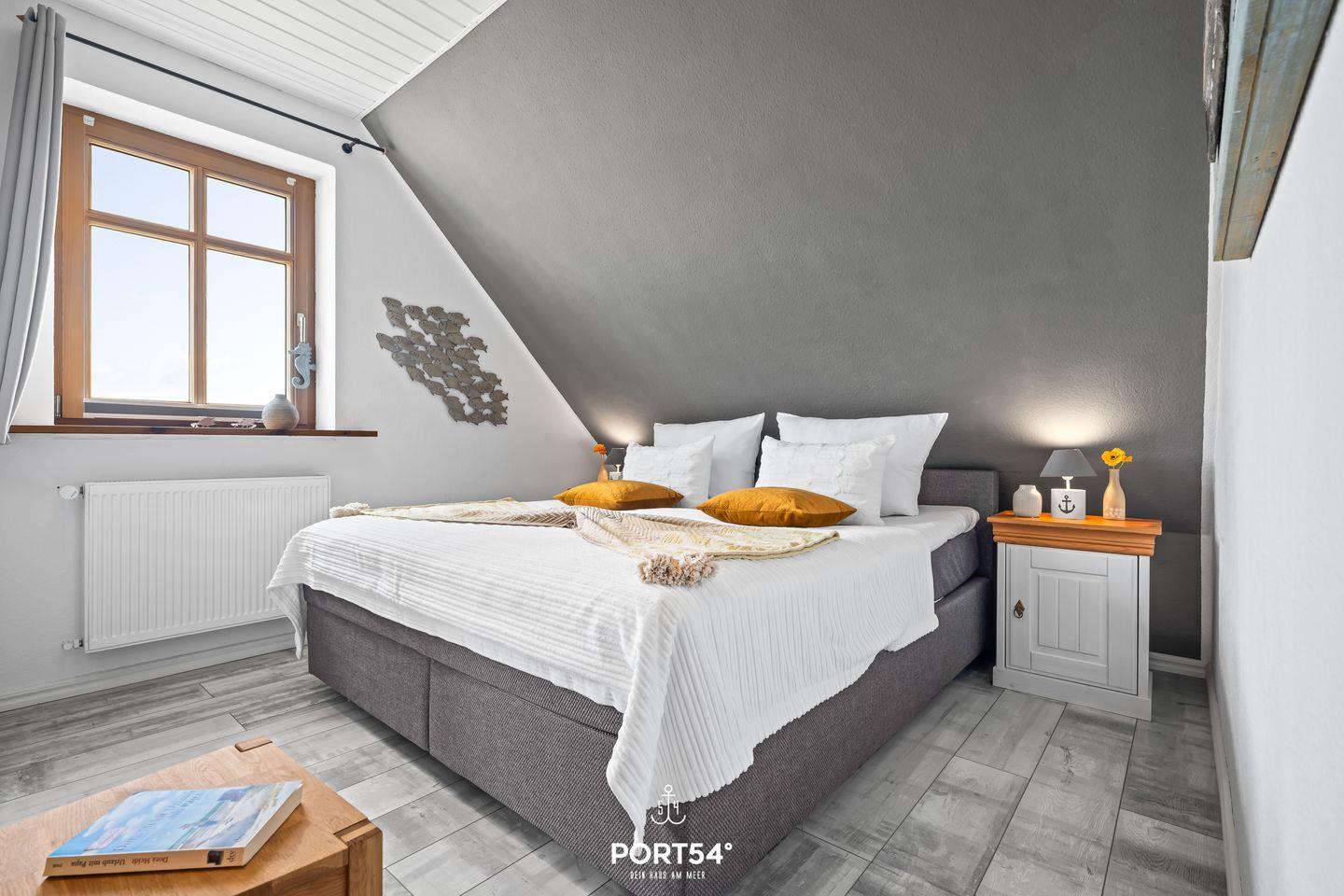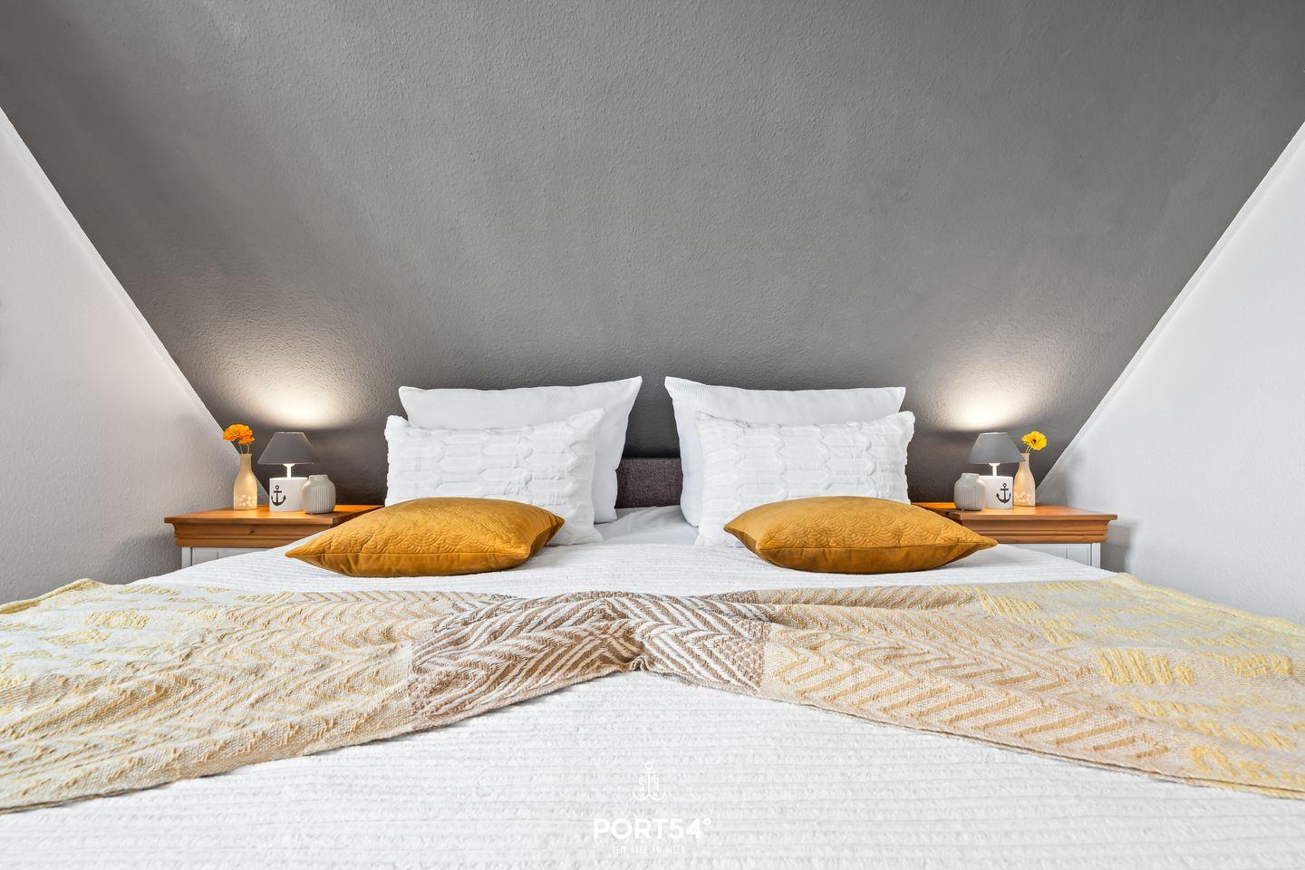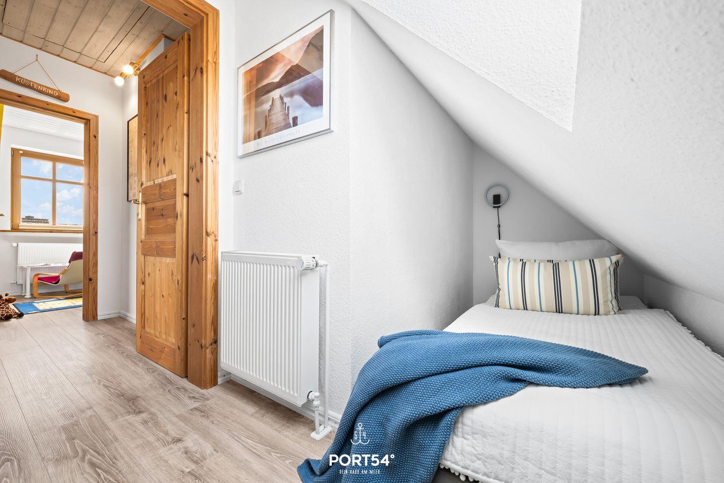 Ein drittes Schlafzimmer unter den Dachschrägen bietet mit einem Einzelbett einen weiteren Schlafplatz. Ein besonderes Plus: Unsere Ferienhäuser "Pfefferminza" und "Pippilotta" liegen direkt nebeneinander und können zusammen gebucht werden – ideal für Großfamilien oder Urlaub mit Freunden.