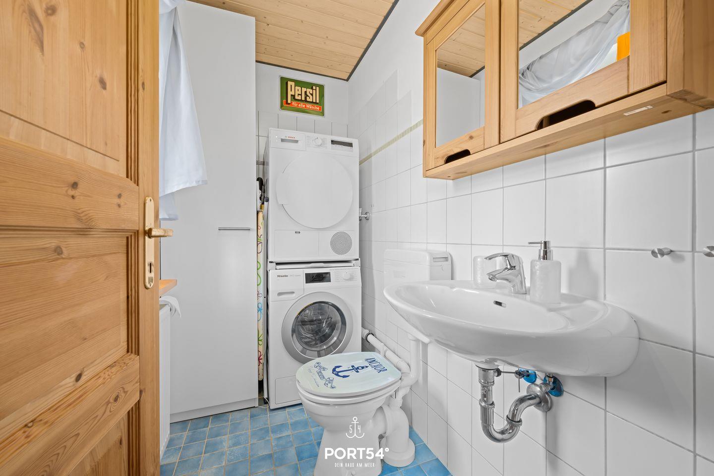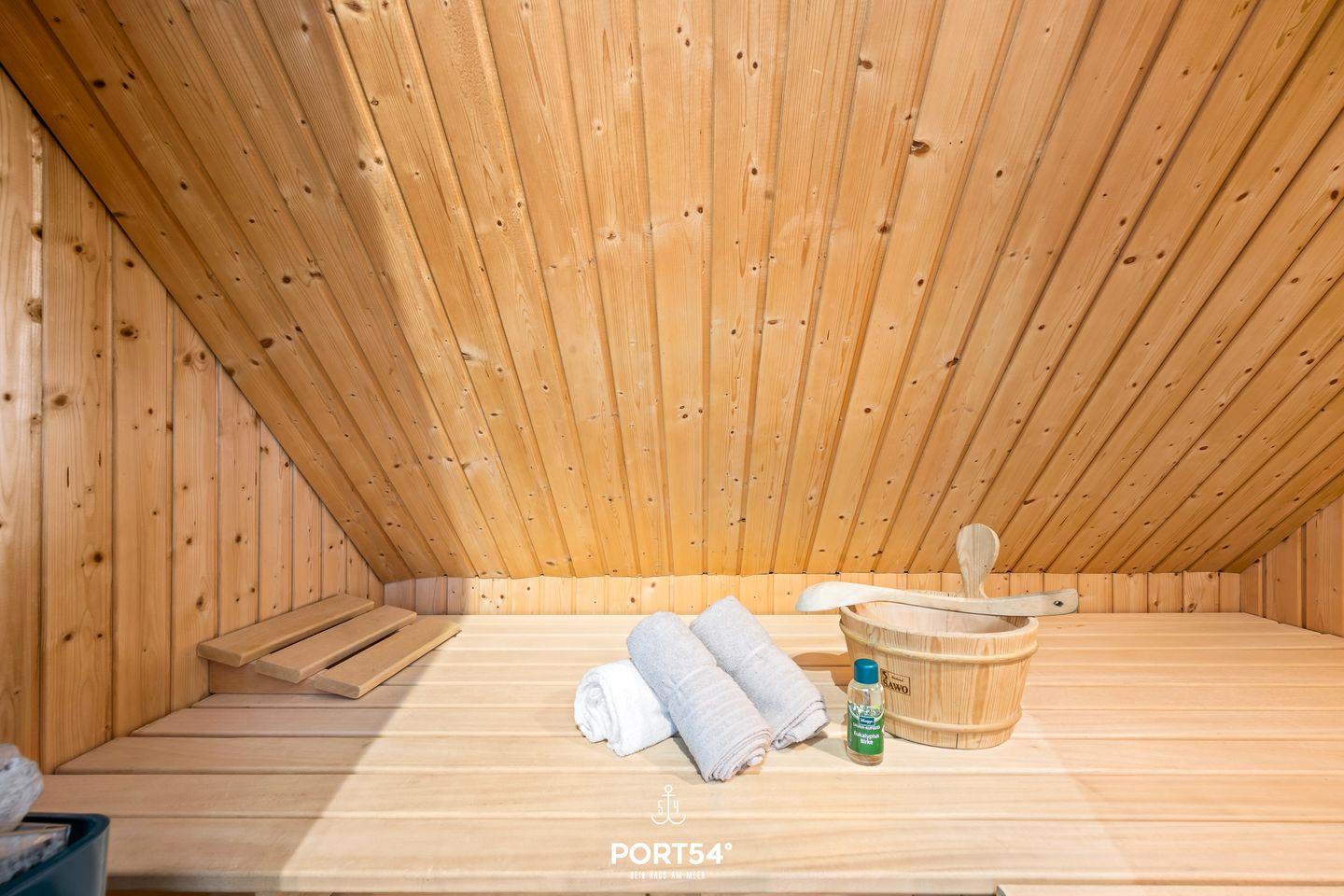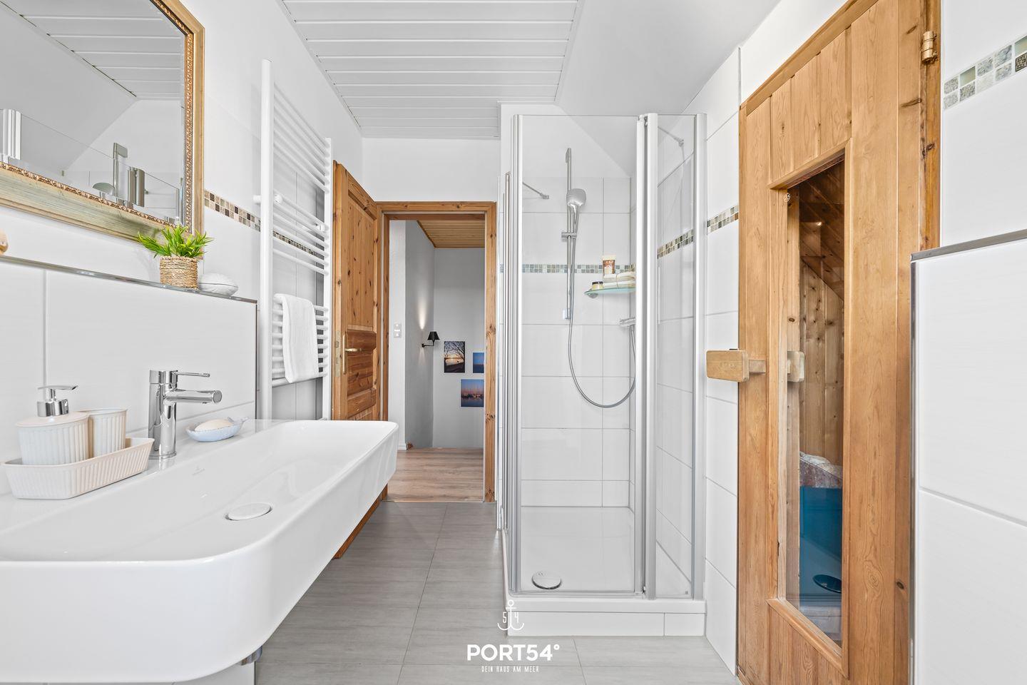 Im Obergeschoss befindet sich das Tageslicht-Duschbad, das mit einem kleinen Kosmetikspiegel, einem Handtuchheizkörper und einem Föhn ausgestattet ist. Ein echtes Highlight ist die hauseigene Finnische Sauna – ideal für entspannte Wellnessmomente nach einem erlebnisreichen Tag.