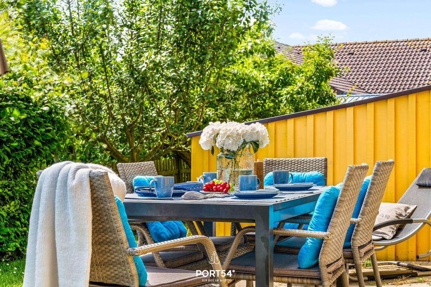An sonnigen Tagen lockt die Terrasse mit gemütlichen Sitzgelegenheiten, und der Holzkohlegrill sorgt abends für gesellige Barbecue-Momente.