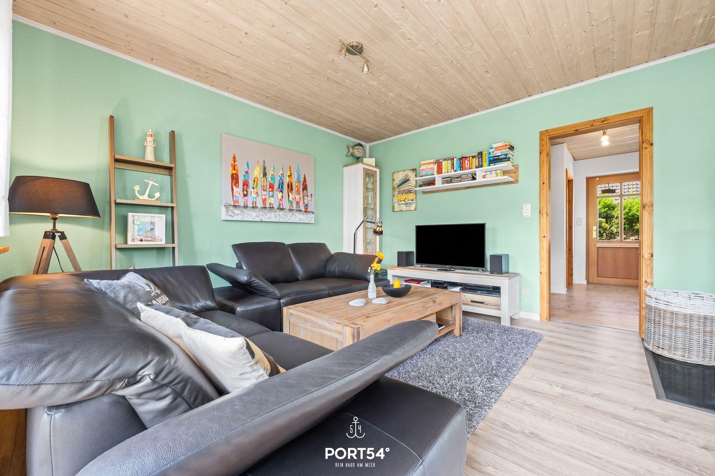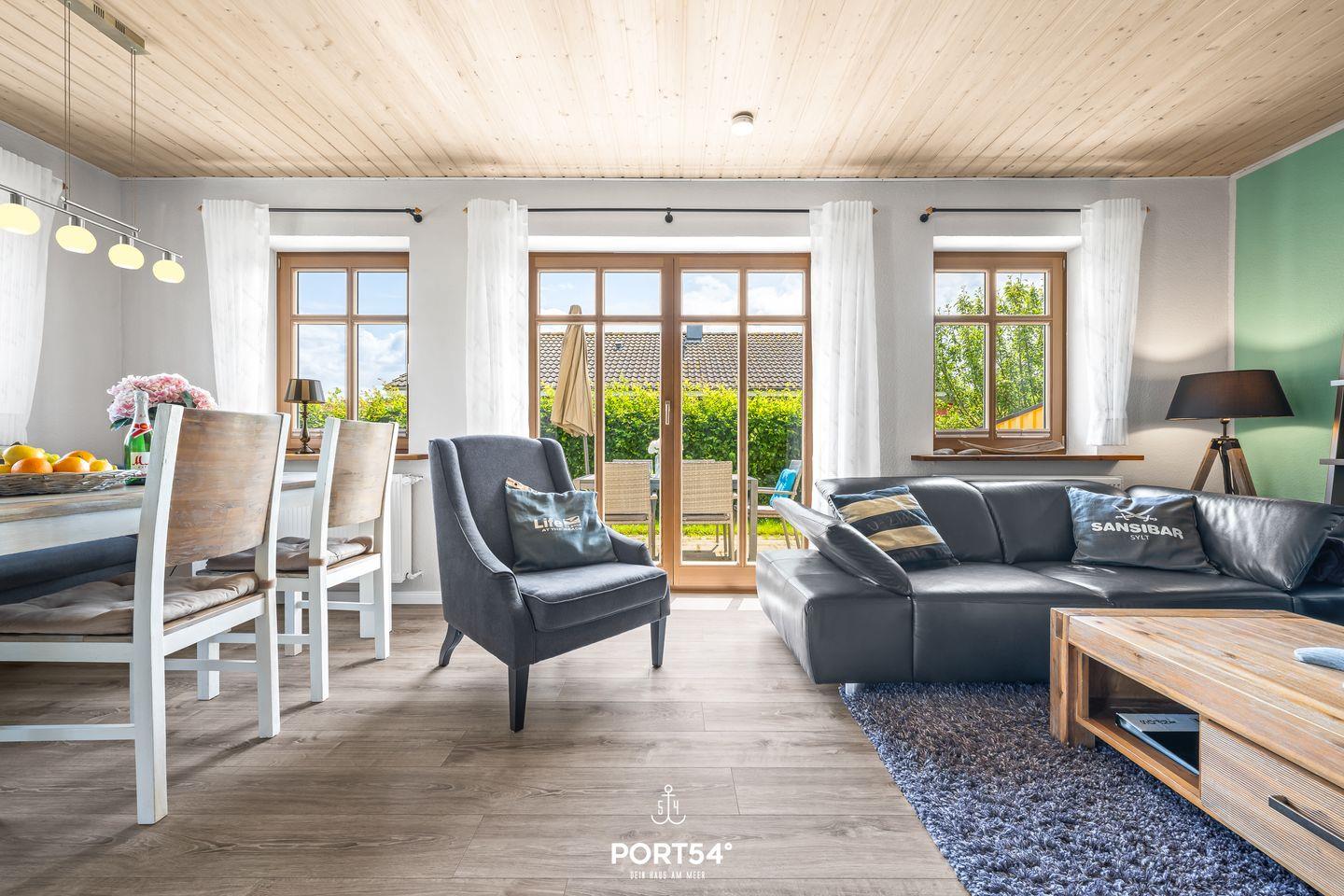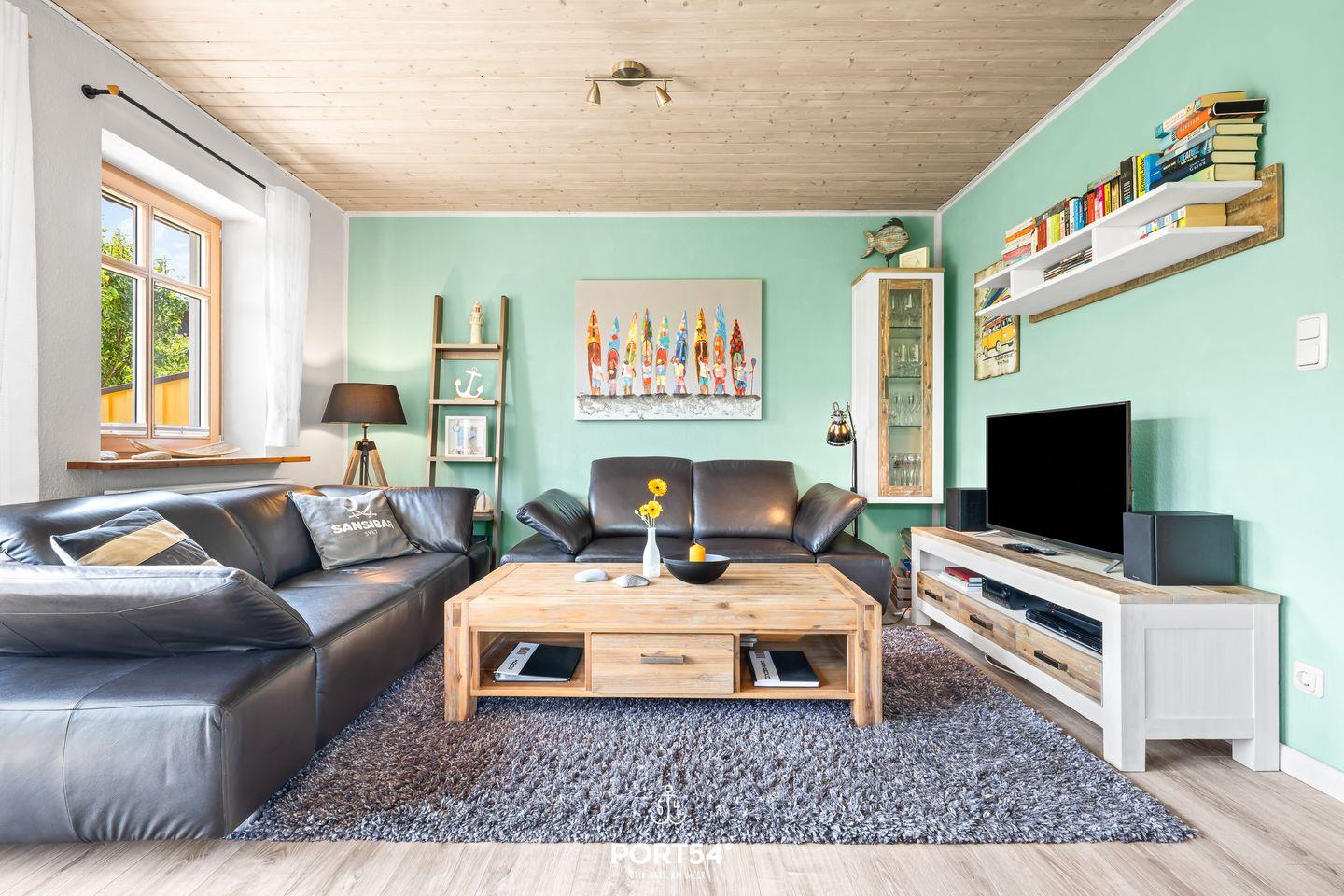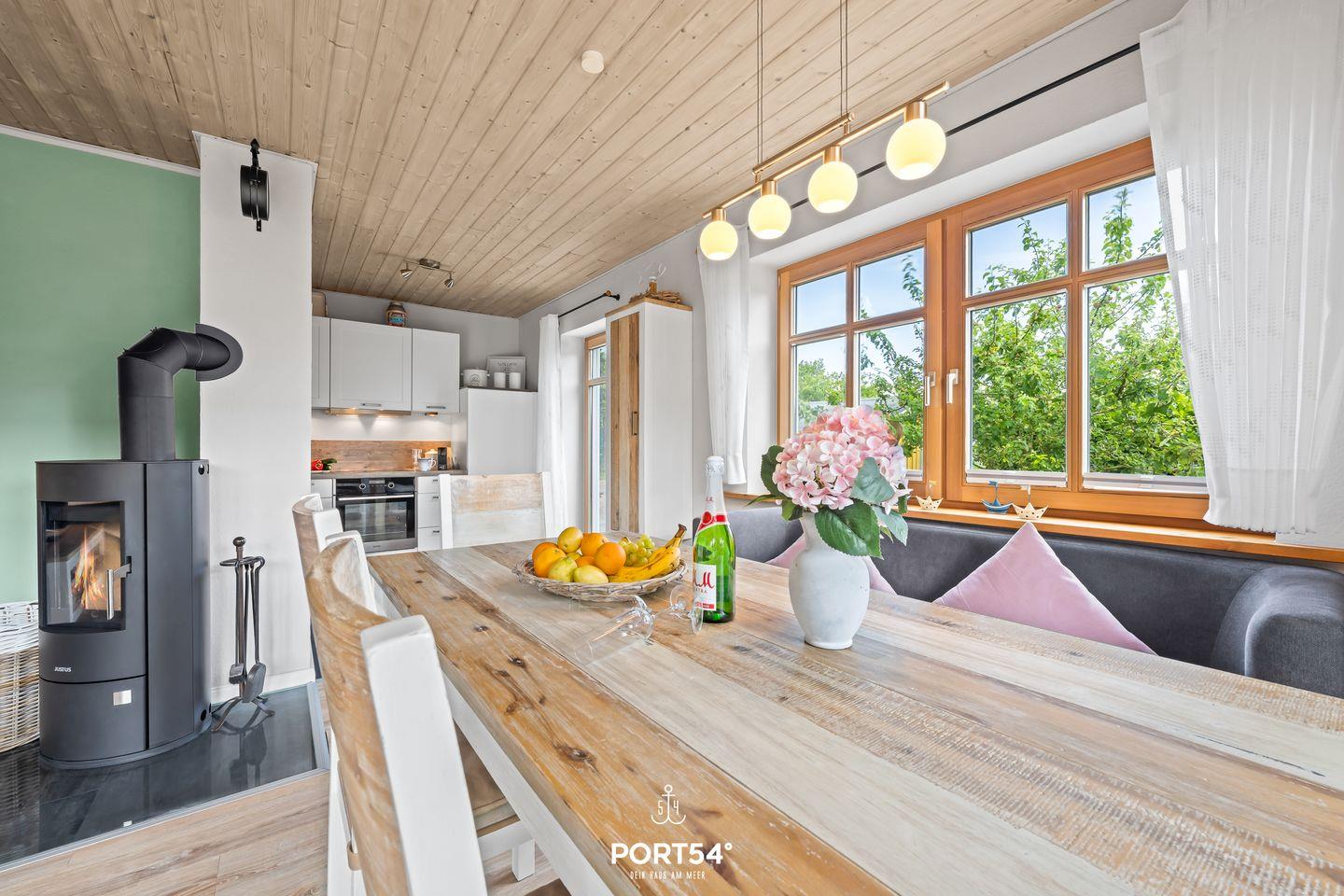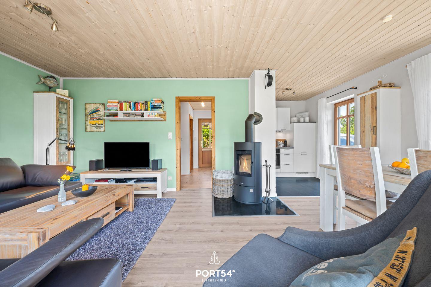 Das offene Wohnzimmer lädt mit seiner gemütlichen Sofagarnitur und einem bequemen Sessel zum Entspannen ein. Für Unterhaltung ist bestens gesorgt: Neben einer Auswahl an Büchern stehen Dir ein Flachbild-TV mit Blu-ray-Player und eine Musikanlage zur Verfügung. In den kälteren Monaten sorgt der Kaminofen für wohlige Wärme.