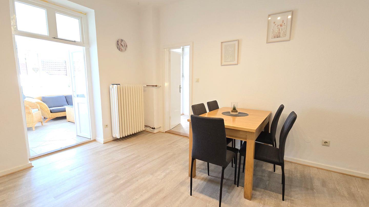 Der Wohnbereich bietet eine gemütliche Sitzecke mit Couch, Schaukelstuhl und Fernseher. Vom Doppelbettzimmer und der Küche aus gelangt man in den verglasten Wintergarten mit Blick in den Garten, der zusätzlichen Raum zum Verweilen bietet. Die Küche ist vollständig ausgestattet mit Herd, Backofen, Kühlschrank, Spülmaschine, Kaffeemaschine, Wasserkocher und Toaster. Ein Esstisch mit fünf Sitzplätzen befindet sich ebenfalls im Küchenbereich.