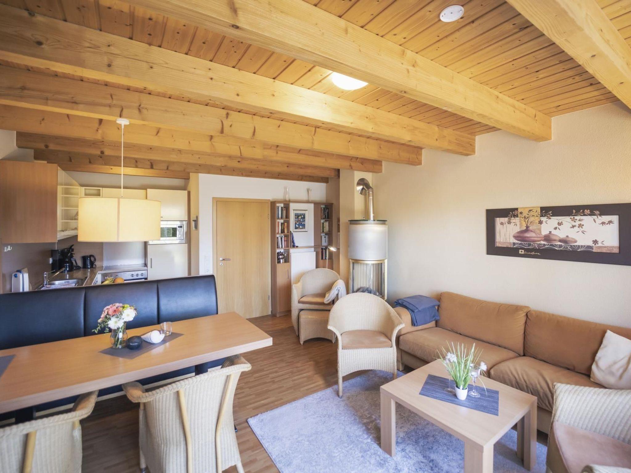 gemütliches Wohnzimmer mit einem Gas-Kaminofen (Sie regulieren die Flamme per Fernbedienung), hinter dem Sie am Abend gar nicht mehr hervorkommen möchten. Sofa, bequeme Korb-Sessel und kuschelige Beleuchtung machen eine stimmungsvolle und erholsame Ferienatmosphäre. Ein großer Plasma-Farbfernseher (Satellit), DVD-Player und eine Musikanlage vervollständigen die Urlaubsqualität. Eine kleine ausgesuchte Bibliothek (einschl. Leselampe) für Jung und Alt und verschiedene Spiele für ein fröhliches Miteinander stehen für Sie zur Verfügung.